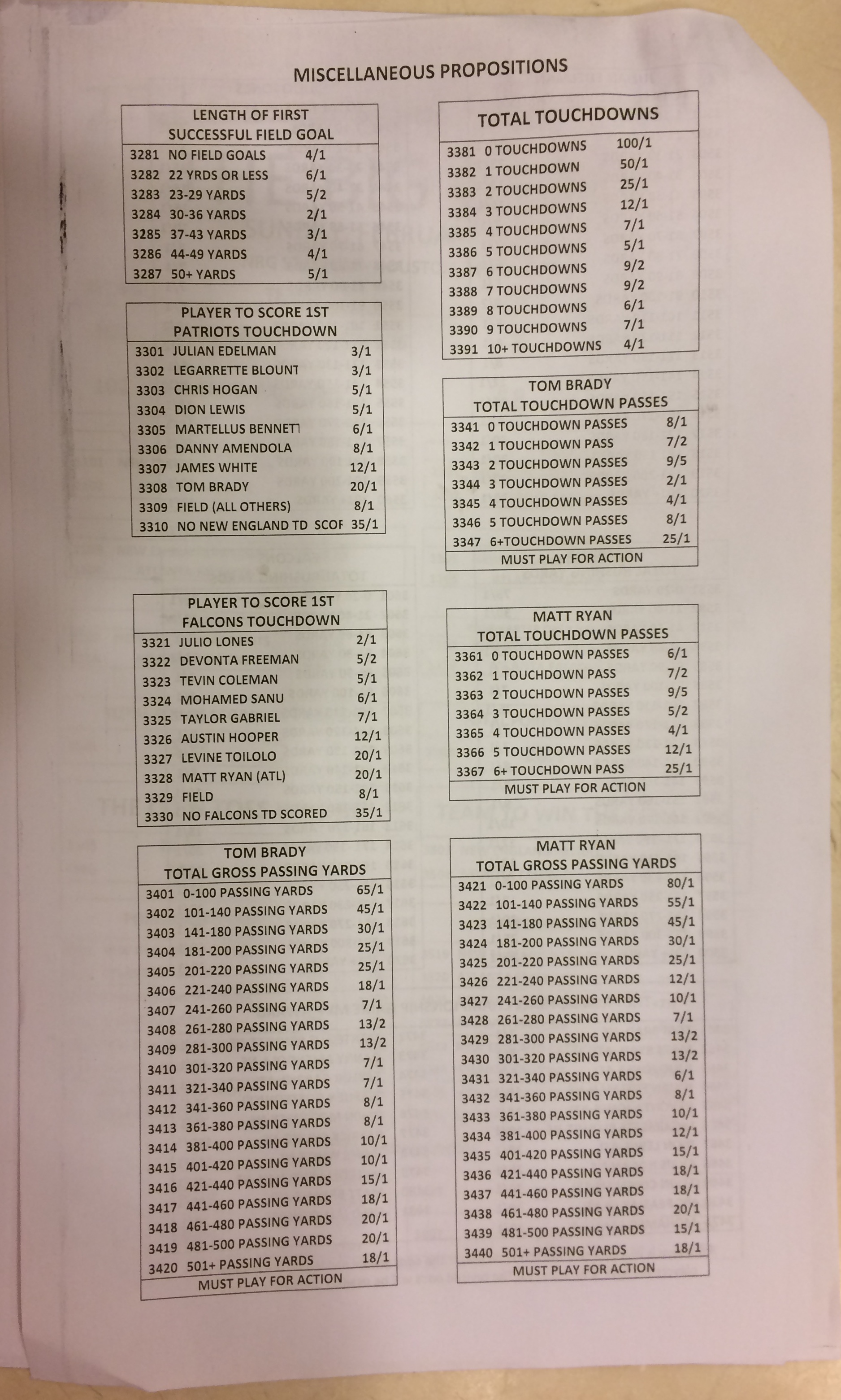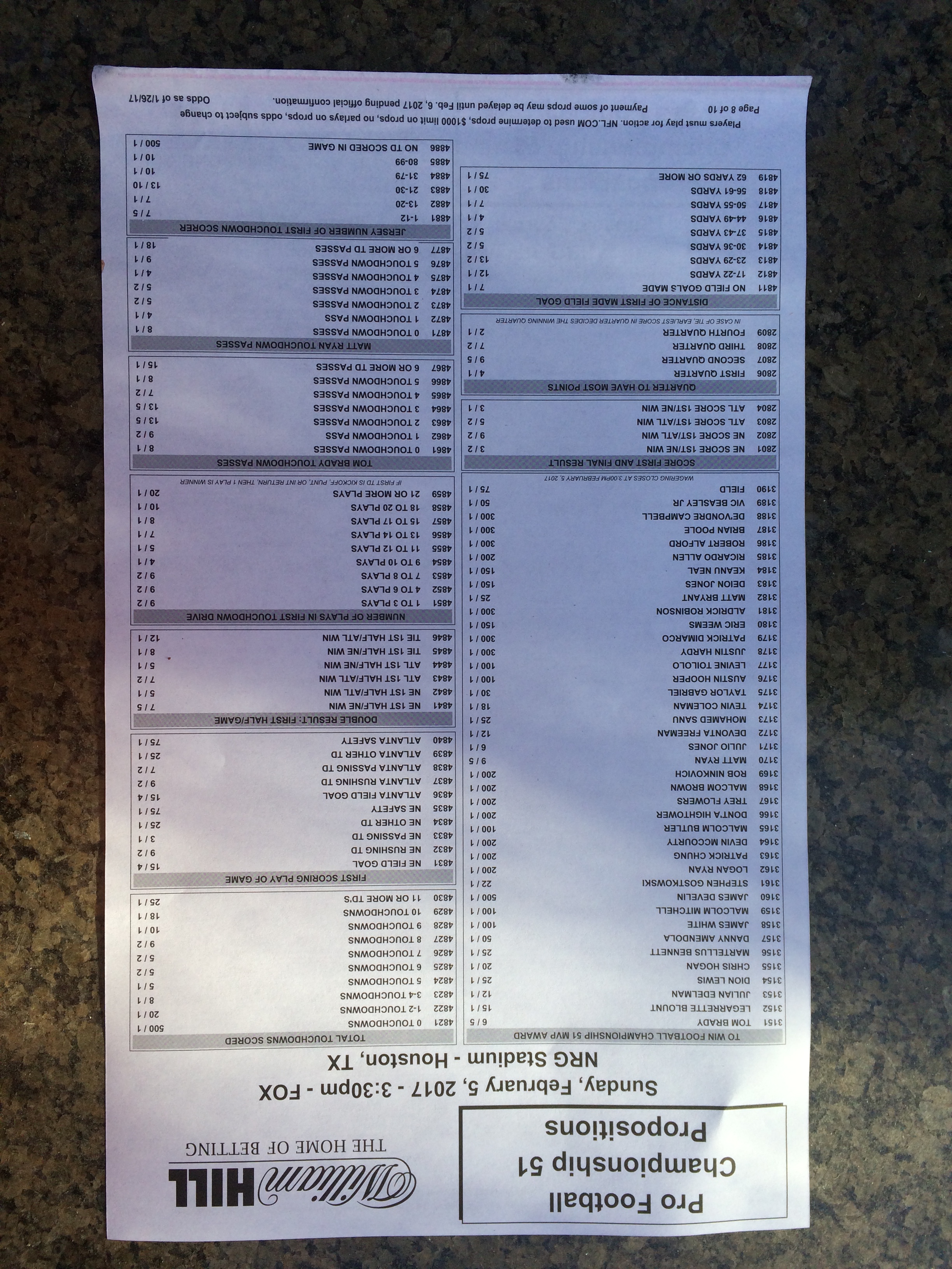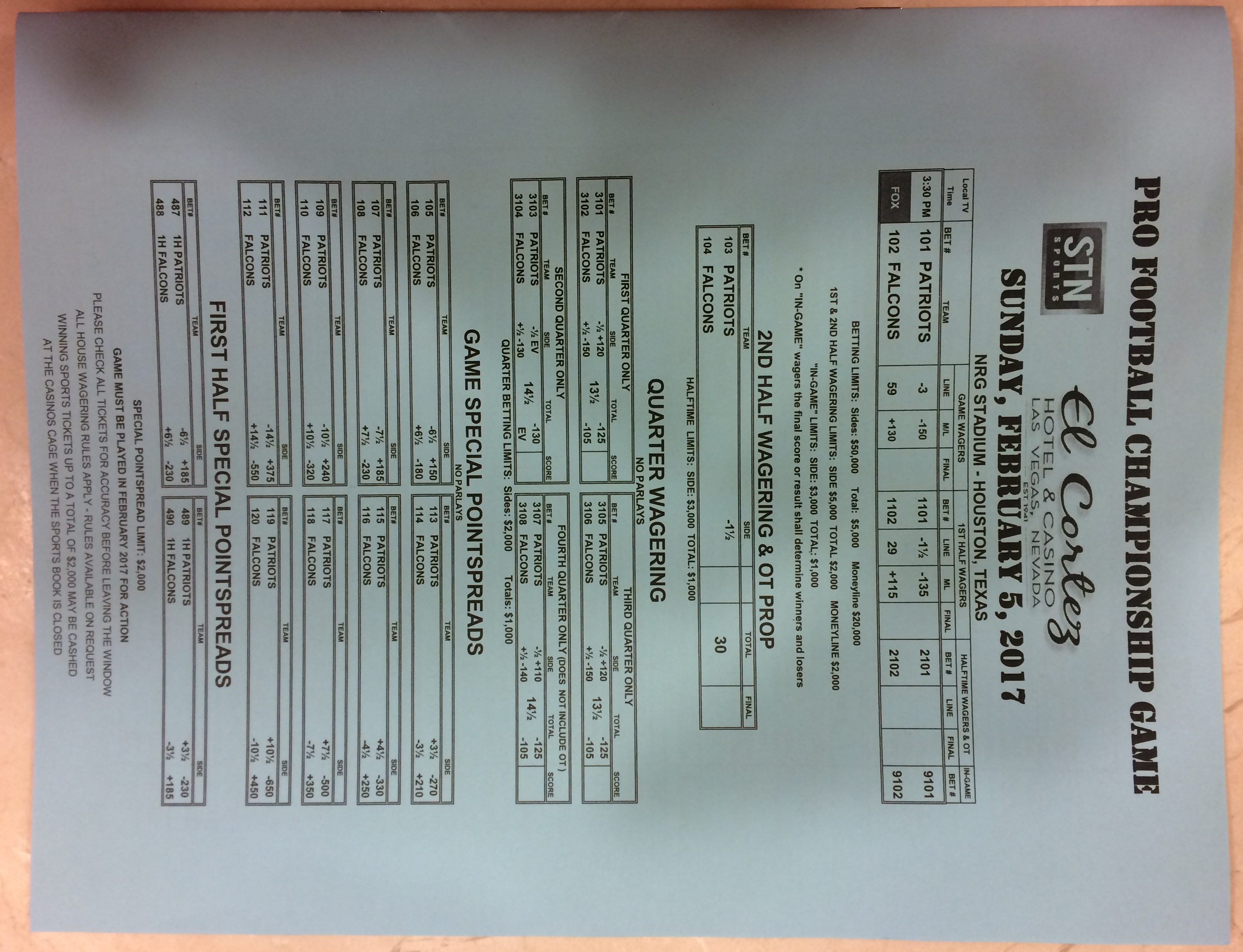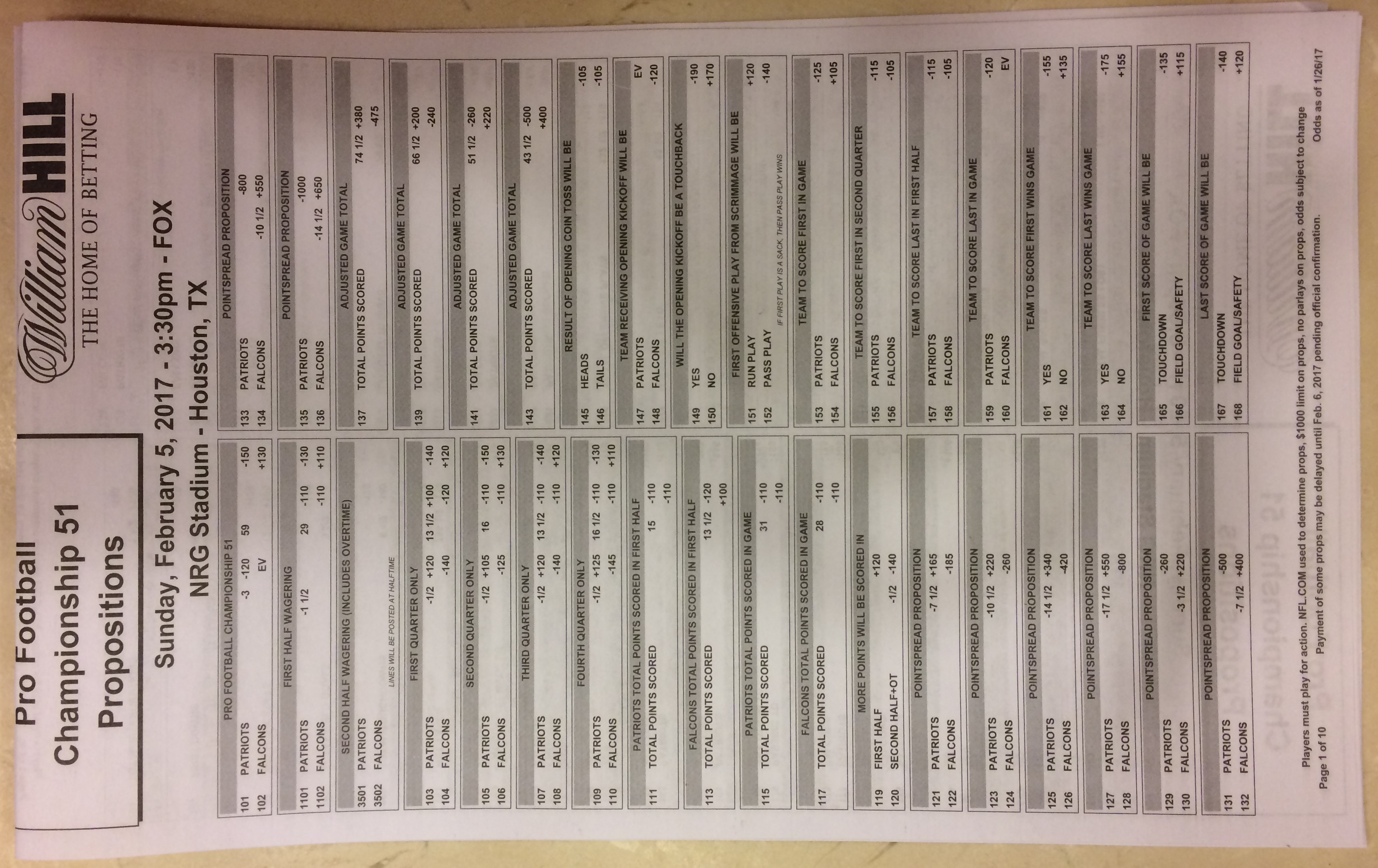 Хотя в этом году я не буду давать вам никаких прогнозов, вы хотя бы можете посмотреть, что есть в наличии. Вот несколько фотографий списков ставок на Супербоул 51. В дни, предшествующие игре, должно появиться больше вариантов.