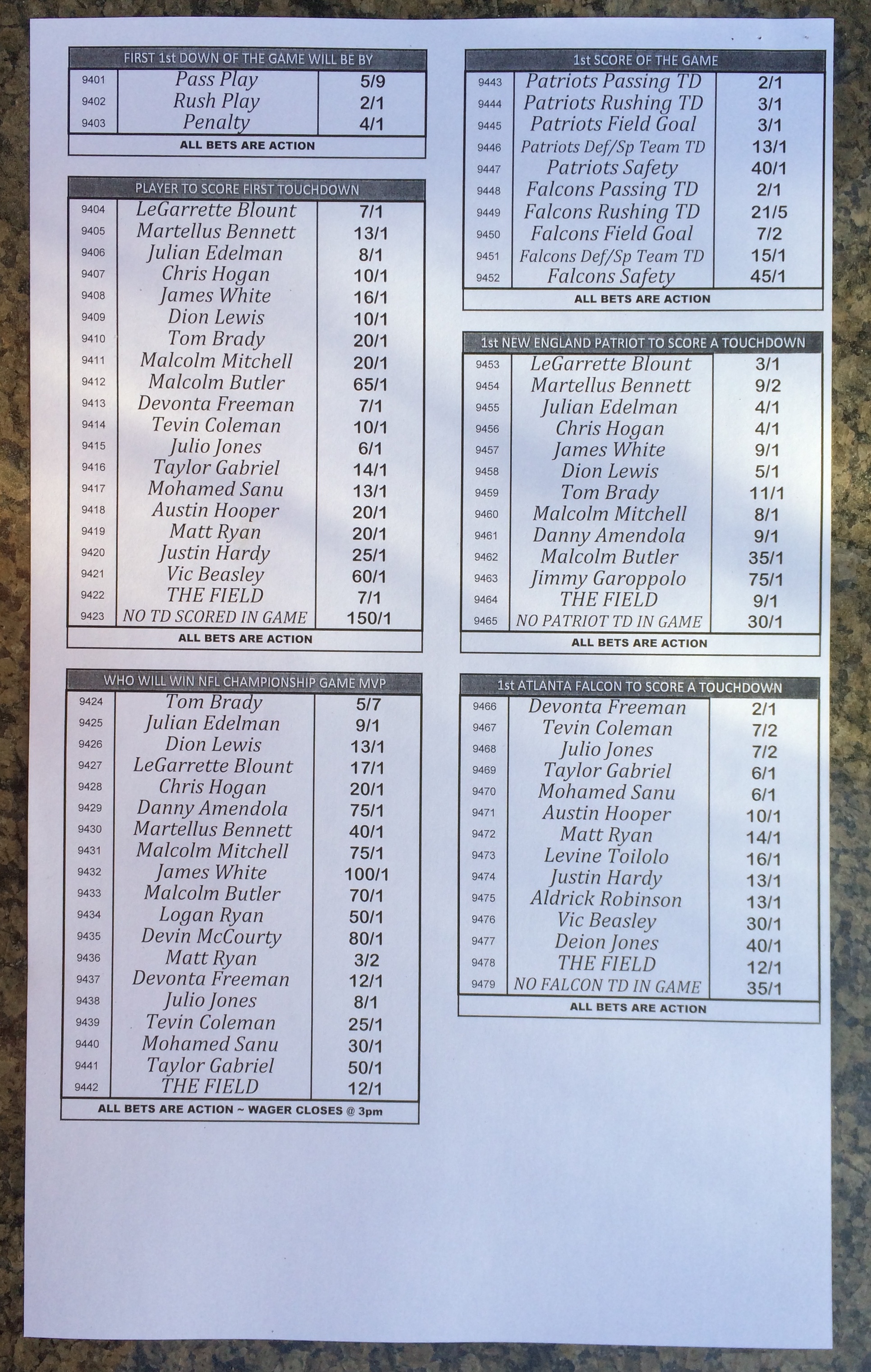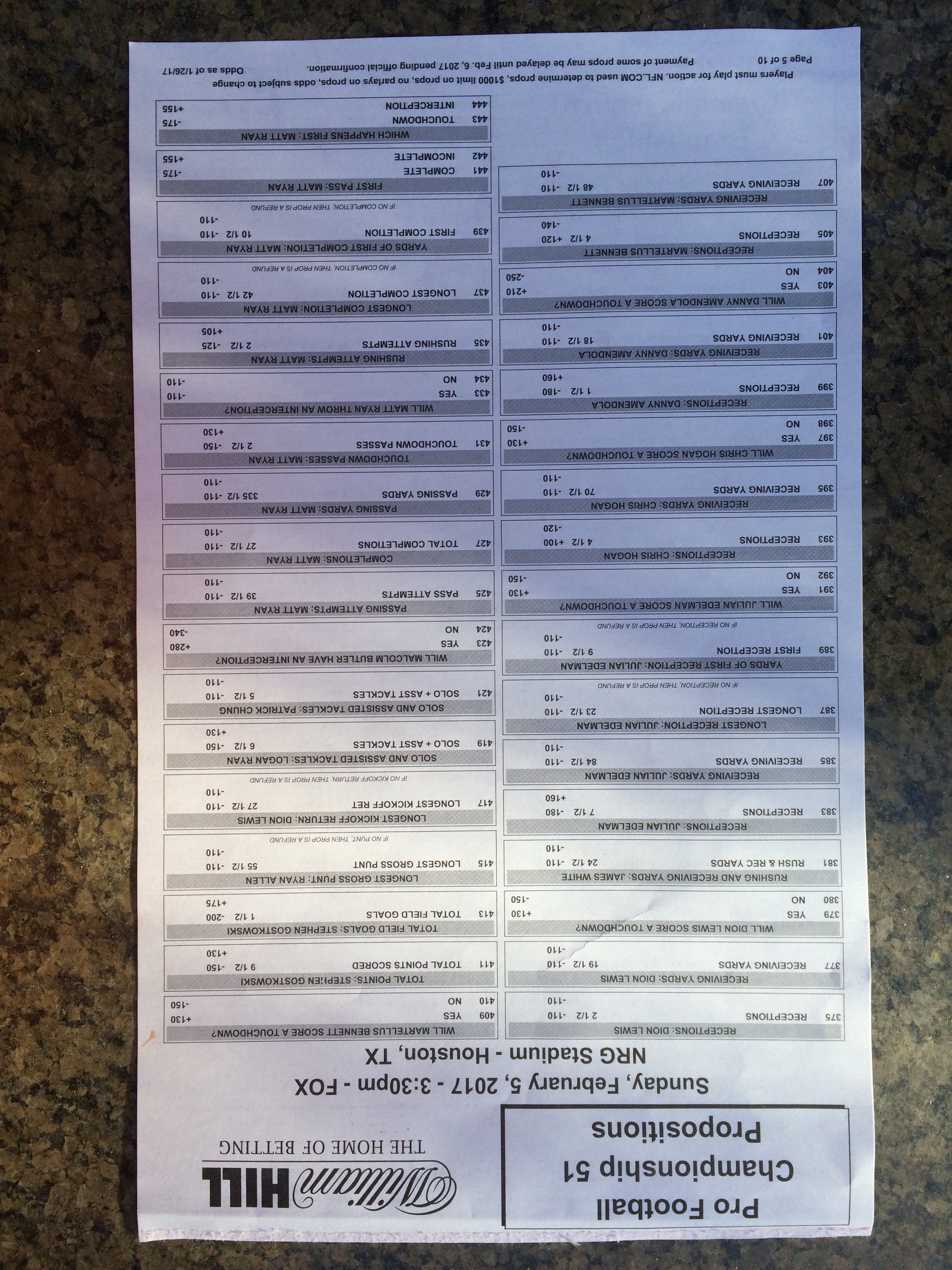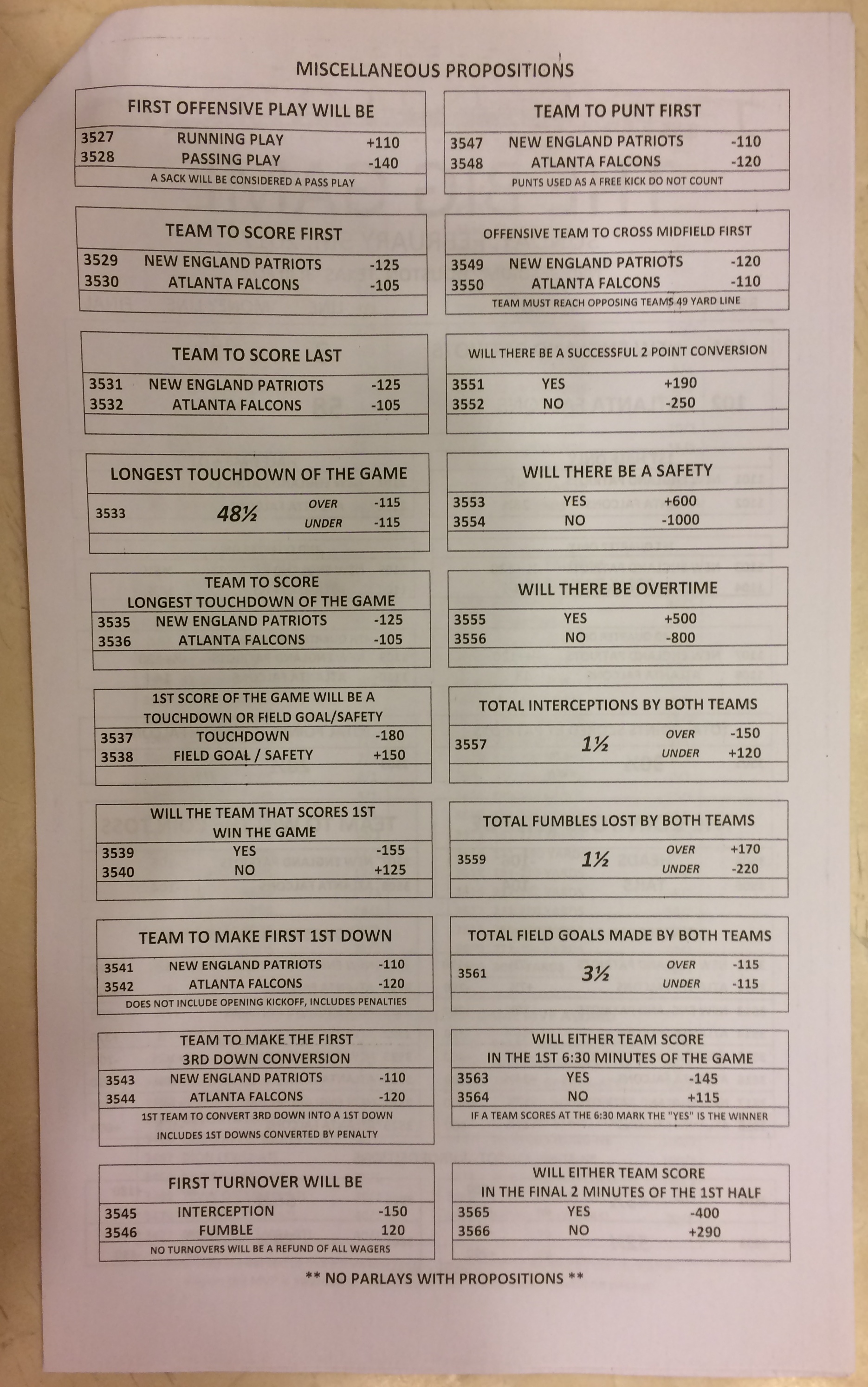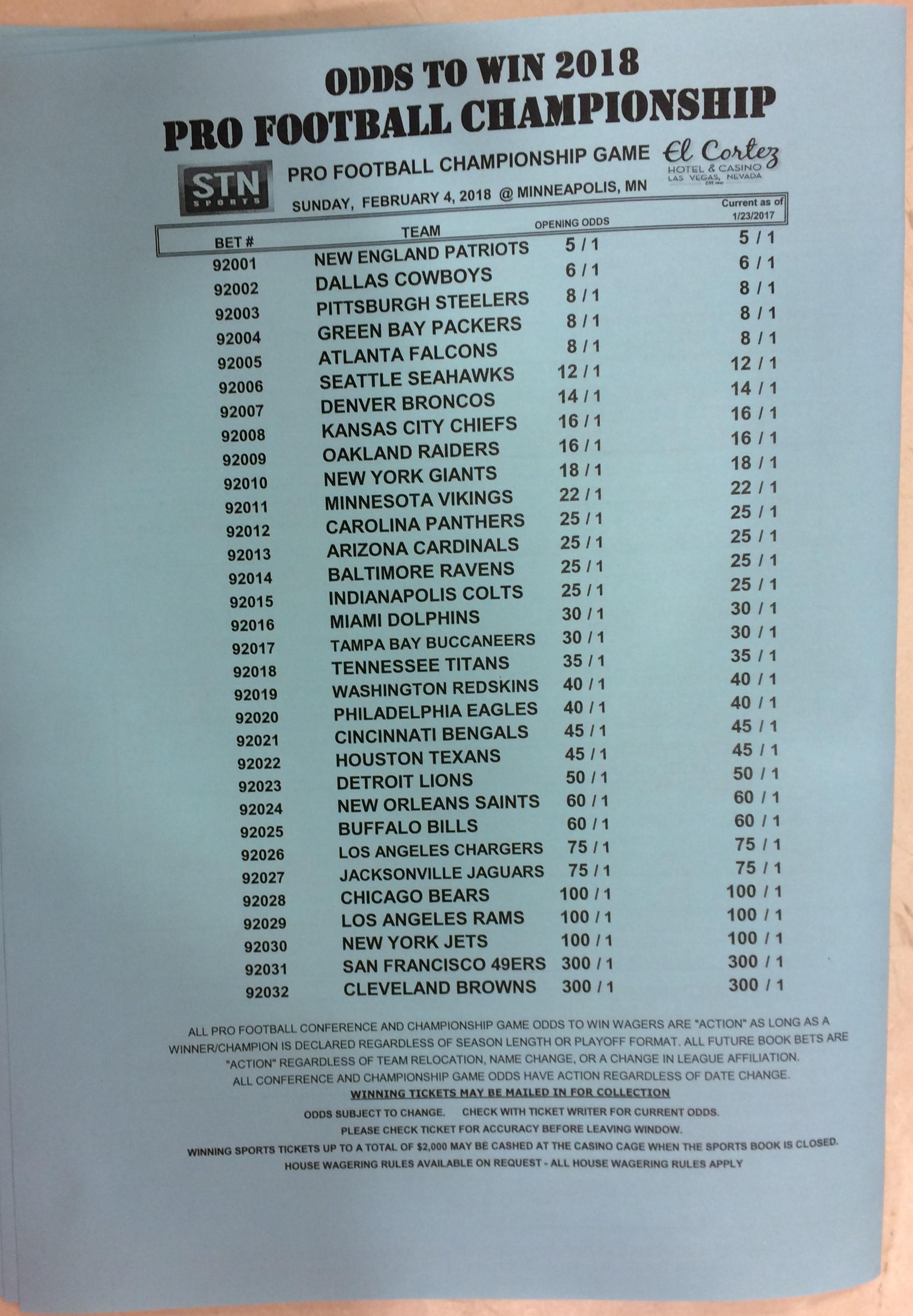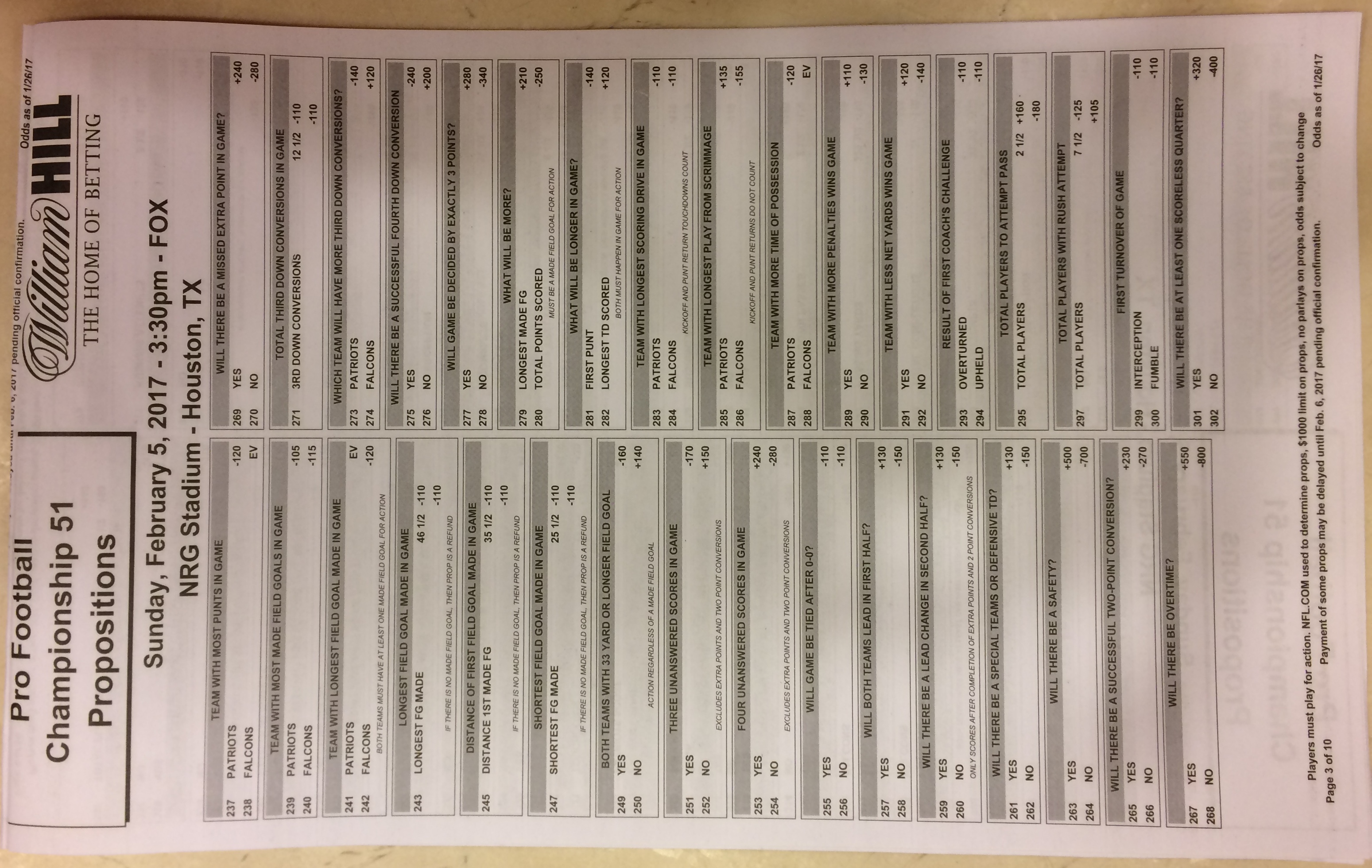 Хотя в этом году я не буду давать вам никаких прогнозов, вы хотя бы можете посмотреть, что есть в наличии. Вот несколько фотографий списков ставок на Супербоул 51. В дни, предшествующие игре, должно появиться больше вариантов.