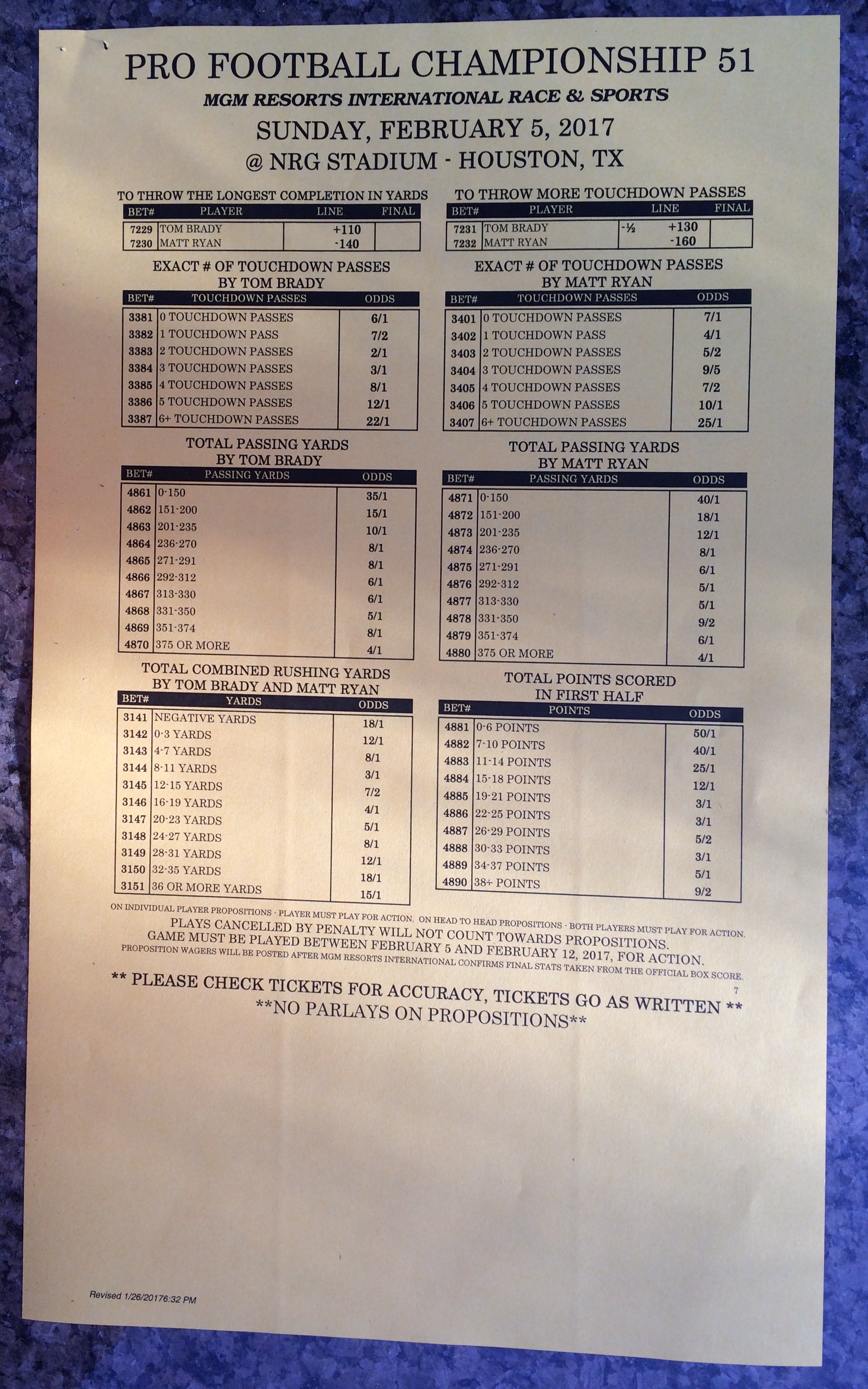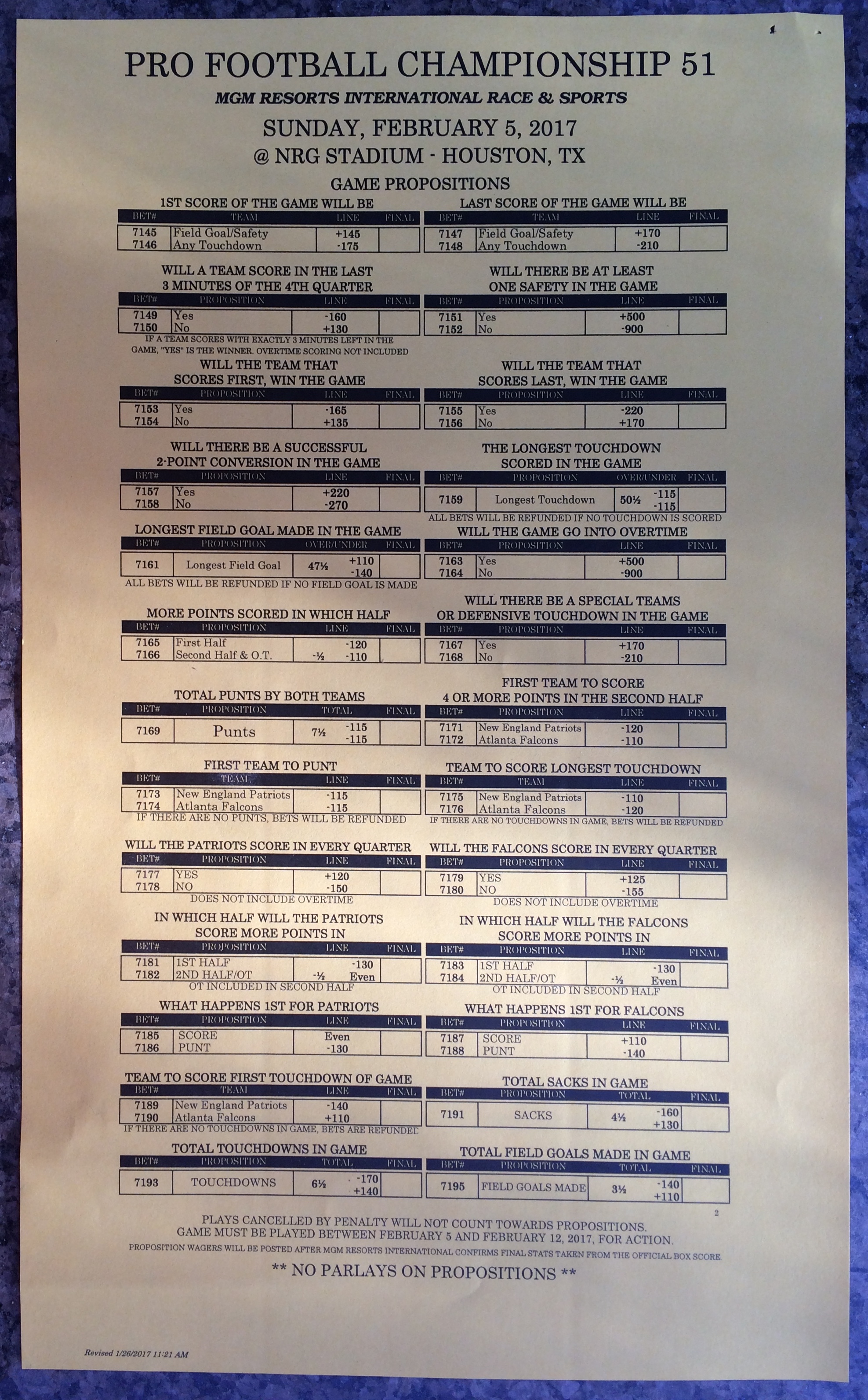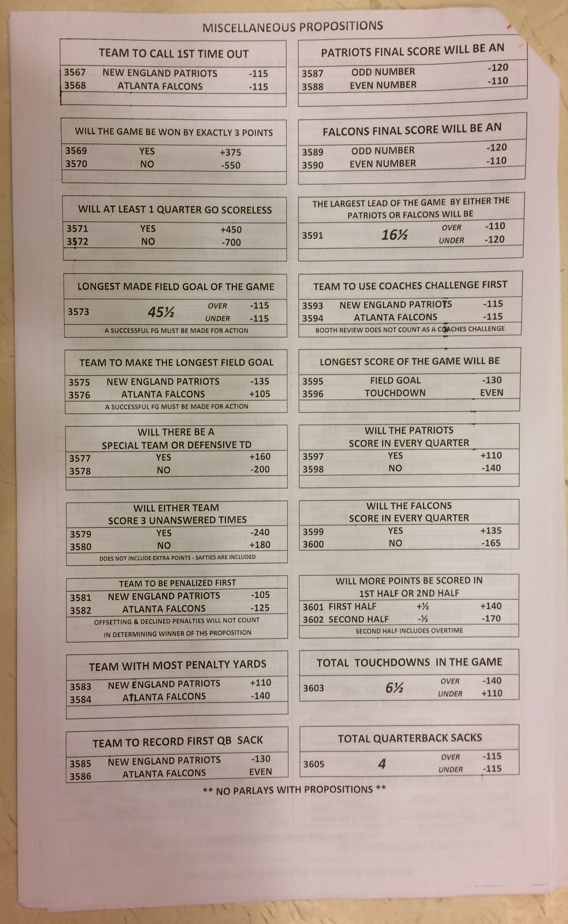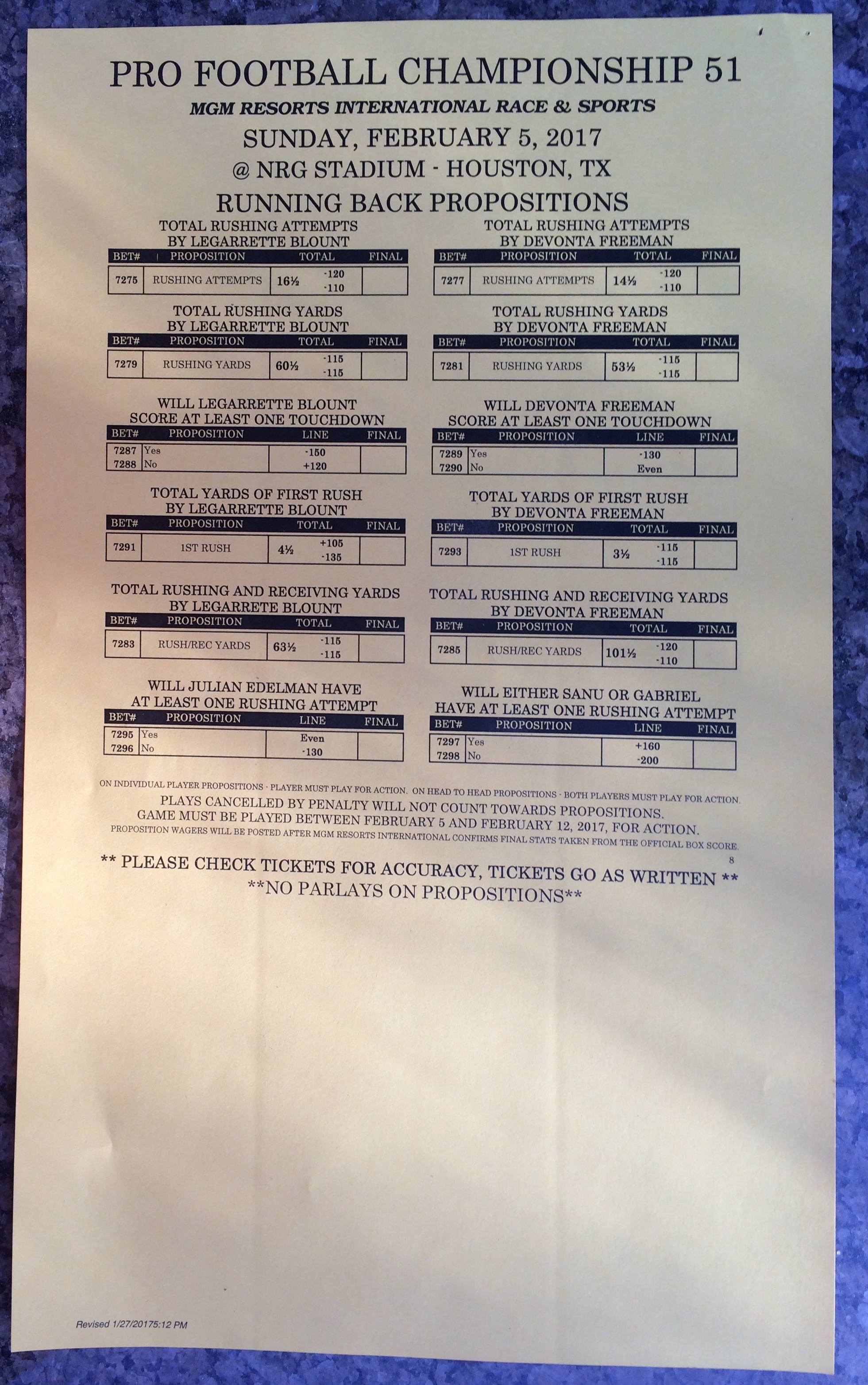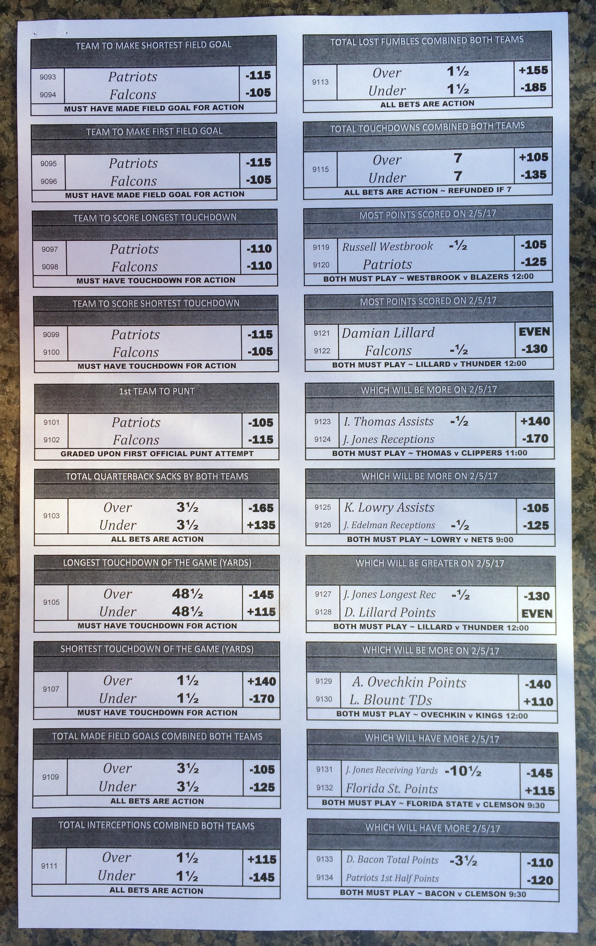 Хотя в этом году я не буду давать вам никаких прогнозов, вы хотя бы можете посмотреть, что есть в наличии. Вот несколько фотографий списков ставок на Супербоул 51. В дни, предшествующие игре, должно появиться больше вариантов.