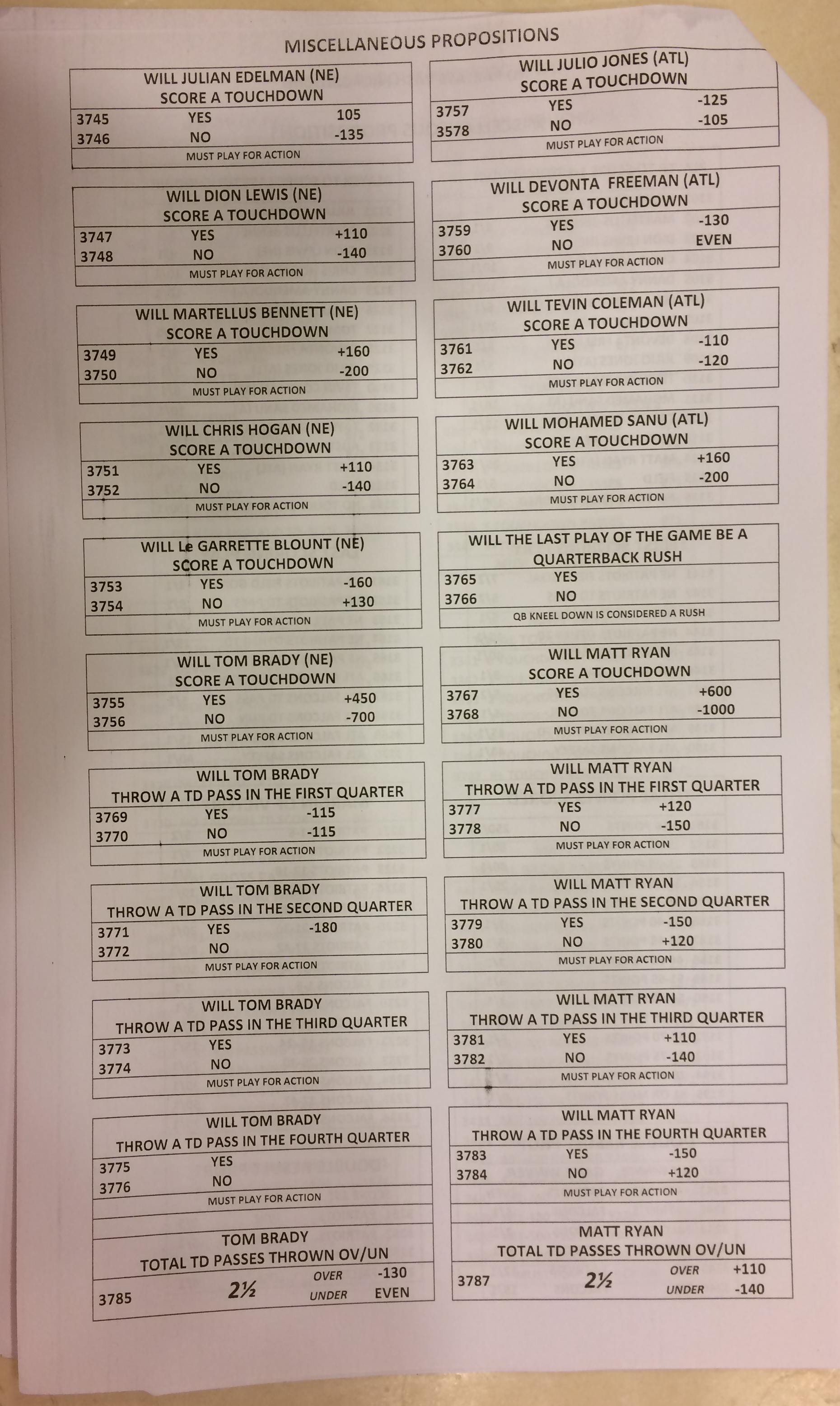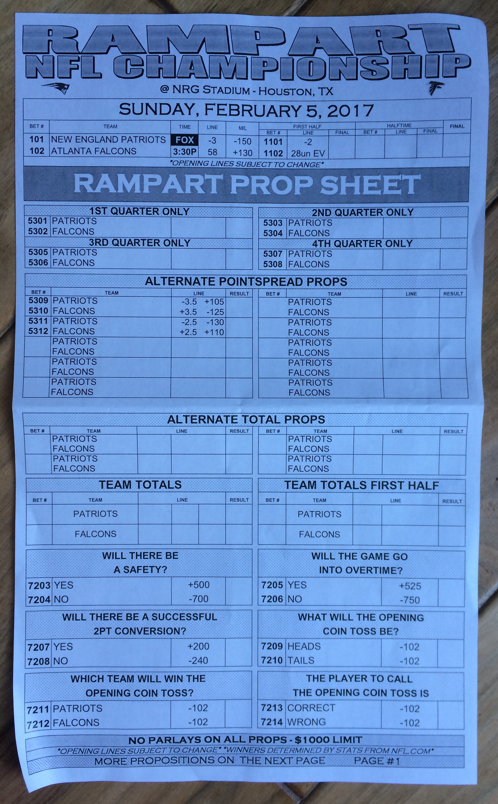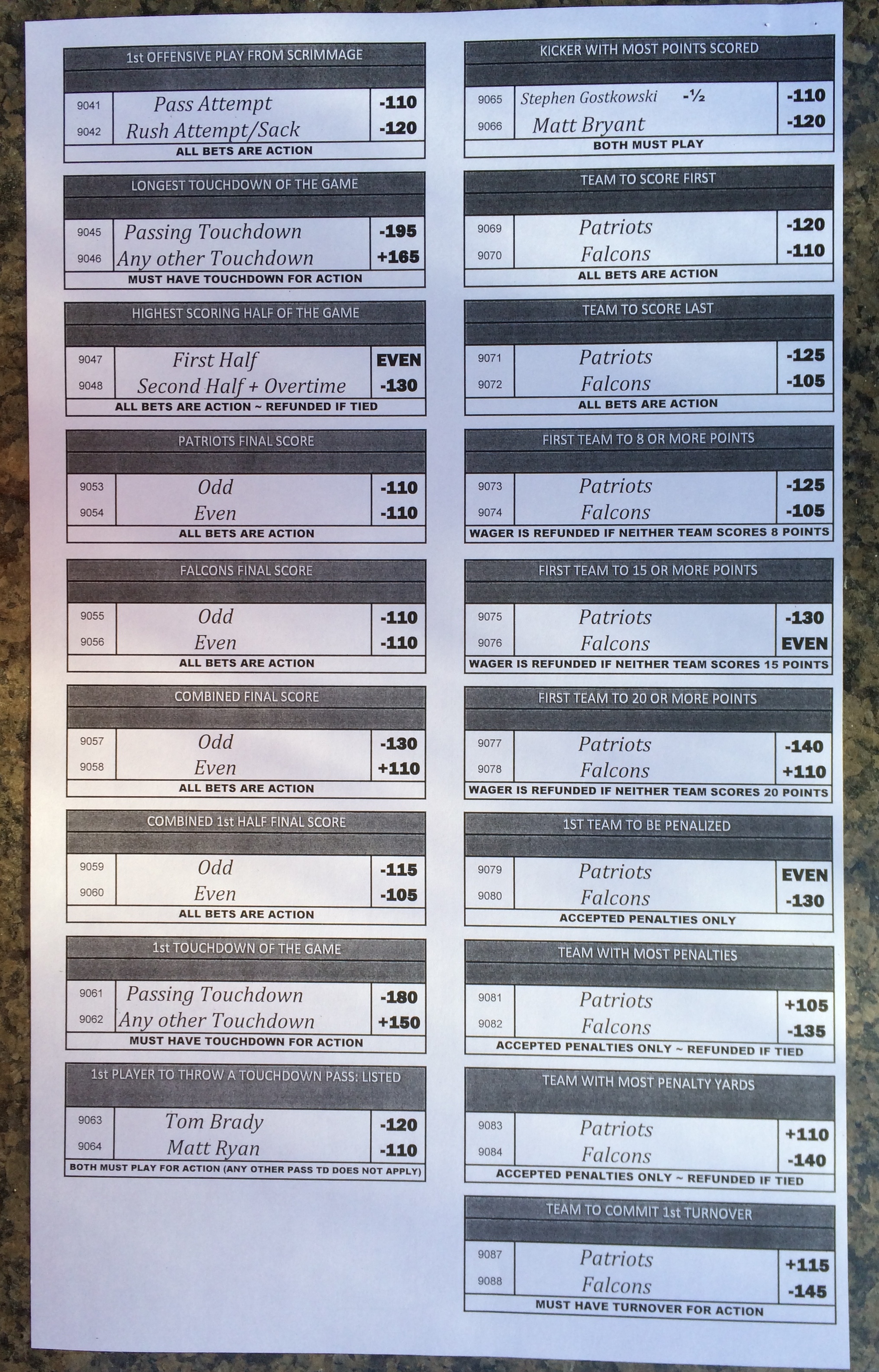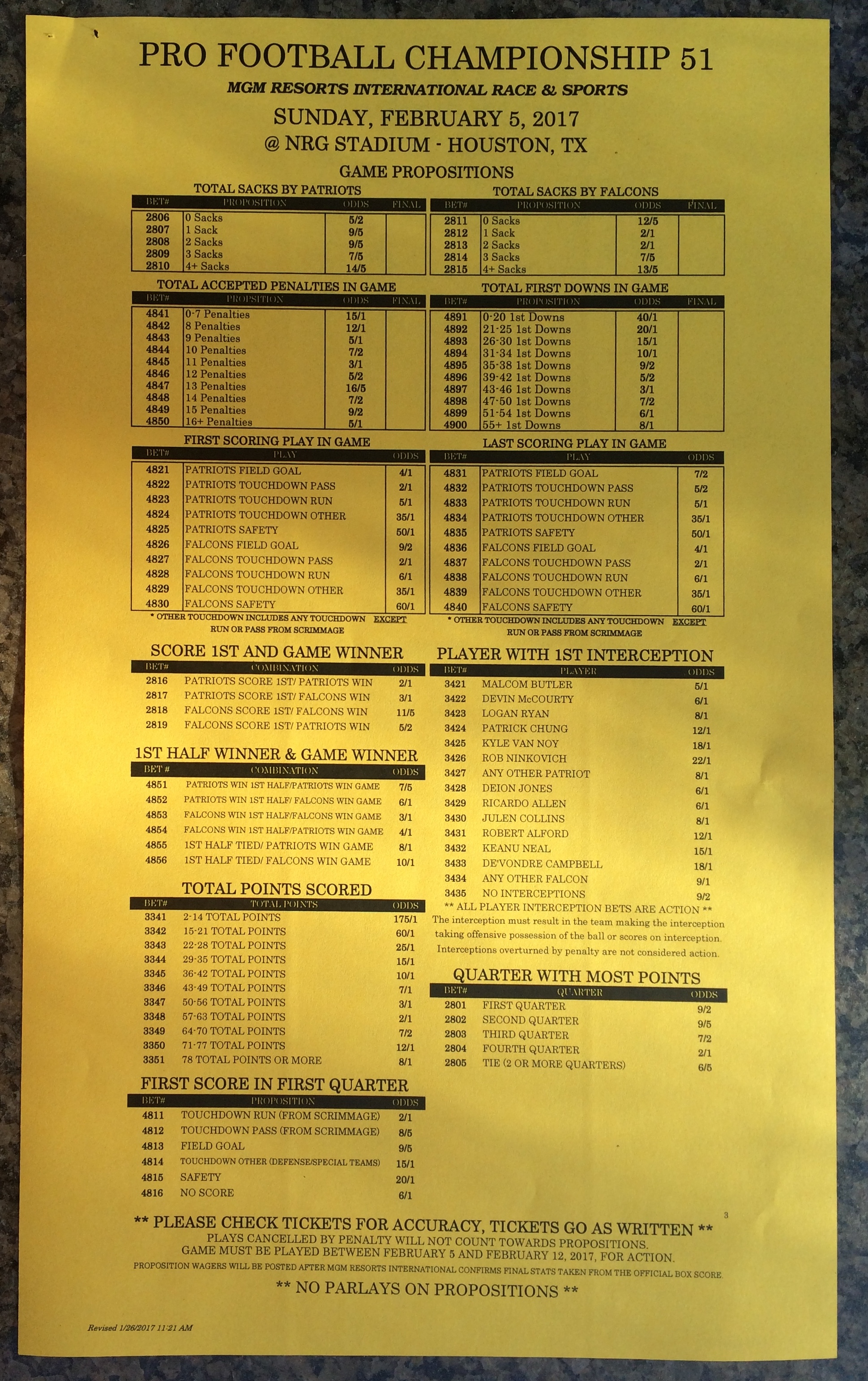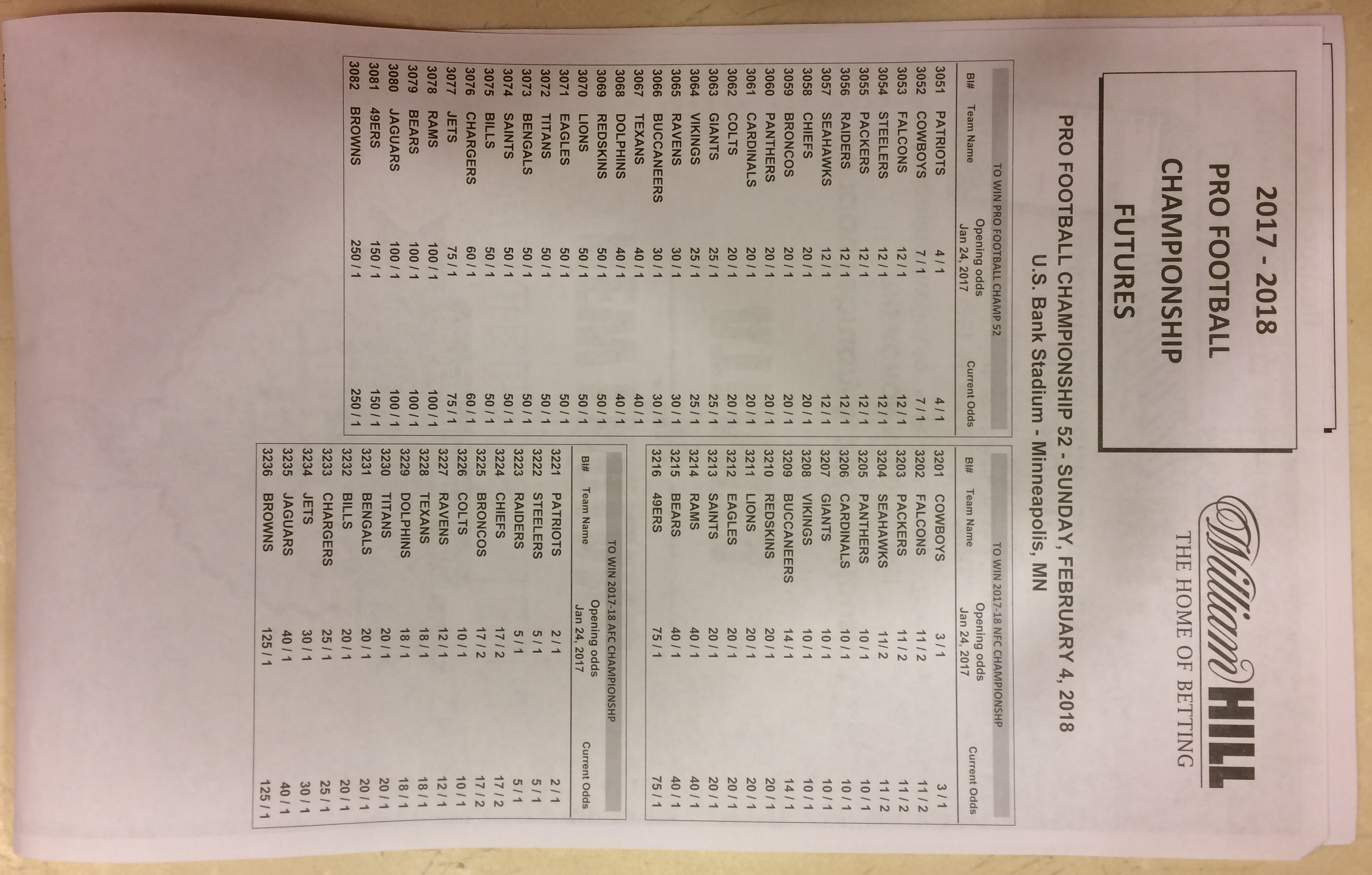 Хотя в этом году я не буду давать вам никаких прогнозов, вы хотя бы можете посмотреть, что есть в наличии. Вот несколько фотографий списков ставок на Супербоул 51. В дни, предшествующие игре, должно появиться больше вариантов.