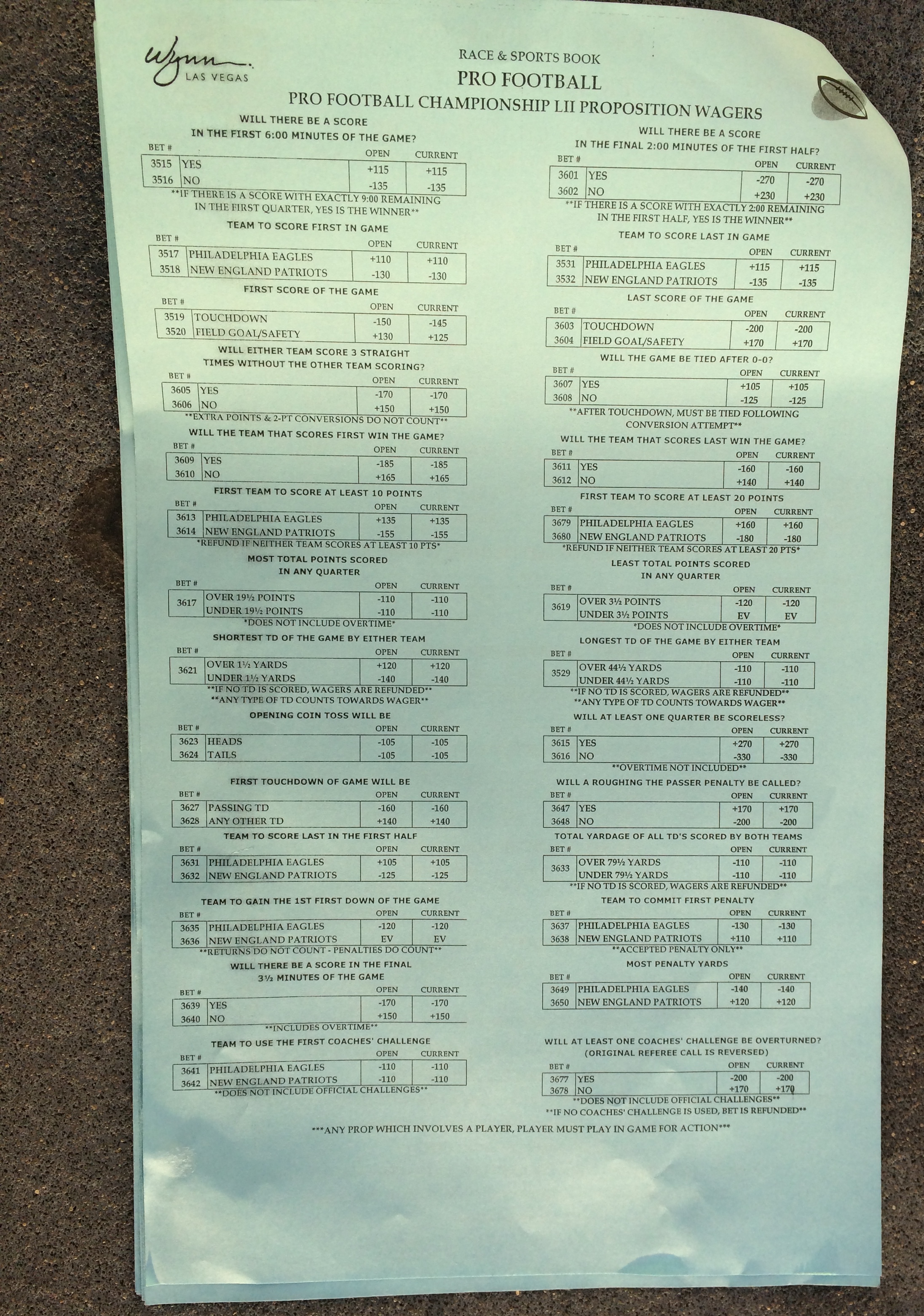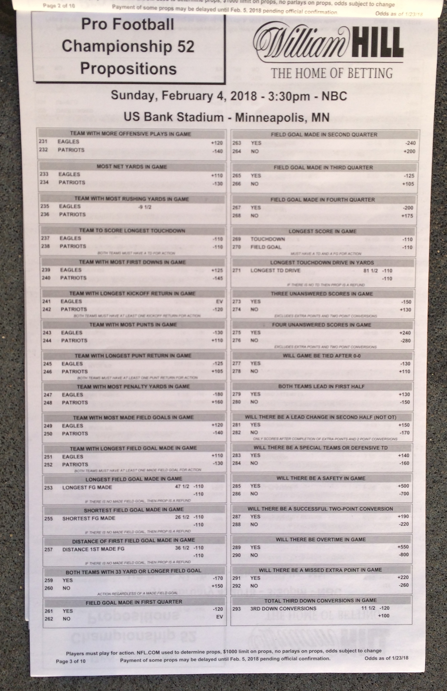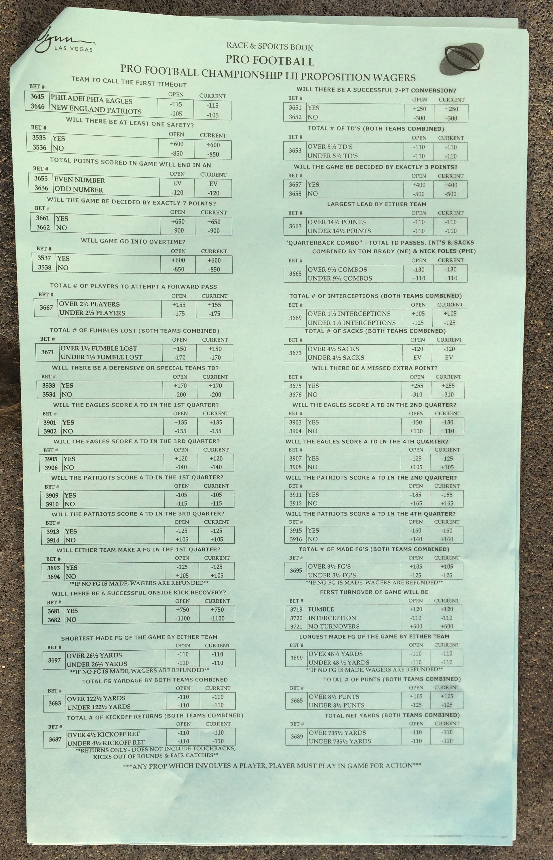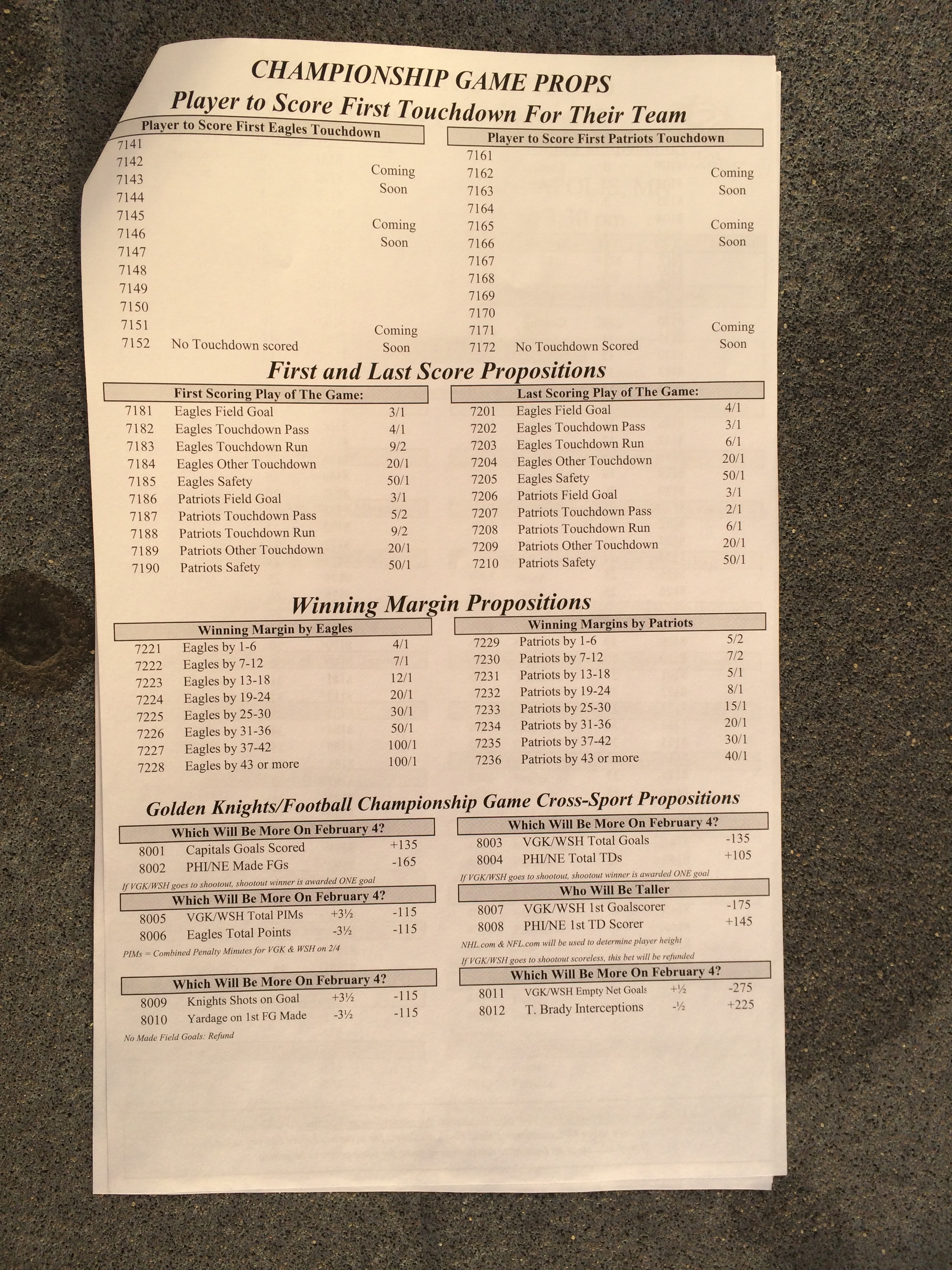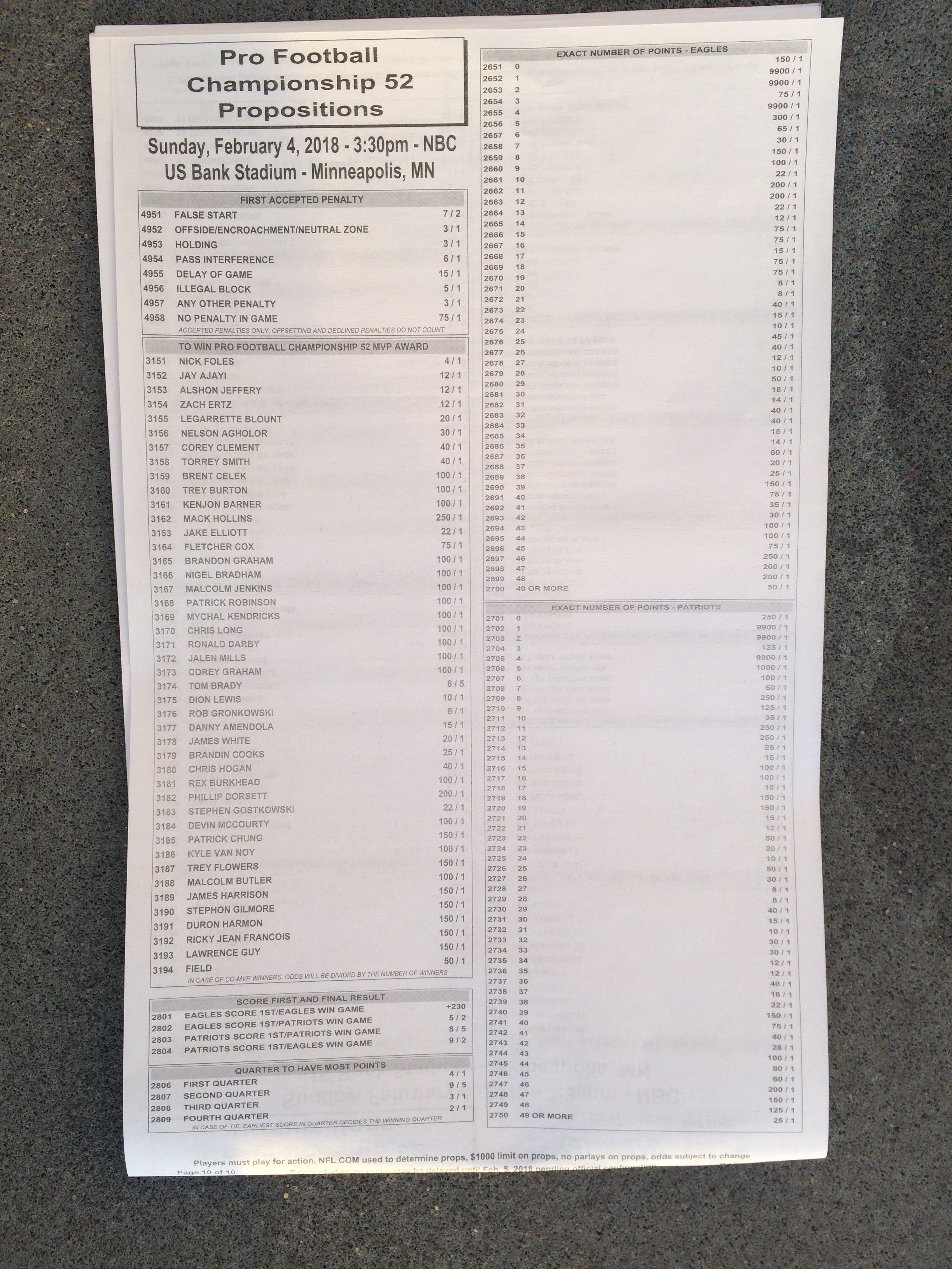 Ниже представлены фотографии всех страниц с ставками на исходы матчей в нескольких букмекерских конторах Лас-Вегаса. Эти листы были собраны 27 января 2018 года, за восемь дней до игры.