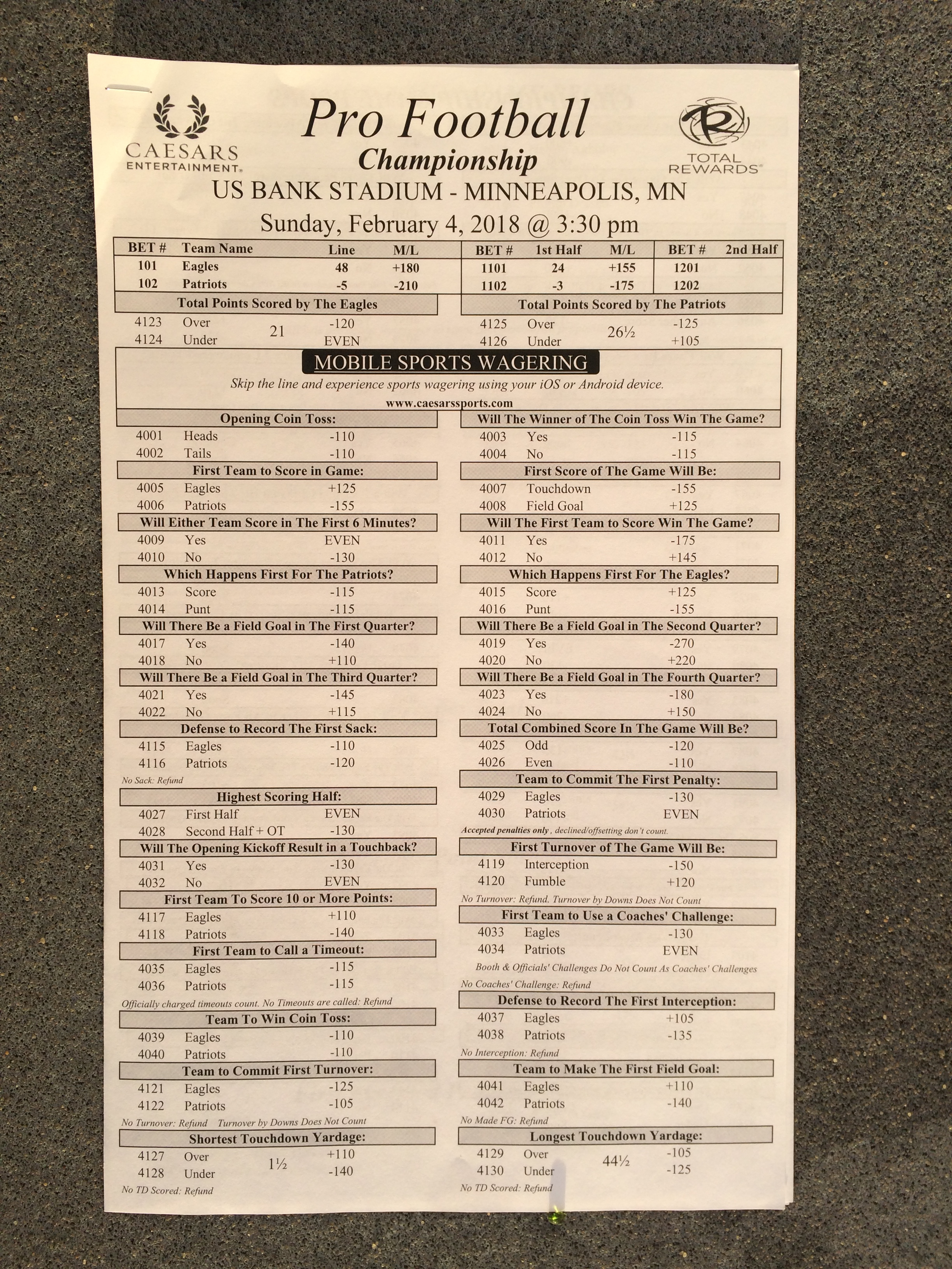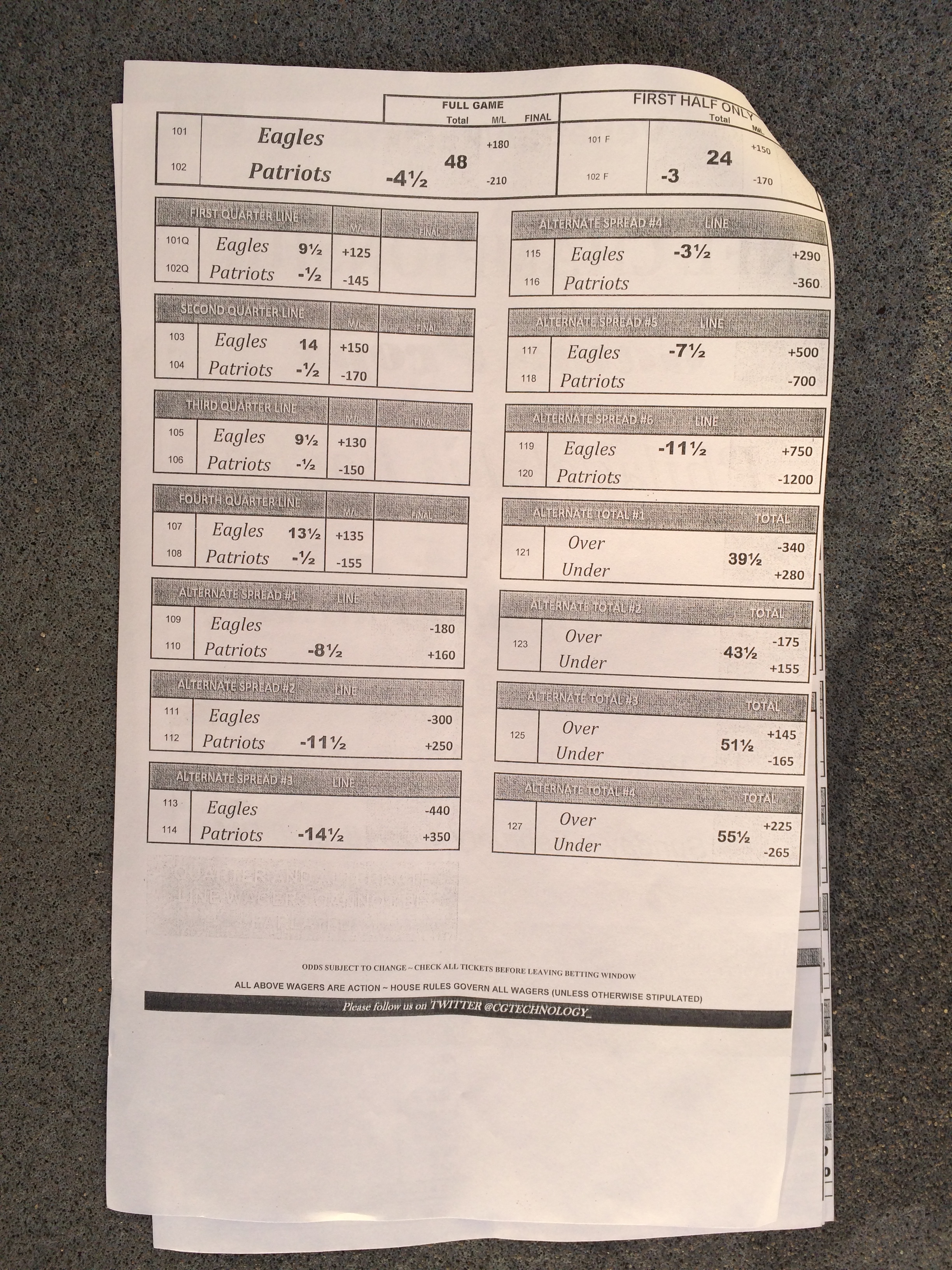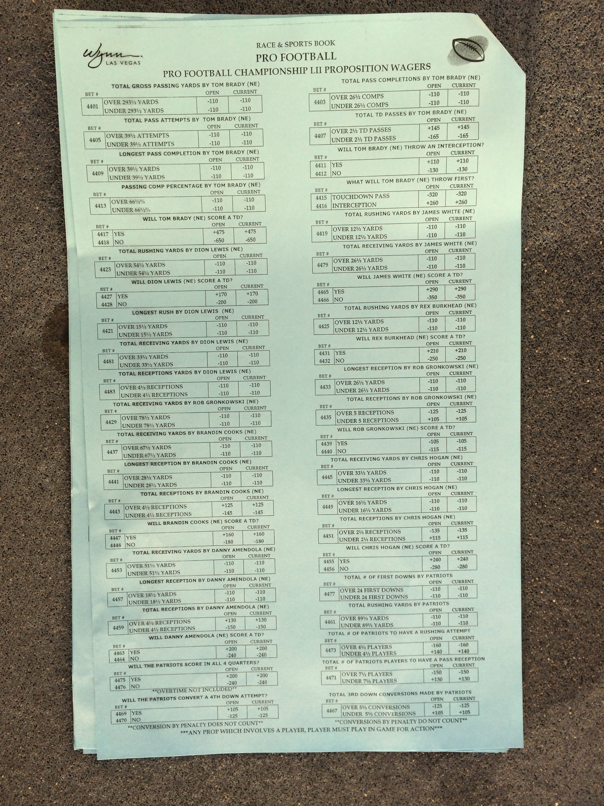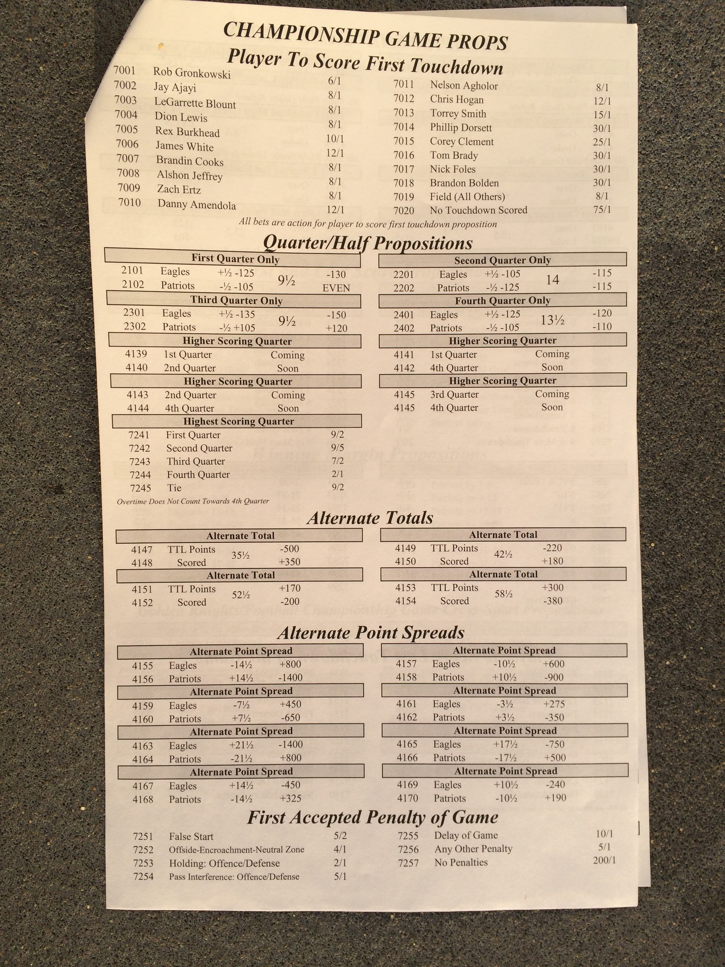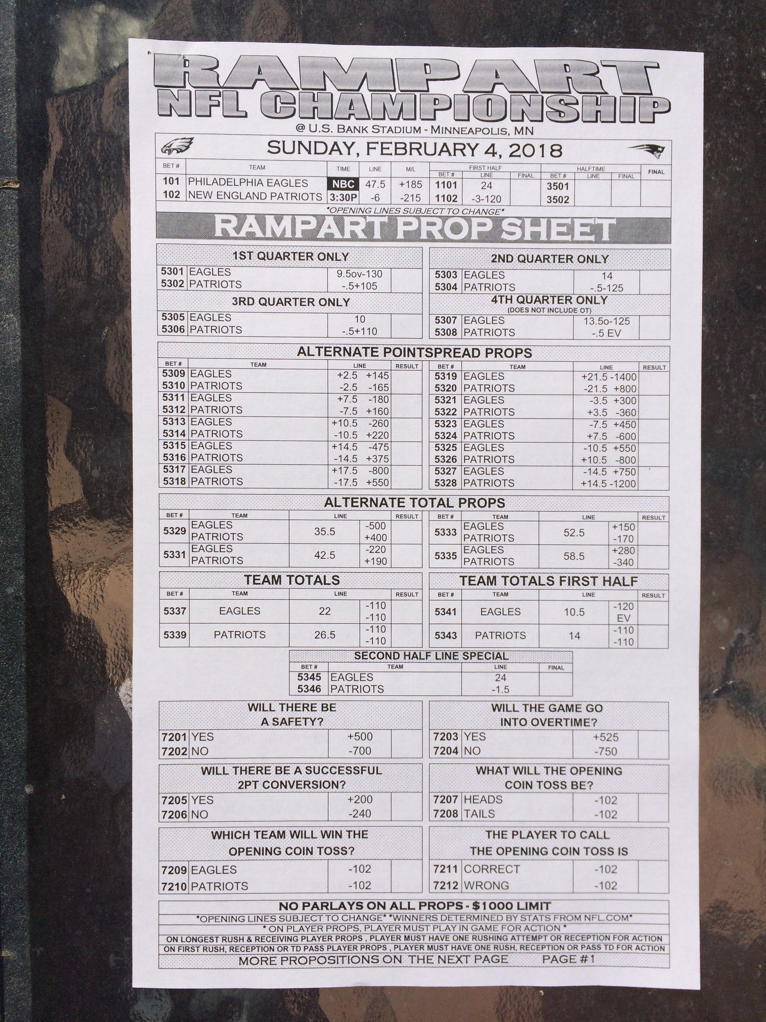 Ниже представлены фотографии всех страниц с ставками на исходы матчей в нескольких букмекерских конторах Лас-Вегаса. Эти листы были собраны 27 января 2018 года, за восемь дней до игры.