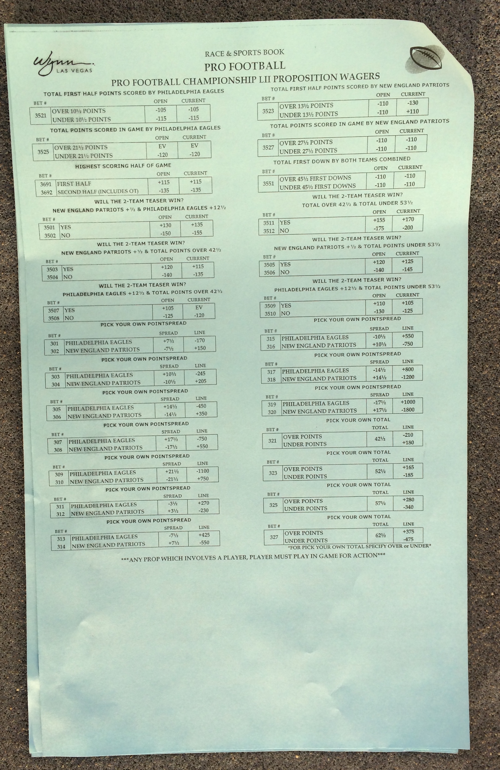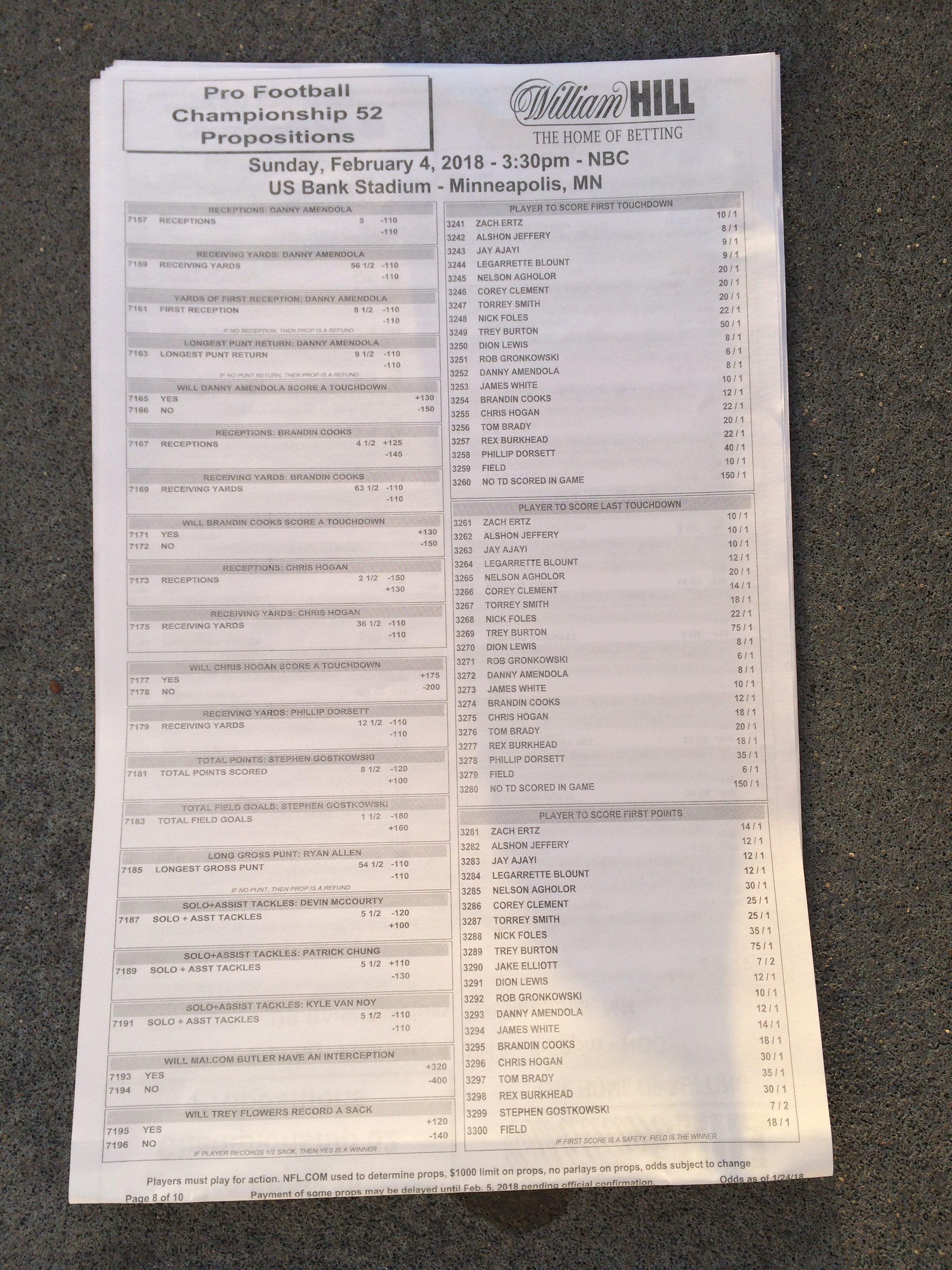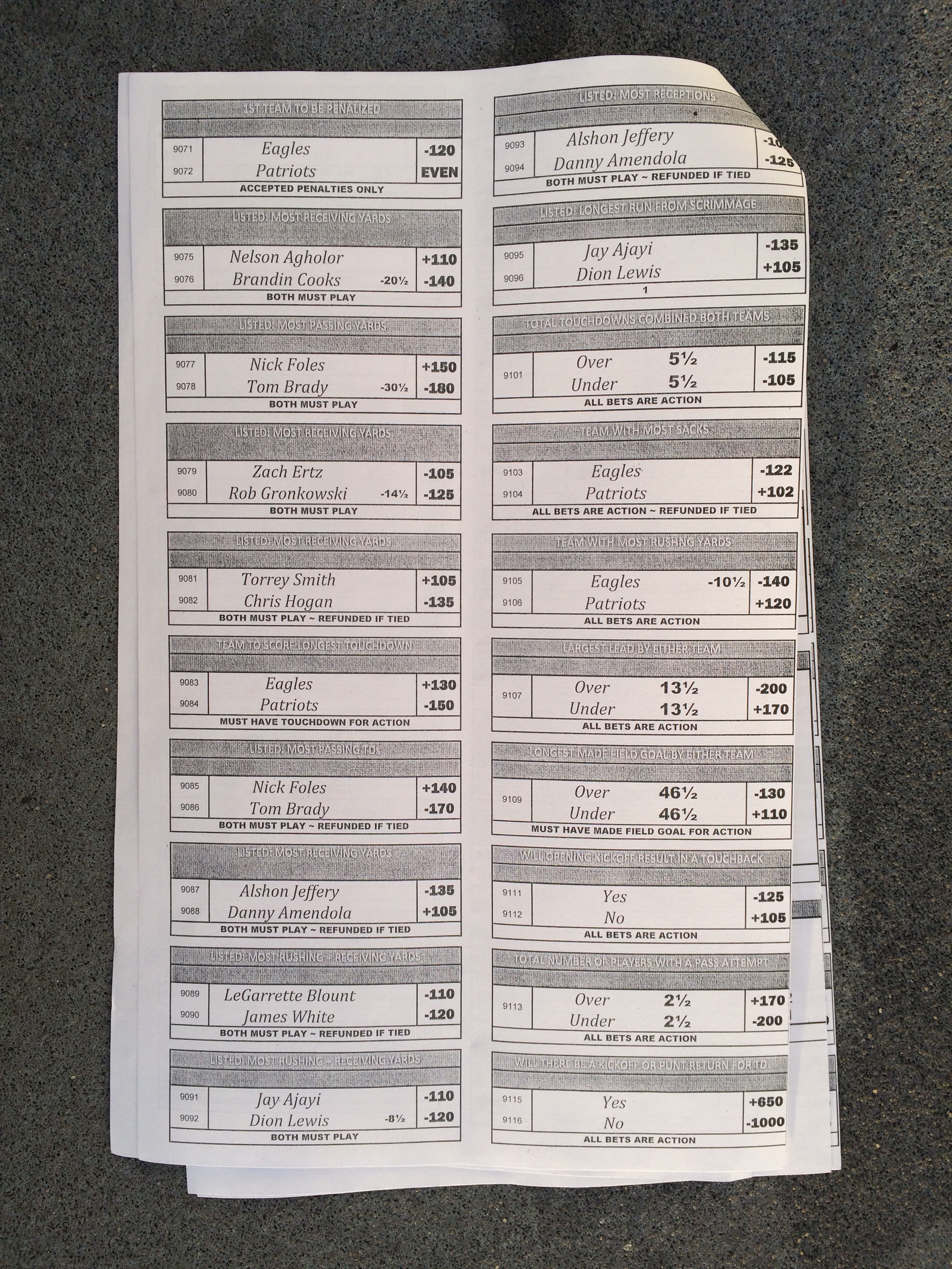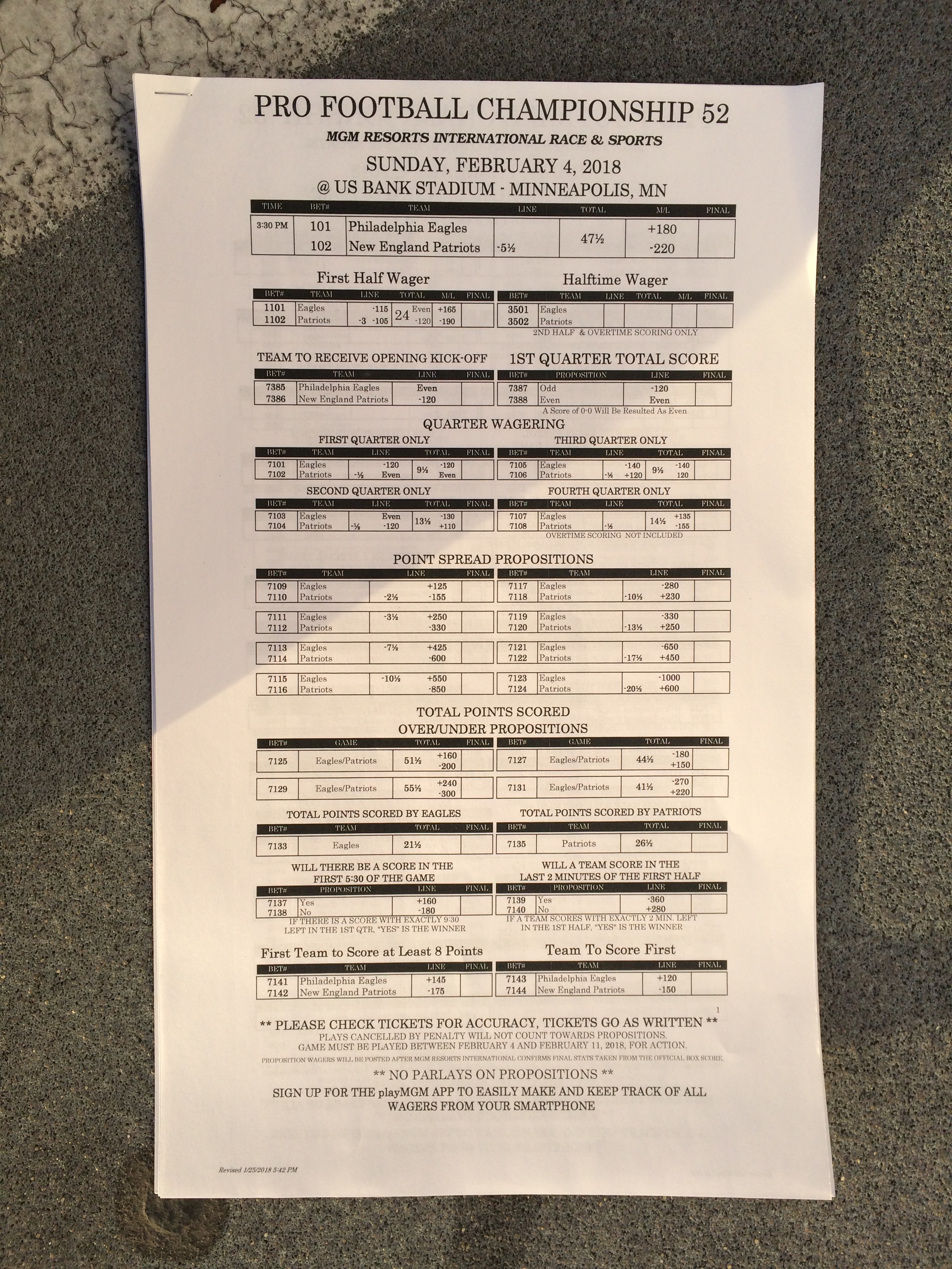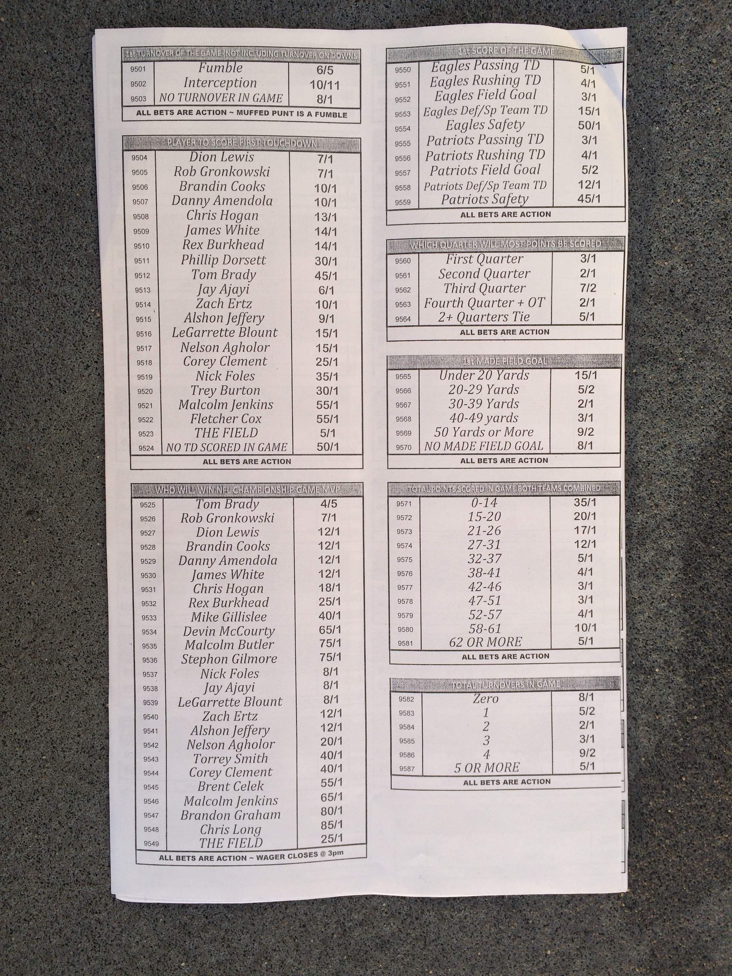 Ниже представлены фотографии всех страниц с ставками на исходы матчей в нескольких букмекерских конторах Лас-Вегаса. Эти листы были собраны 27 января 2018 года, за восемь дней до игры.