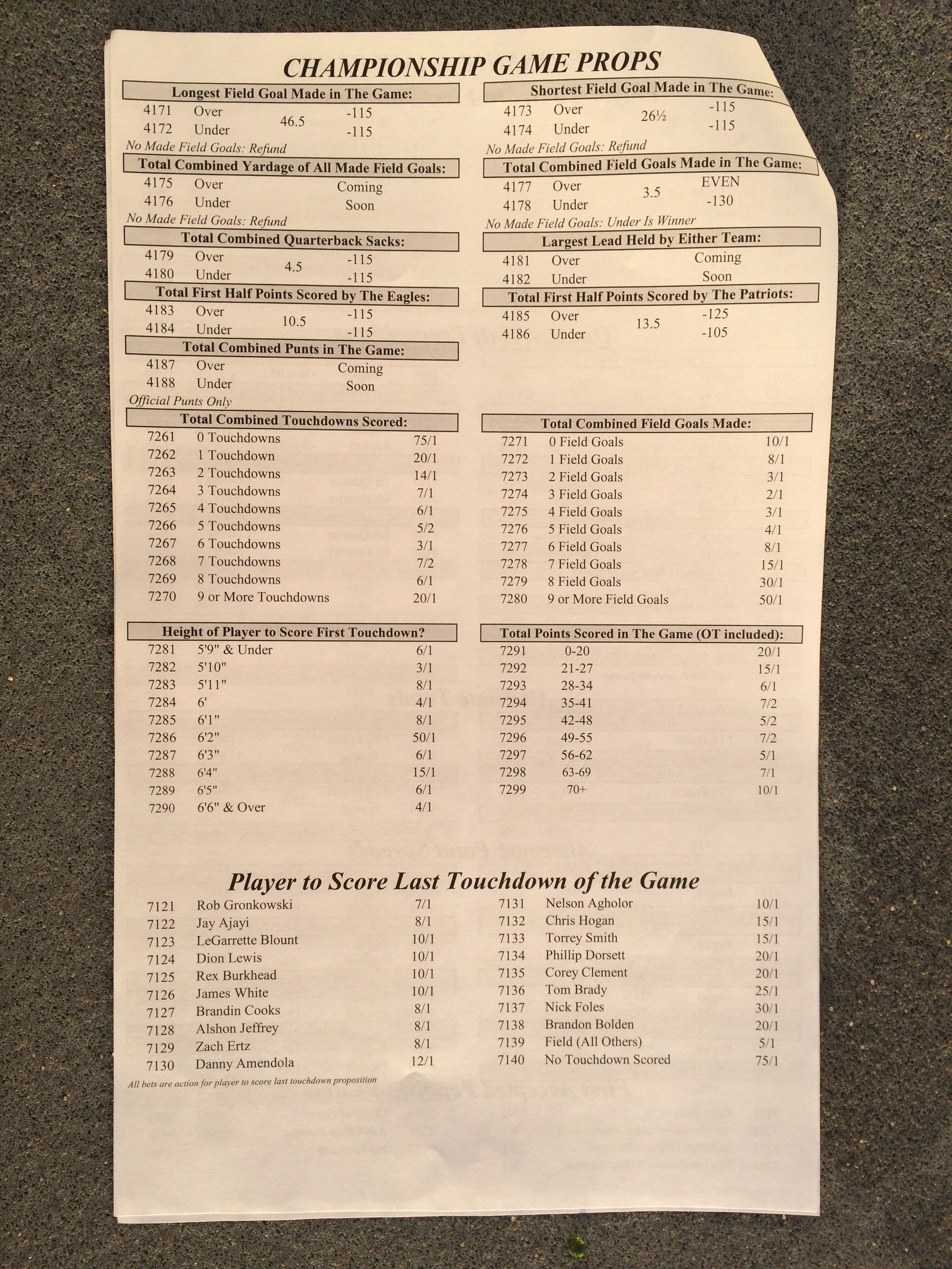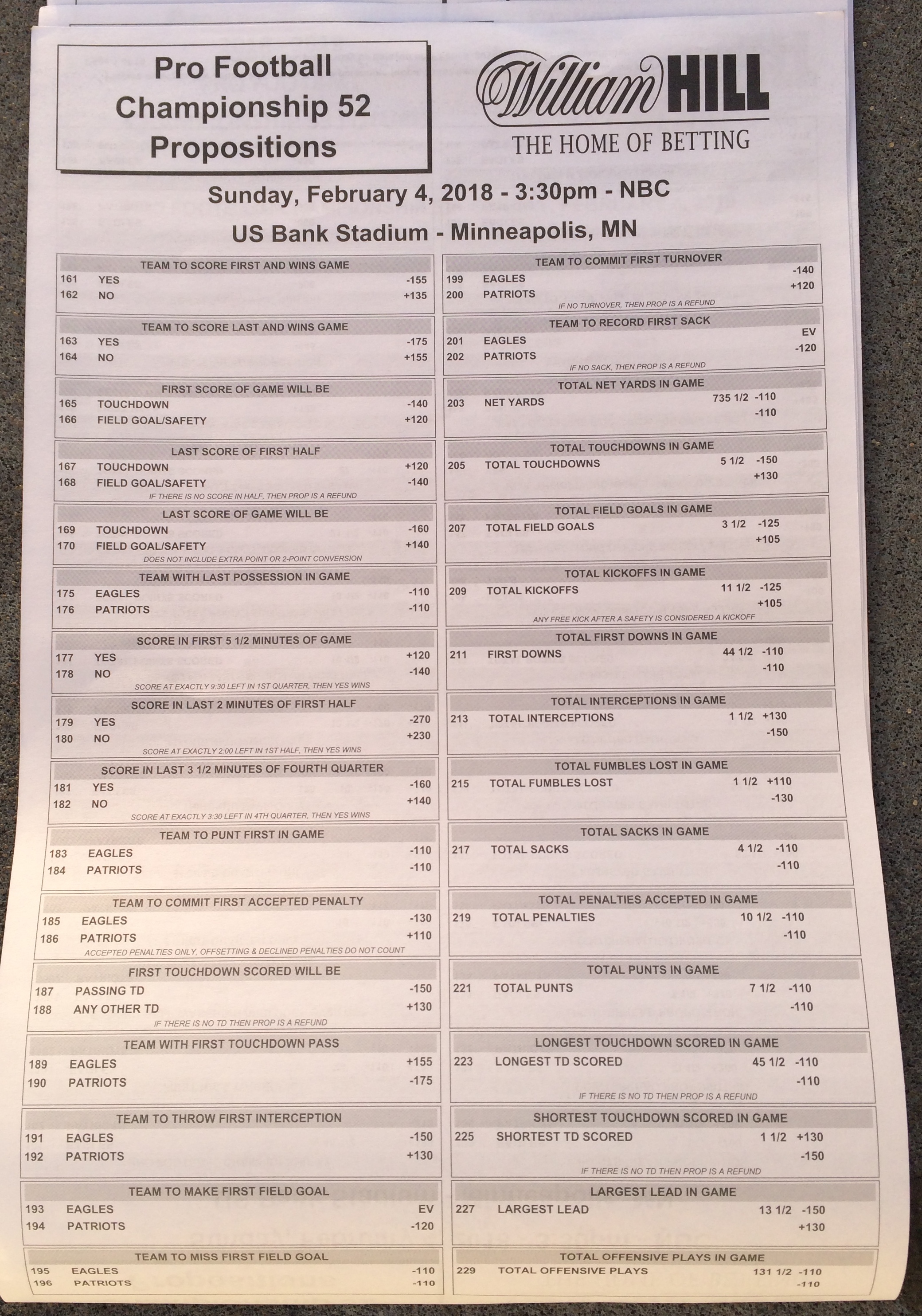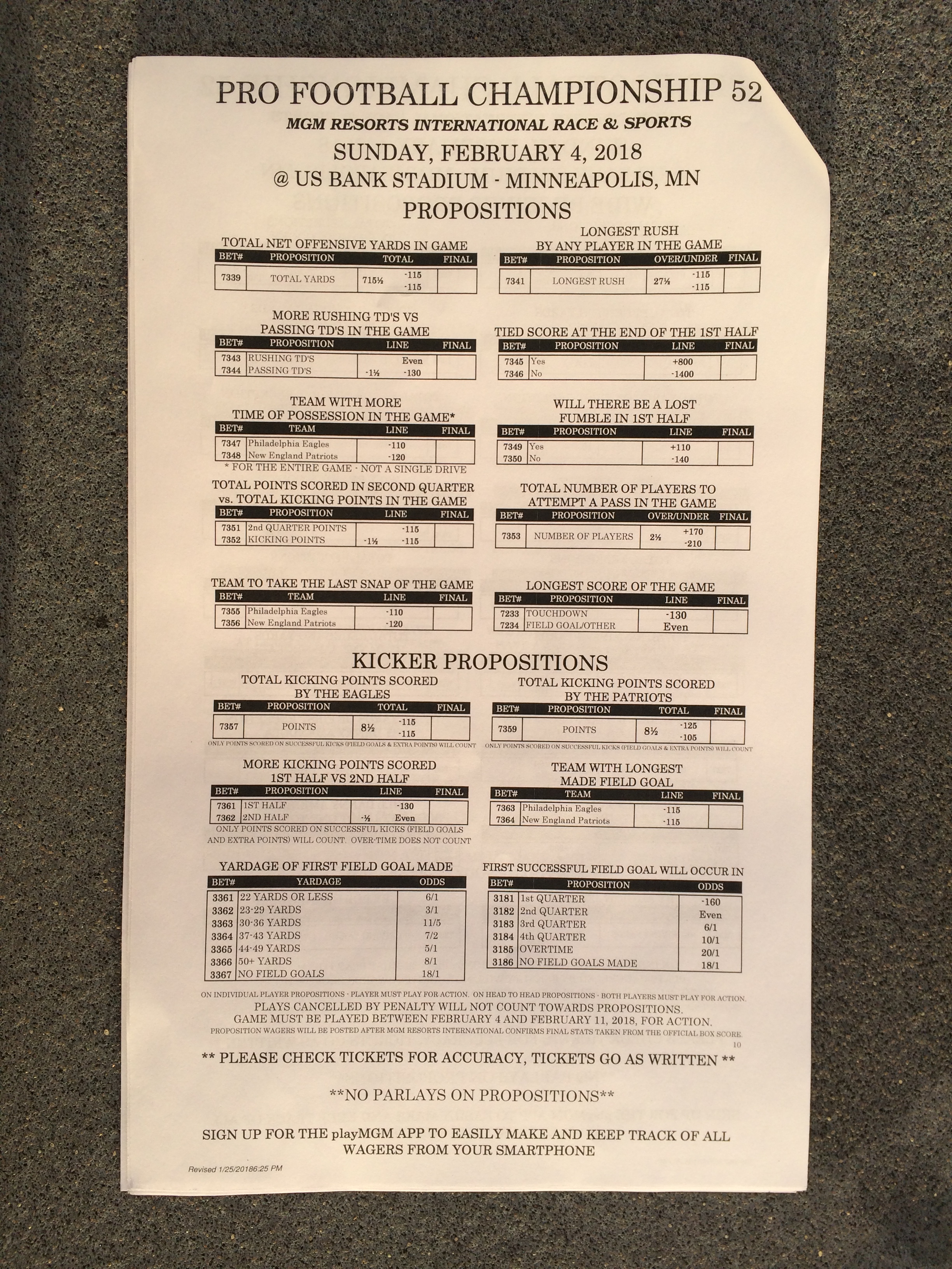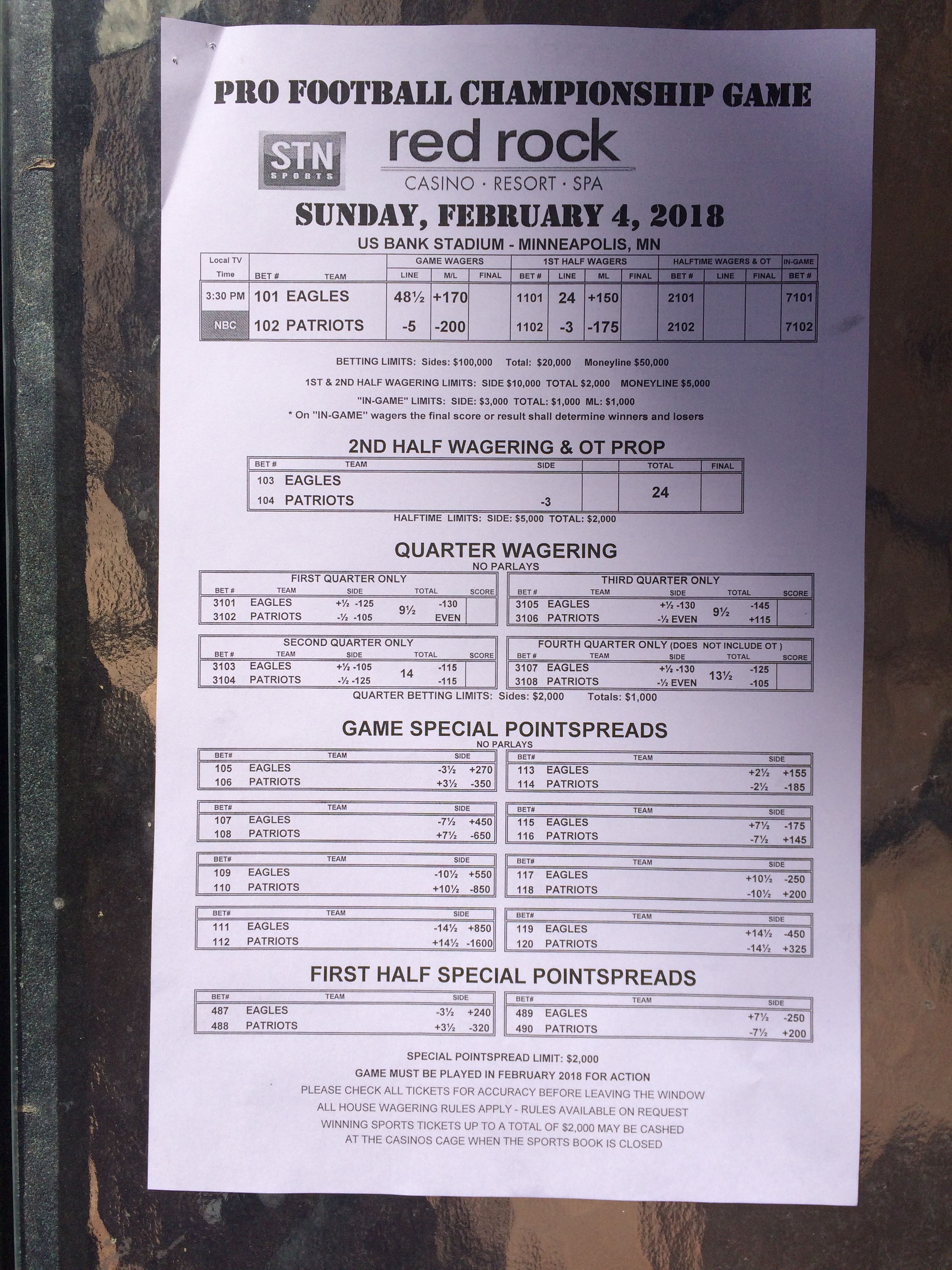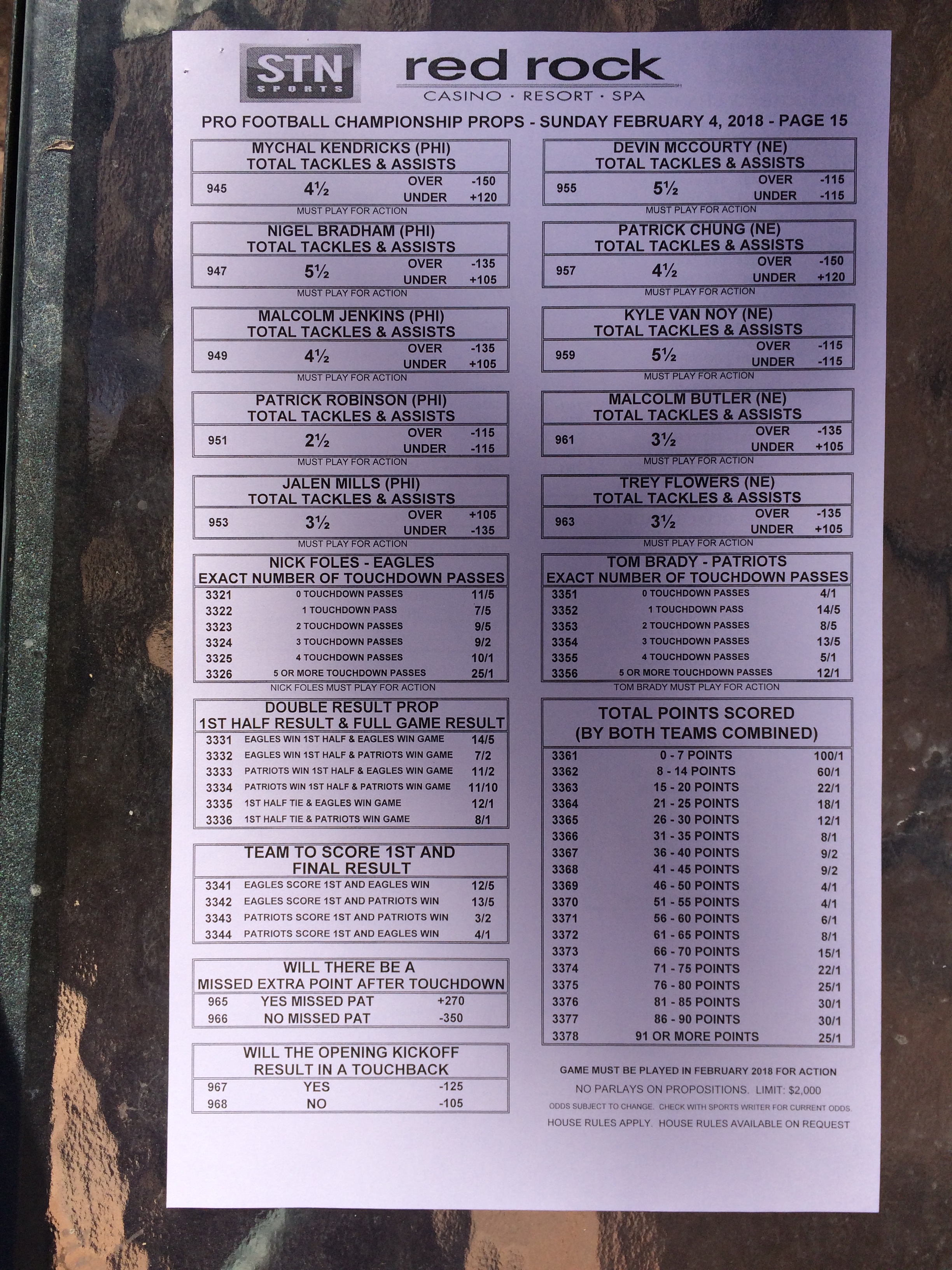Ниже представлены фотографии всех страниц с ставками на исходы матчей в нескольких букмекерских конторах Лас-Вегаса. Эти листы были собраны 27 января 2018 года, за восемь дней до игры.