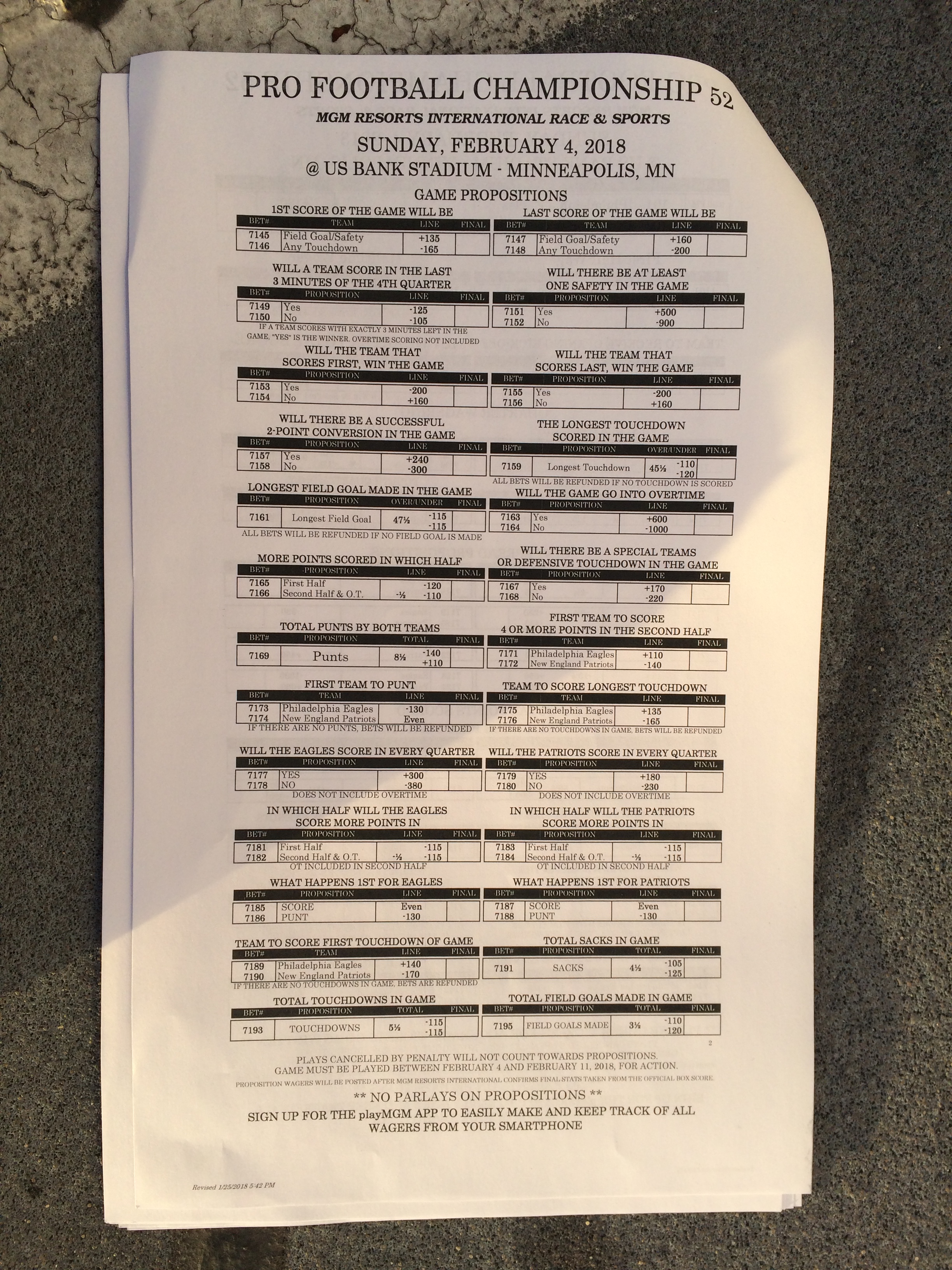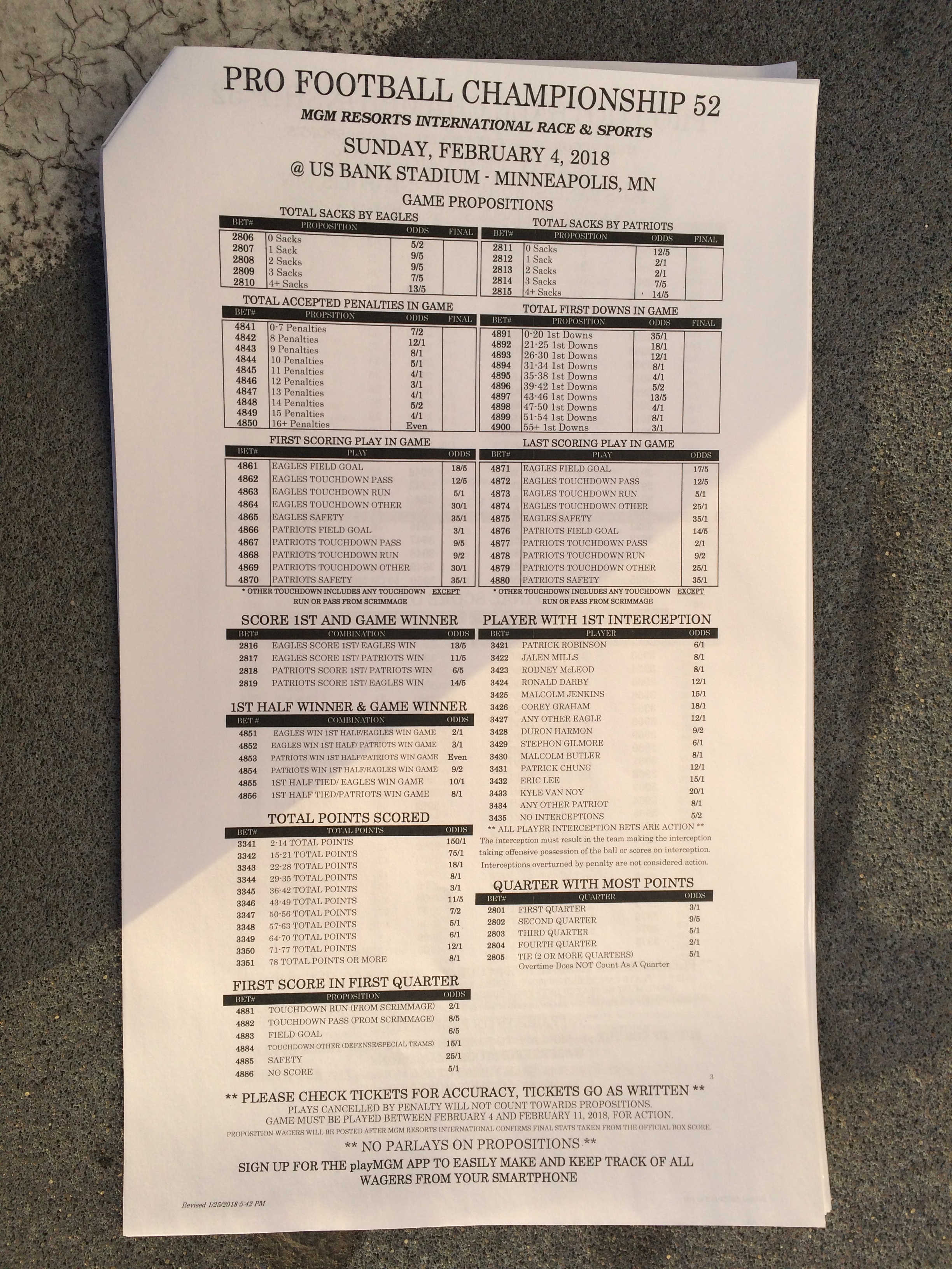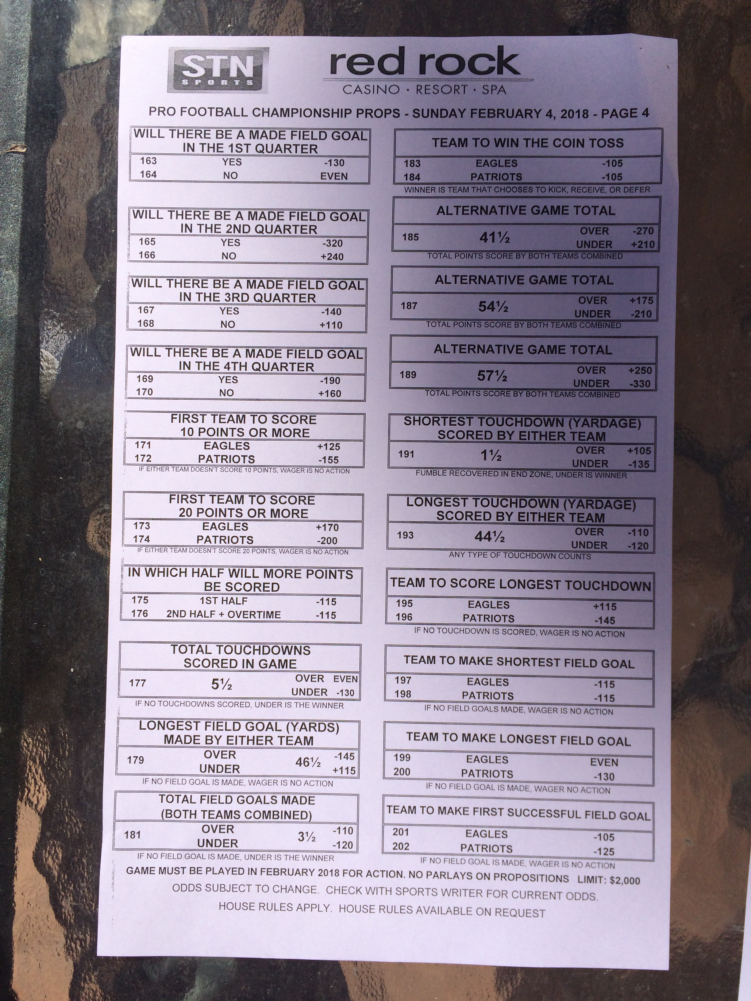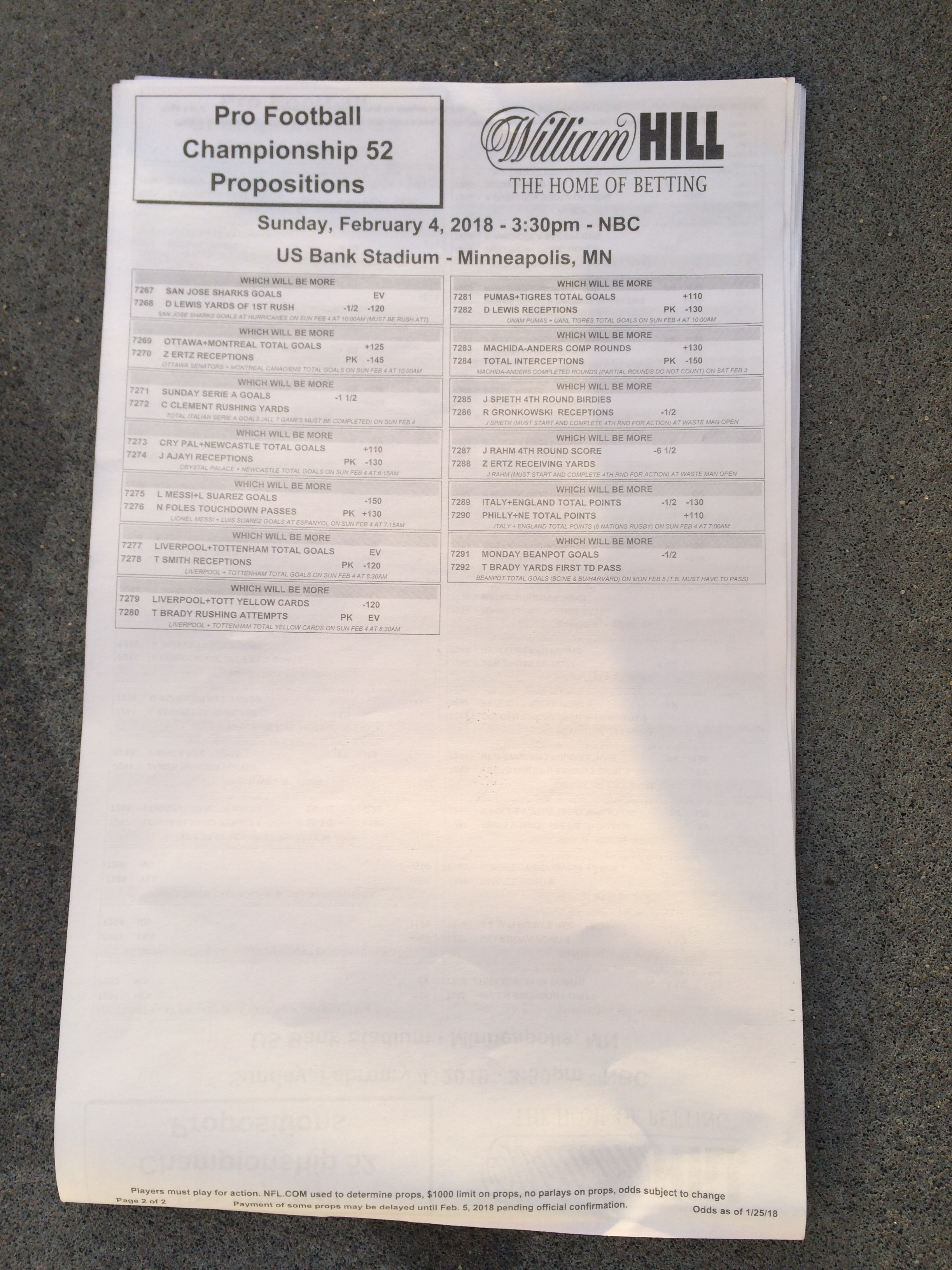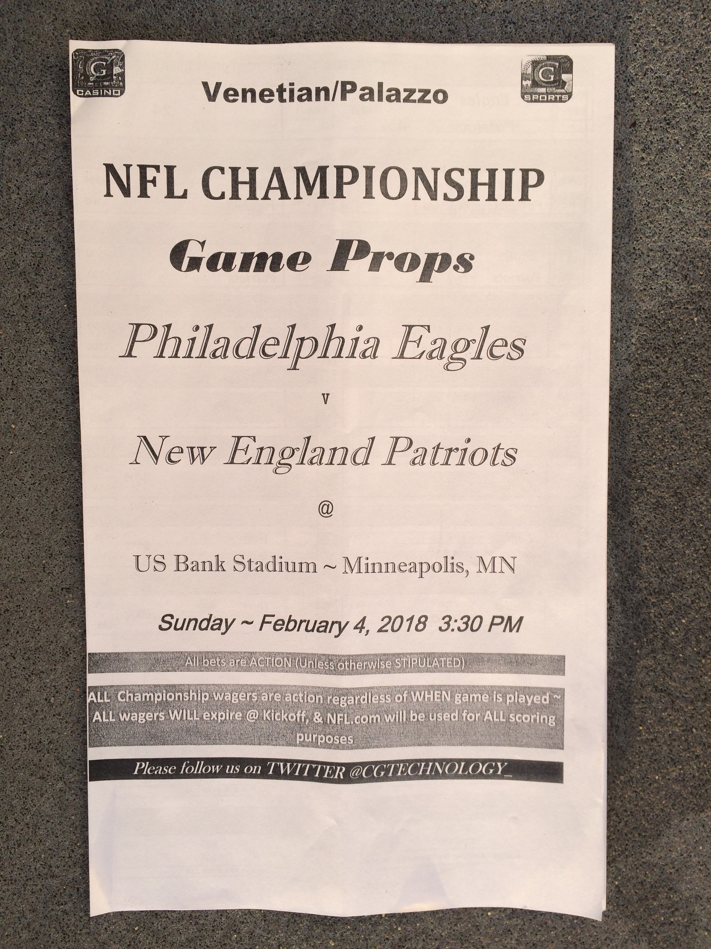 Ниже представлены фотографии всех страниц с ставками на исходы матчей в нескольких букмекерских конторах Лас-Вегаса. Эти листы были собраны 27 января 2018 года, за восемь дней до игры.