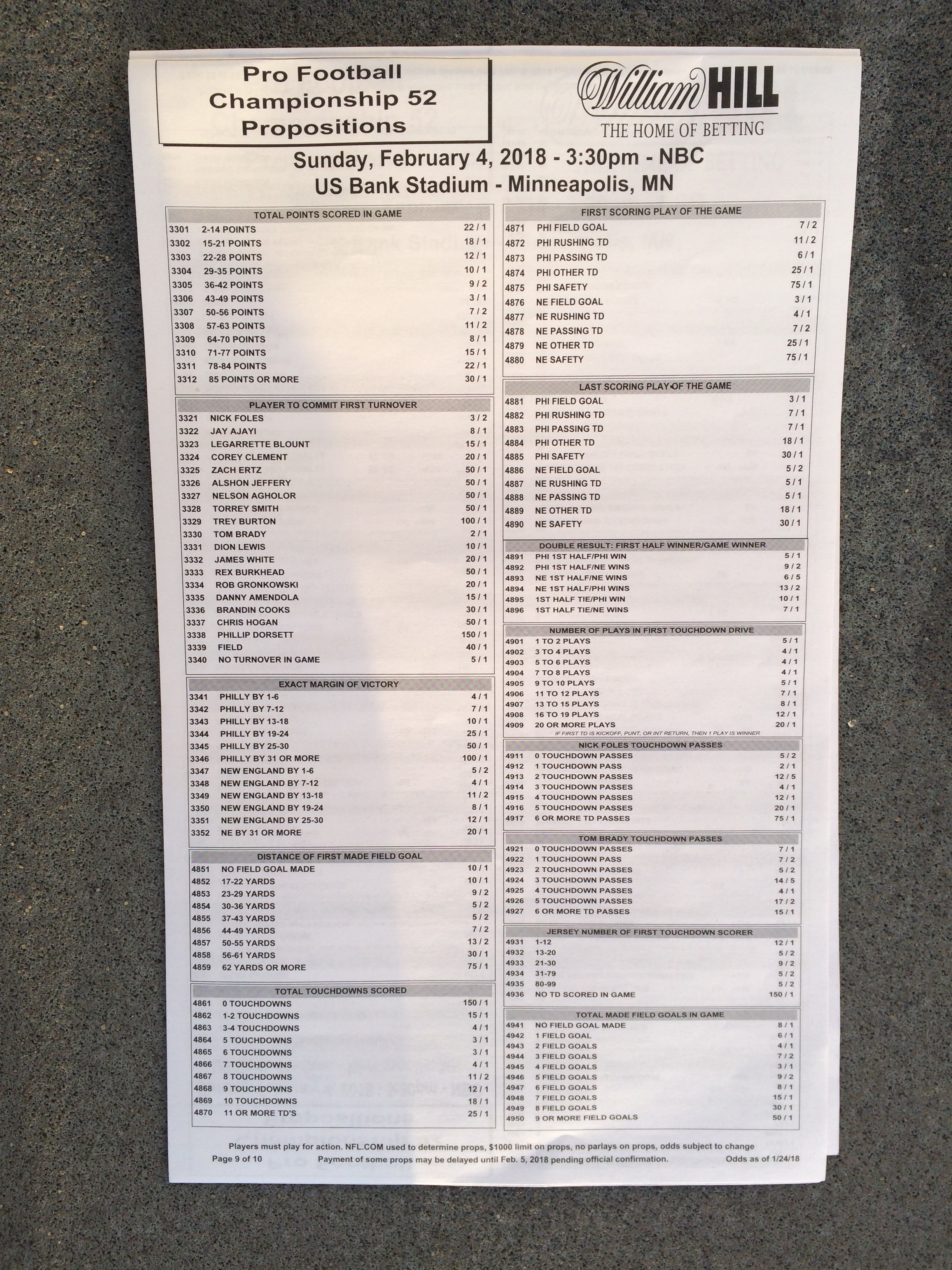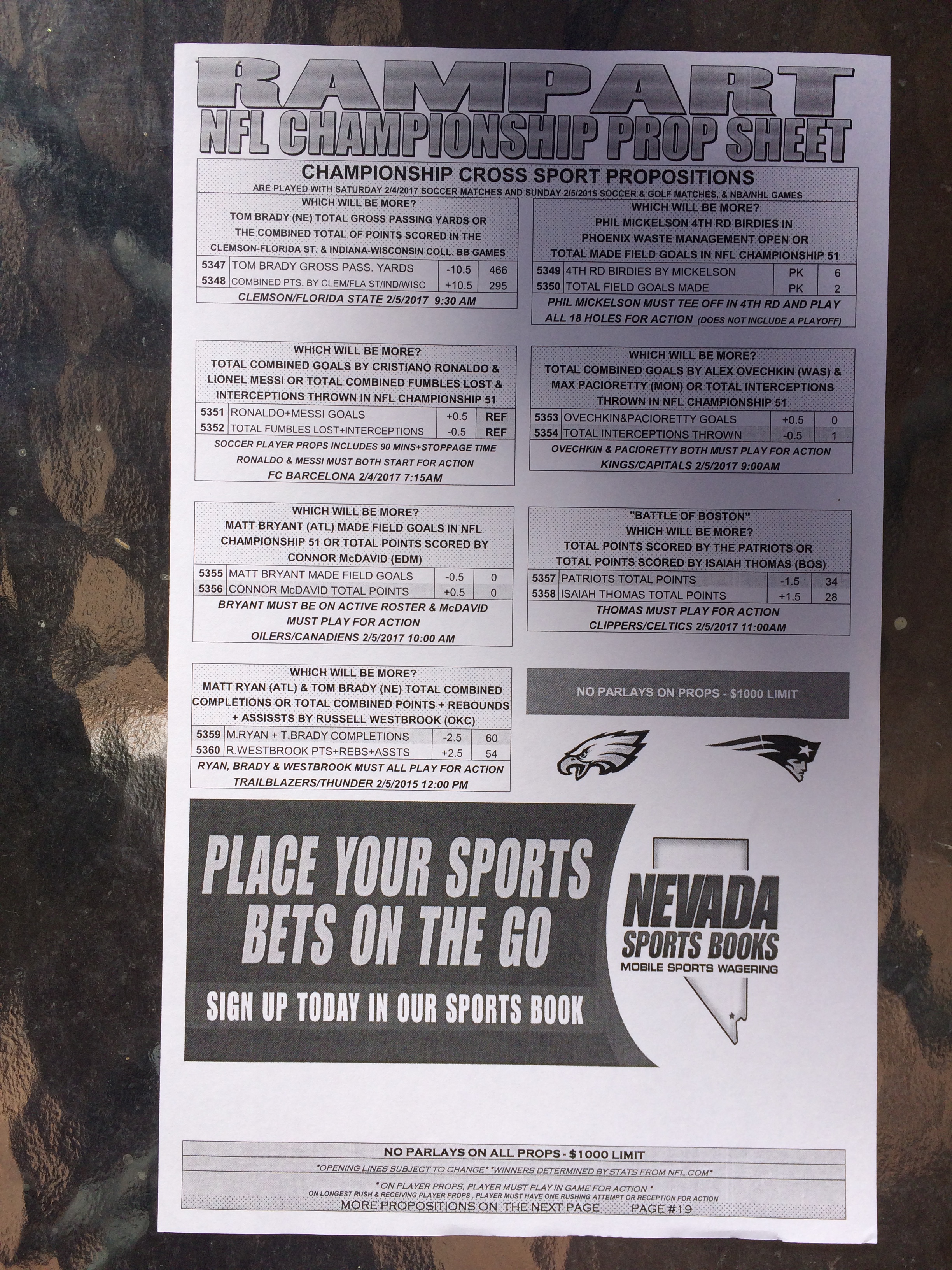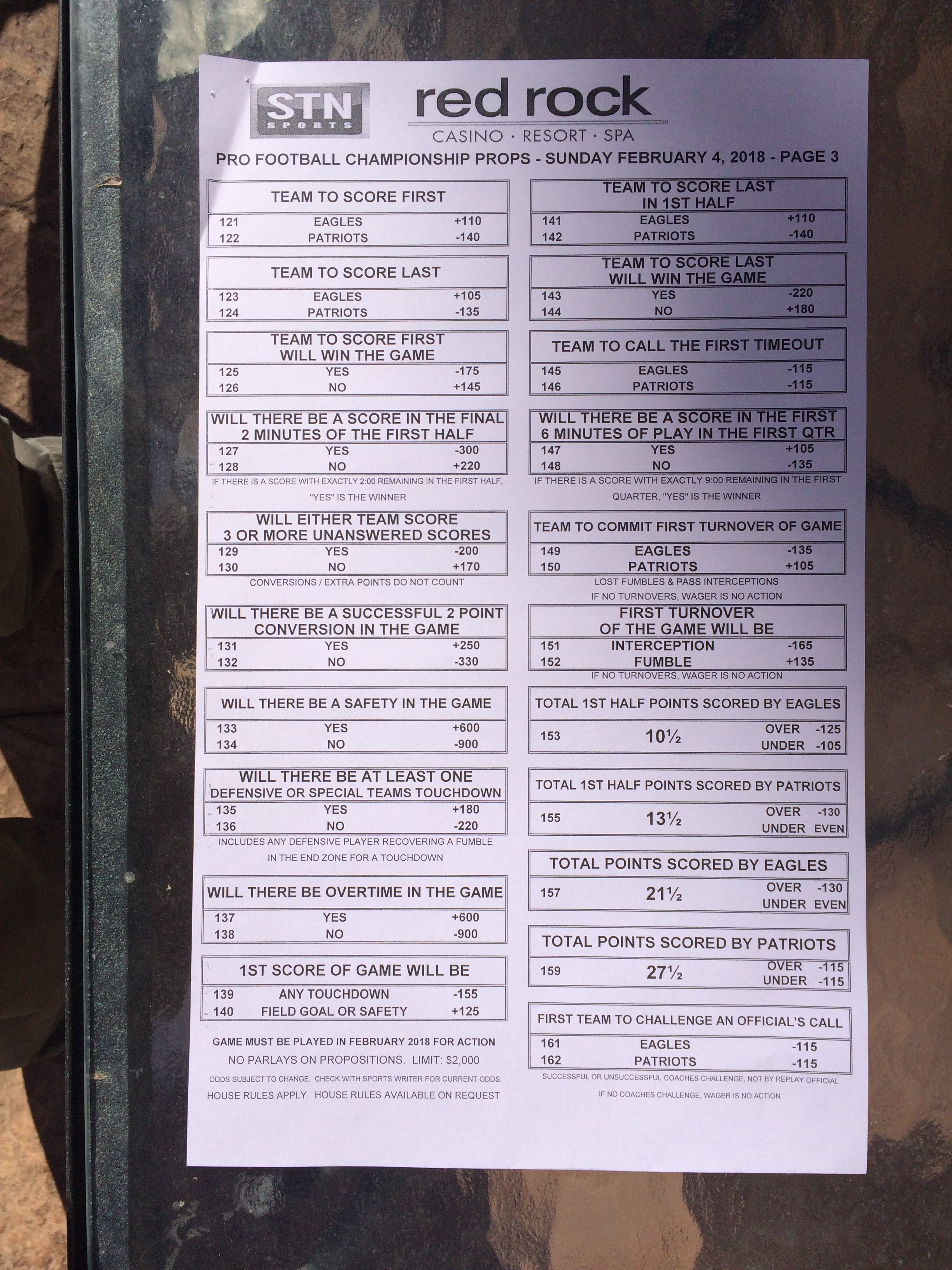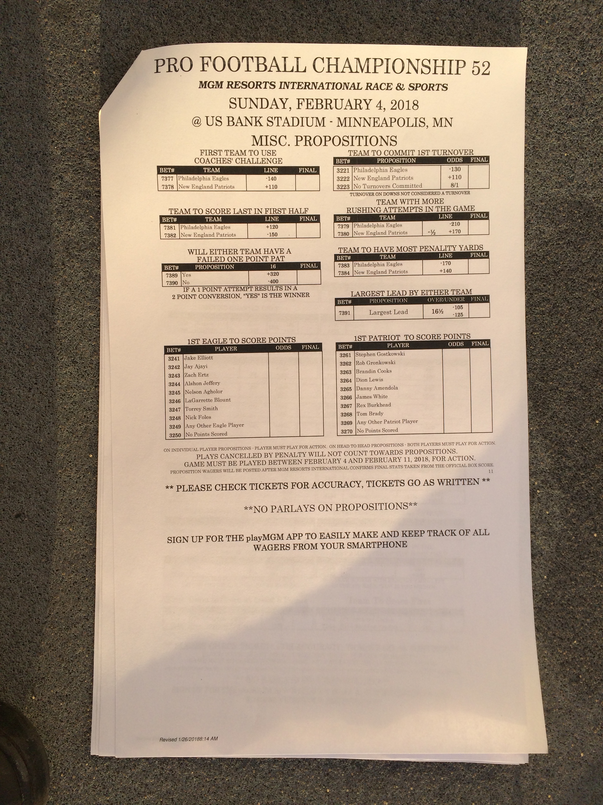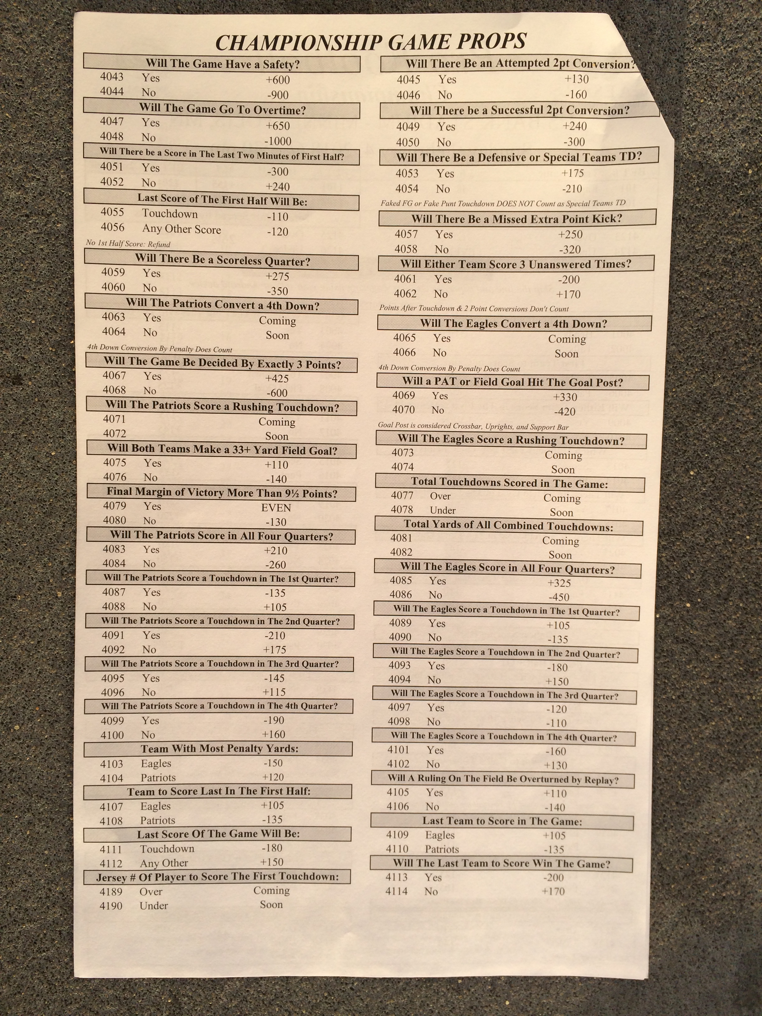 Ниже представлены фотографии всех страниц с ставками на исходы матчей в нескольких букмекерских конторах Лас-Вегаса. Эти листы были собраны 27 января 2018 года, за восемь дней до игры.