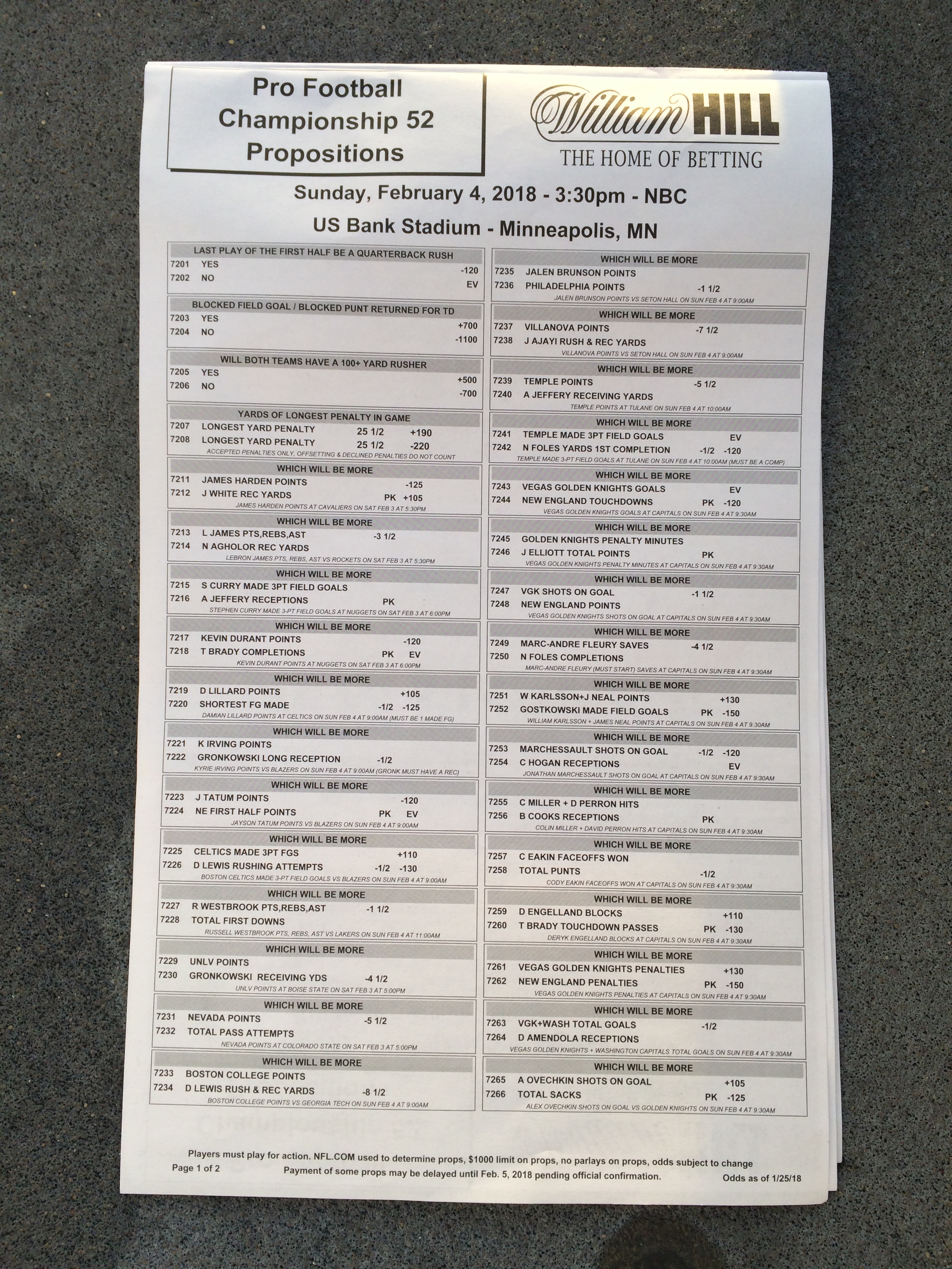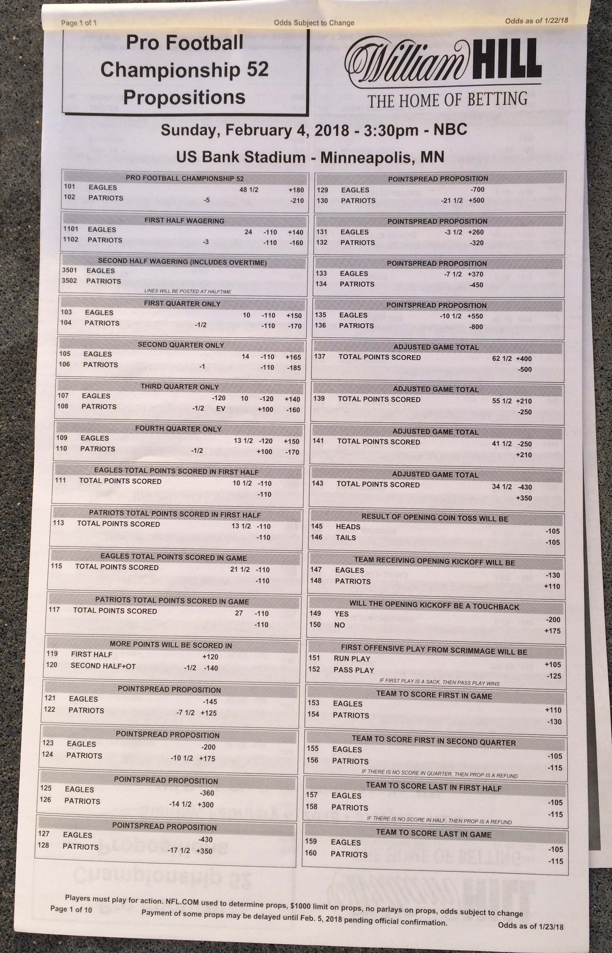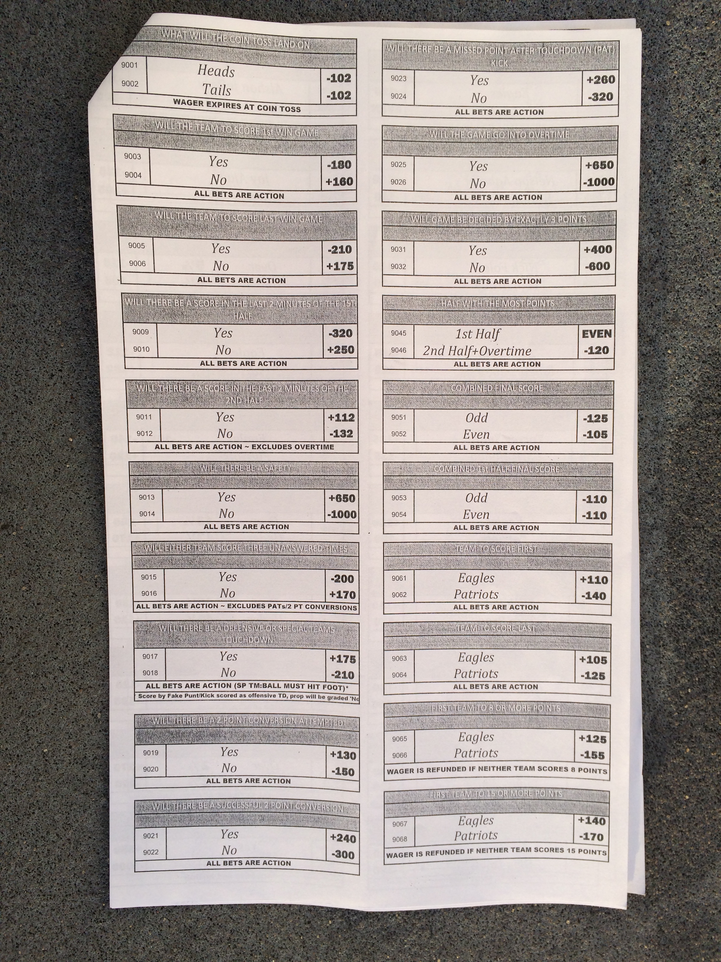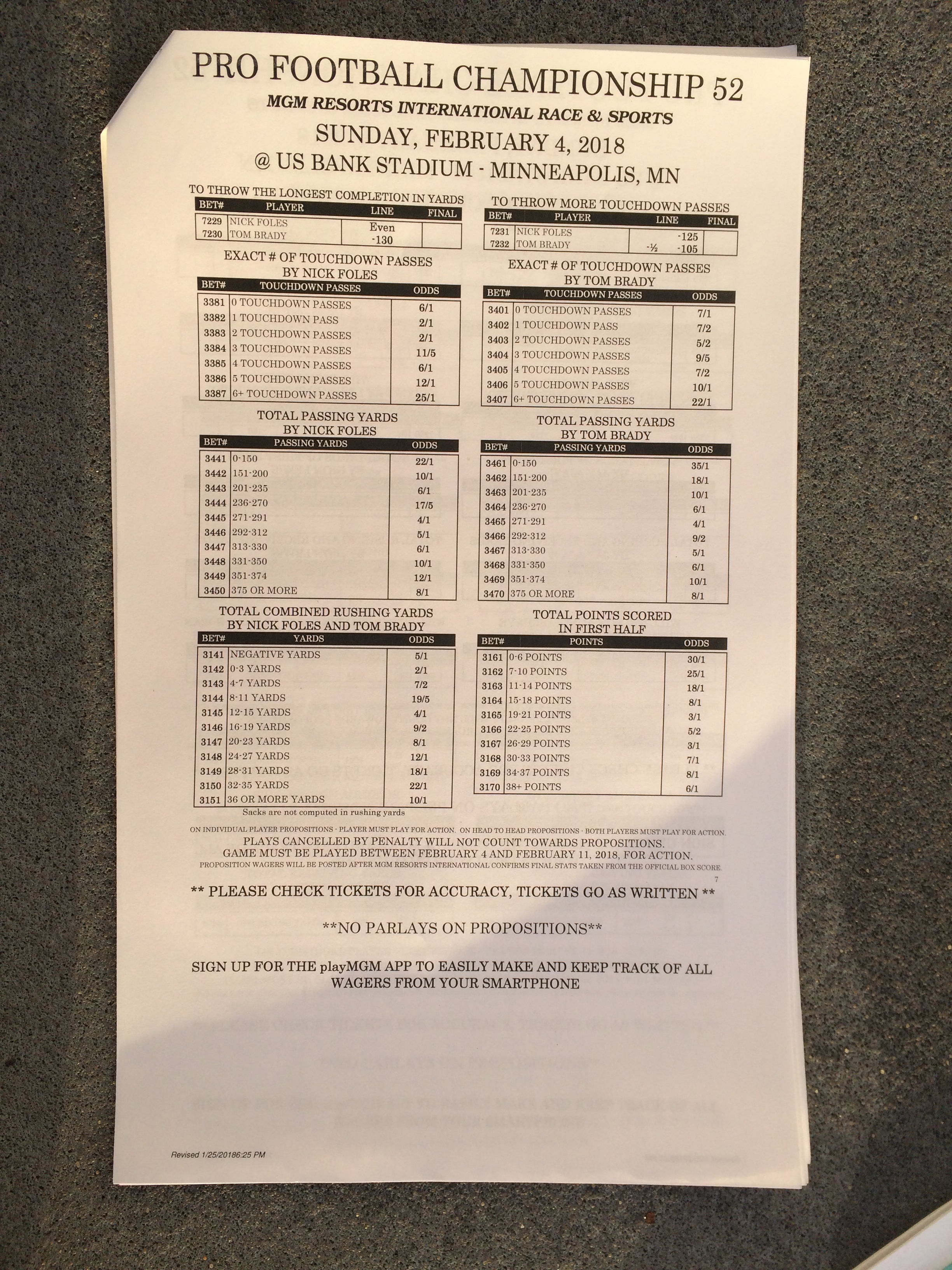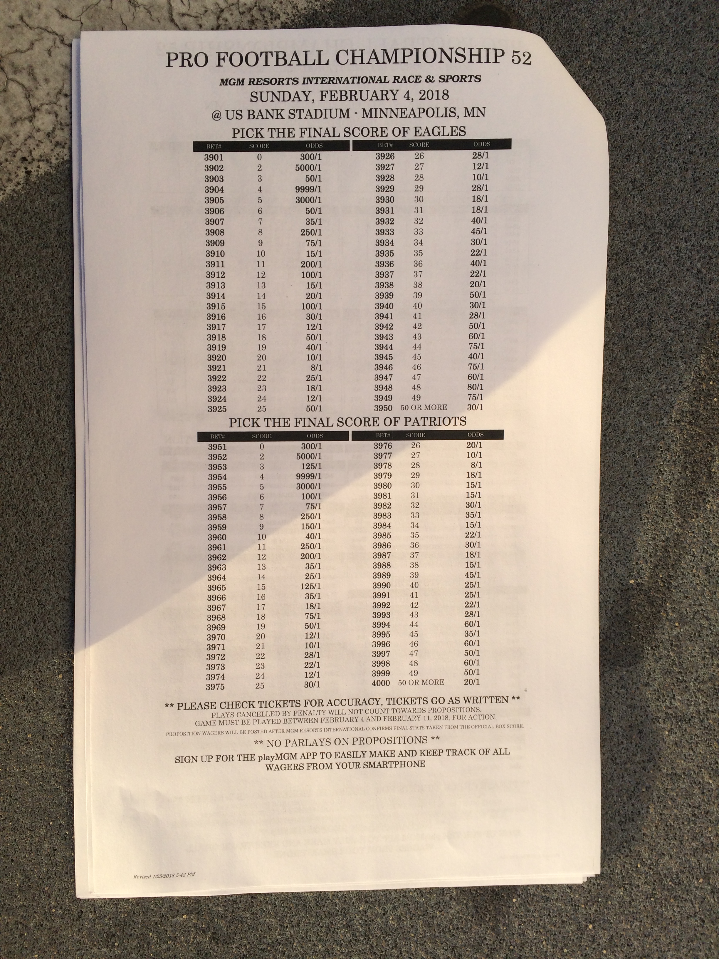 Ниже представлены фотографии всех страниц с ставками на исходы матчей в нескольких букмекерских конторах Лас-Вегаса. Эти листы были собраны 27 января 2018 года, за восемь дней до игры.