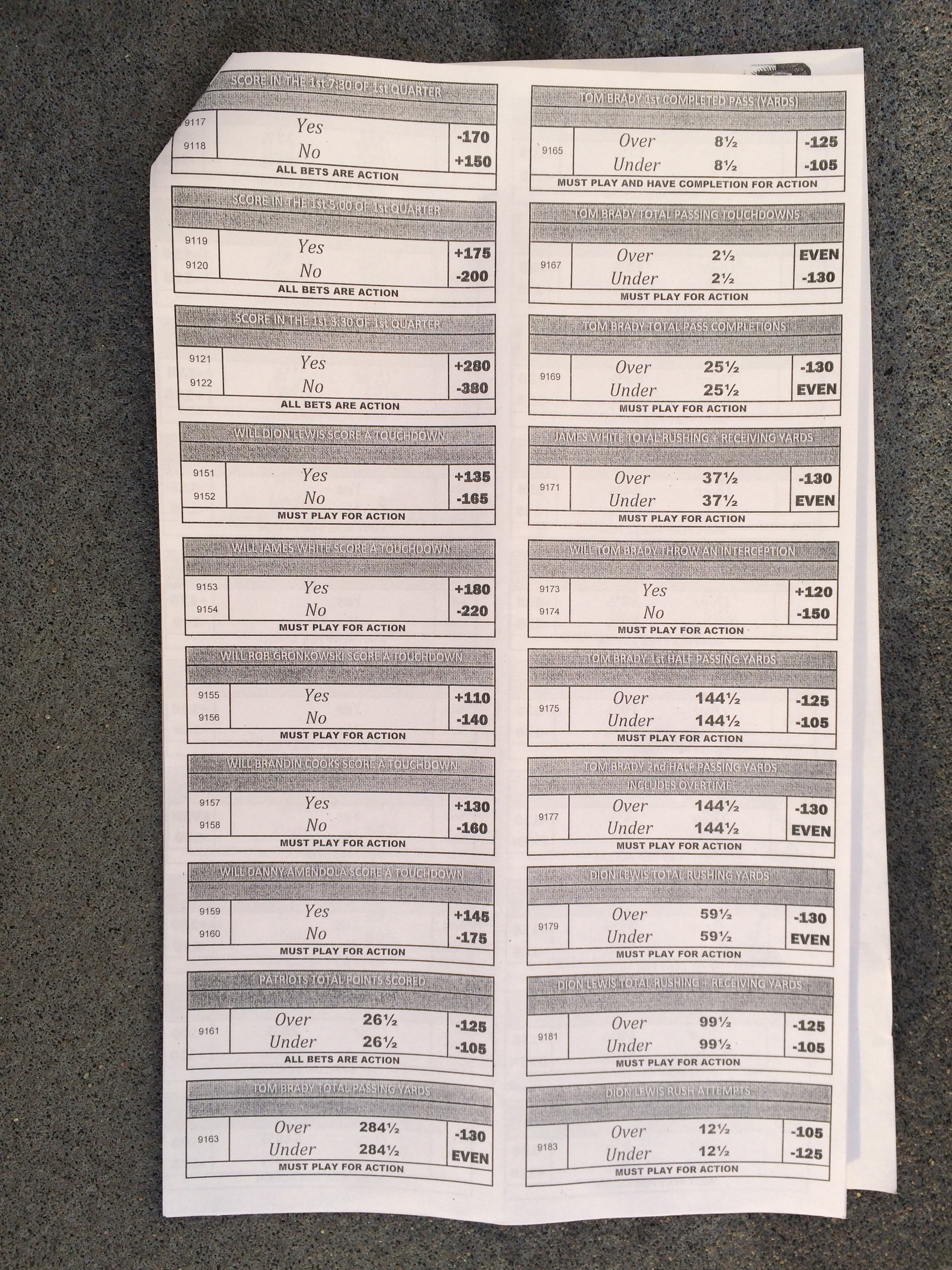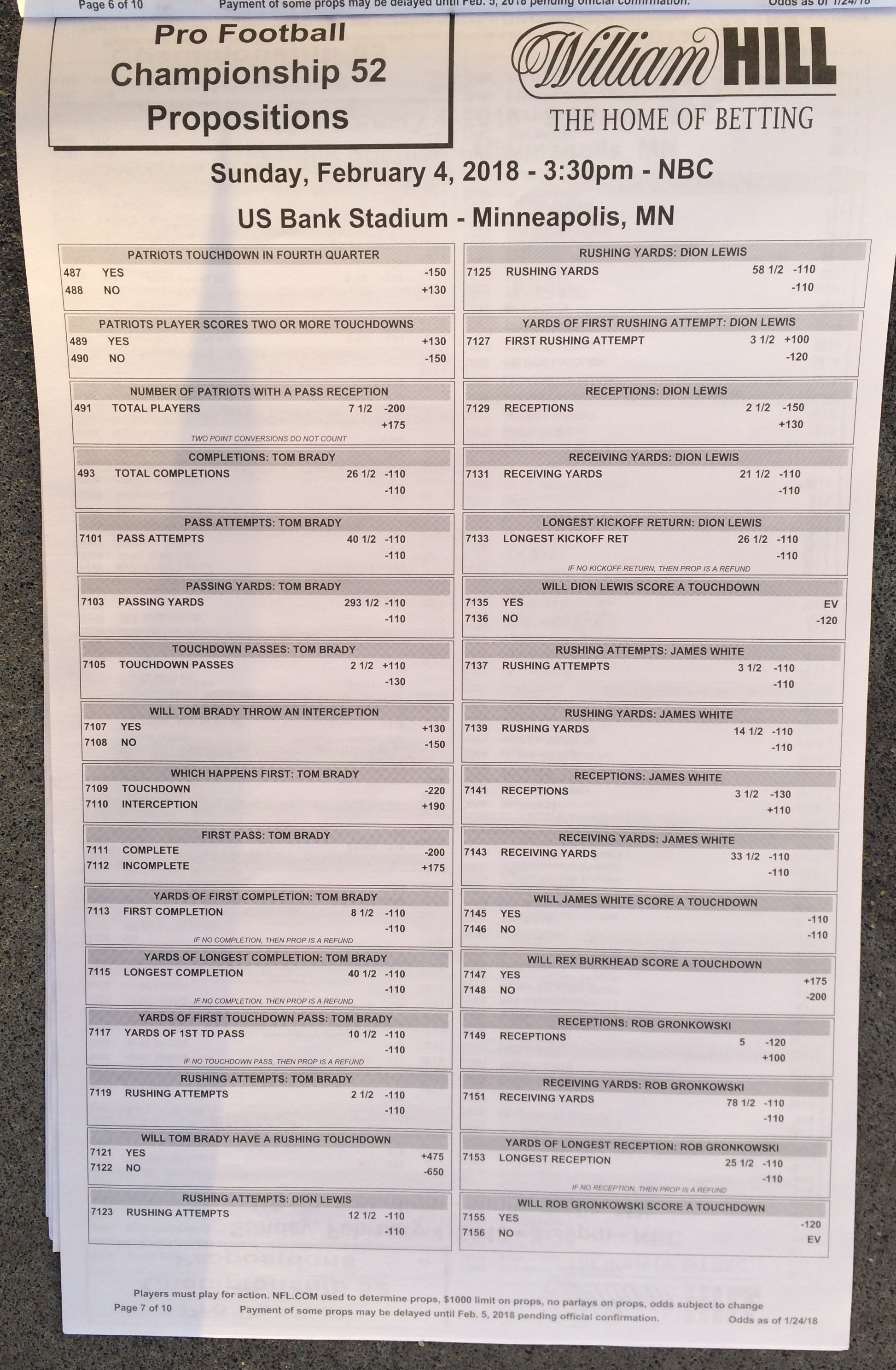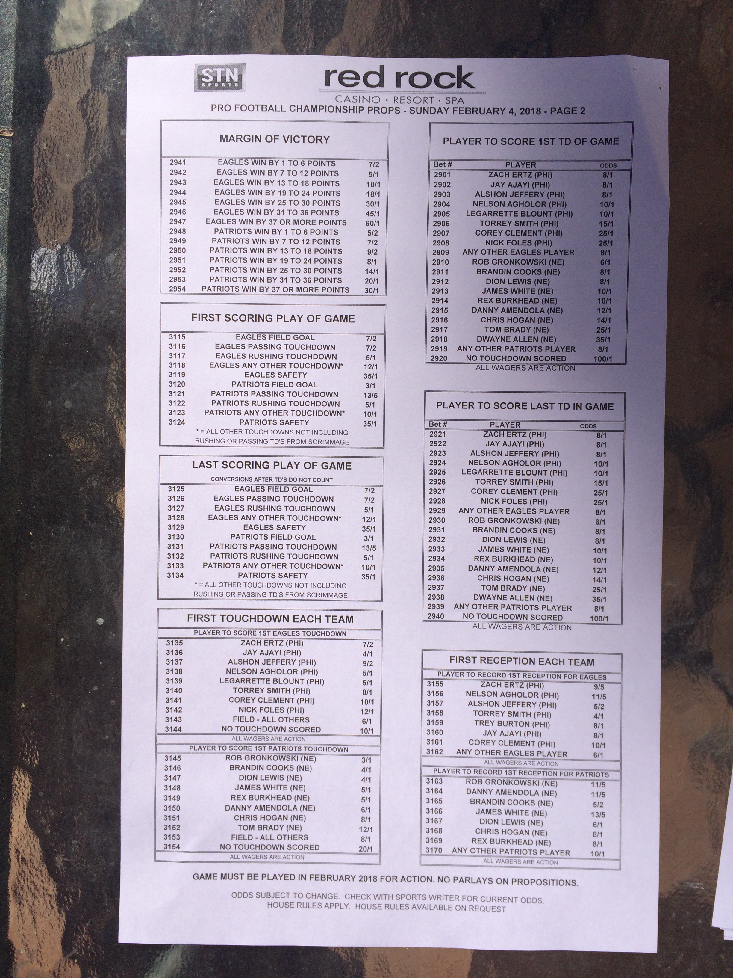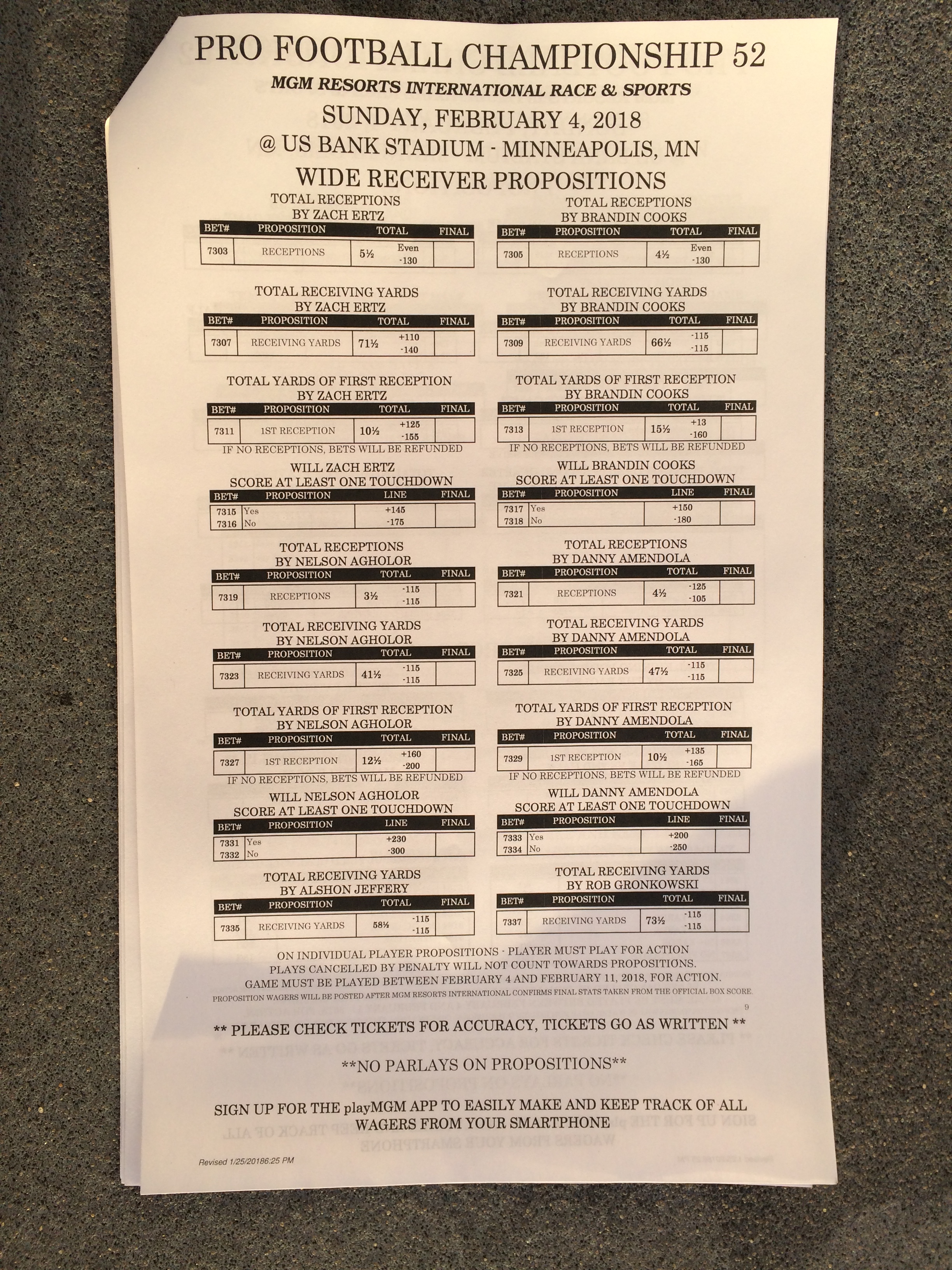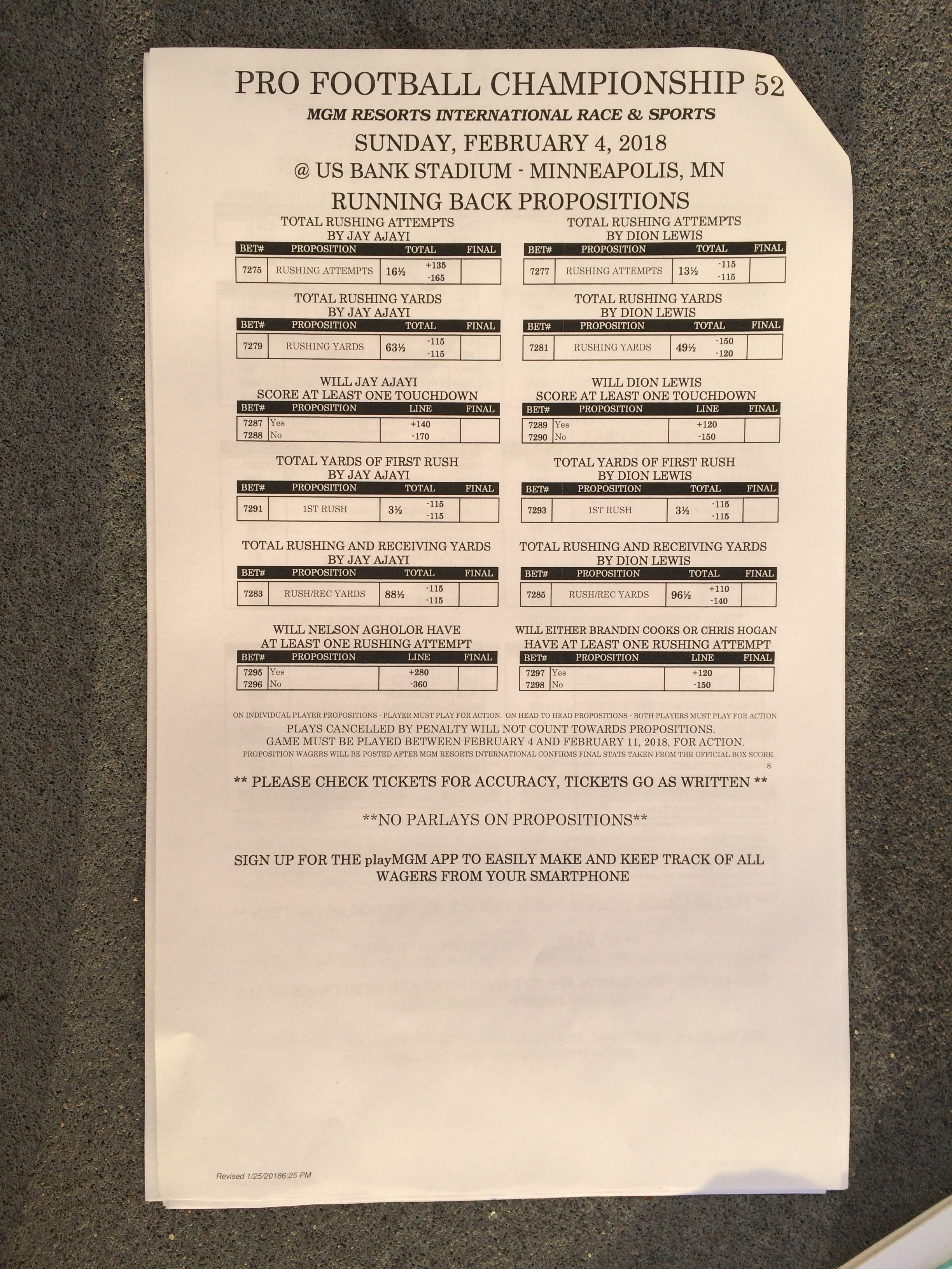 Ниже представлены фотографии всех страниц с ставками на исходы матчей в нескольких букмекерских конторах Лас-Вегаса. Эти листы были собраны 27 января 2018 года, за восемь дней до игры.
