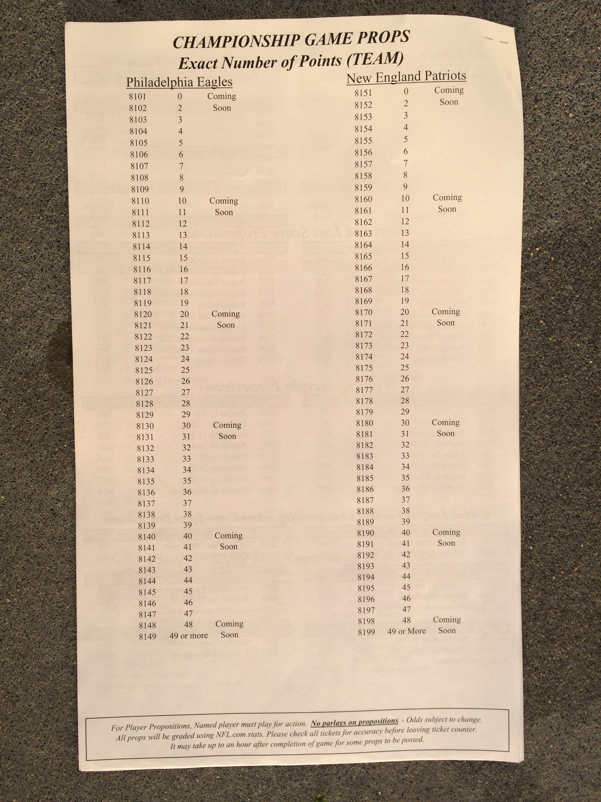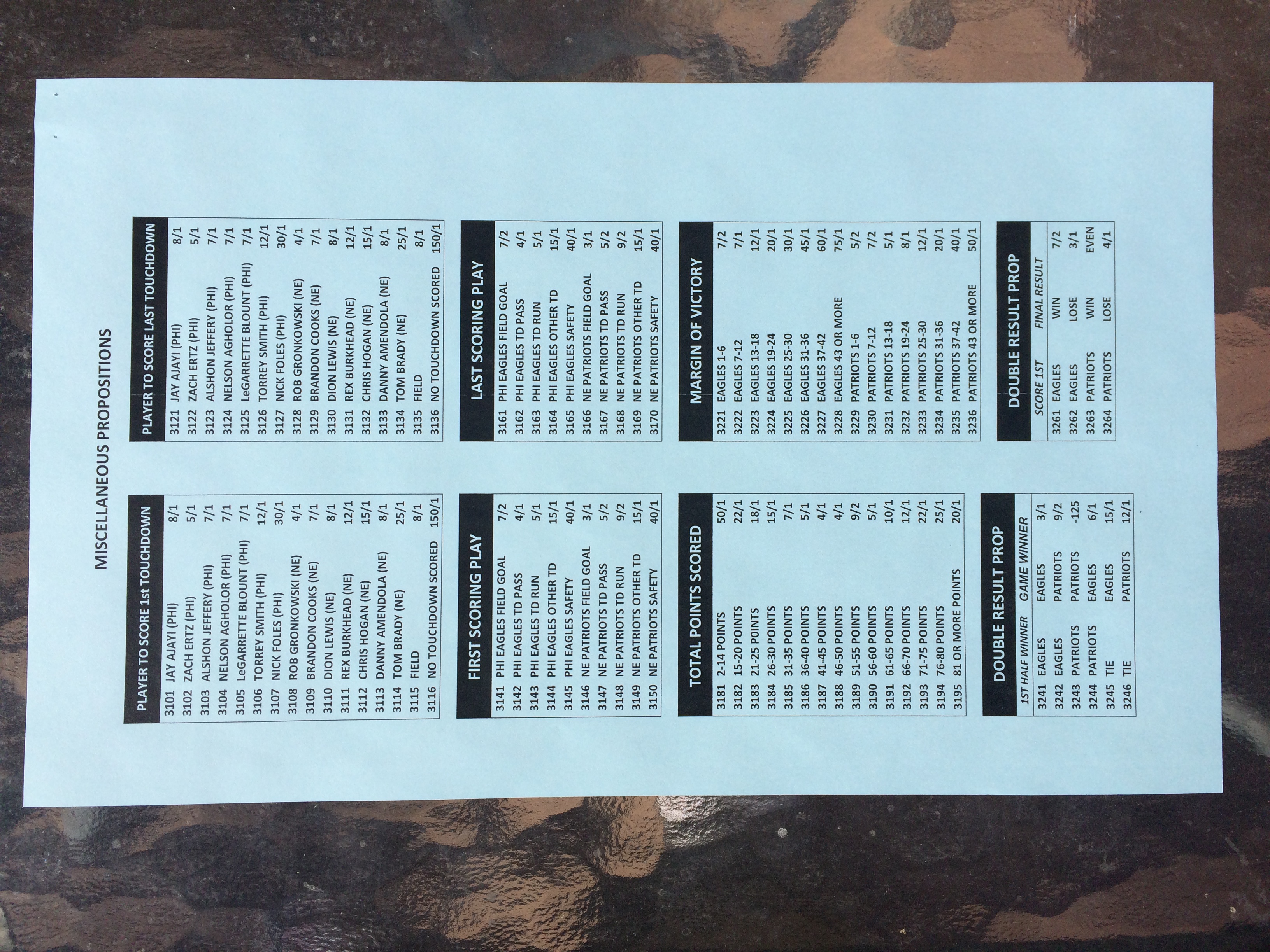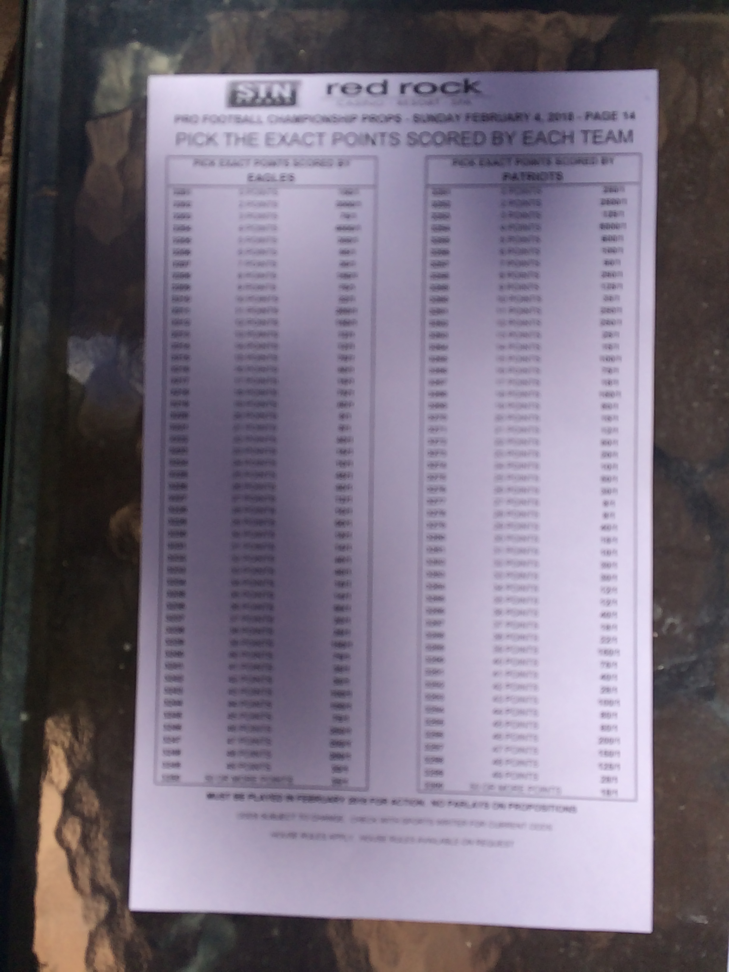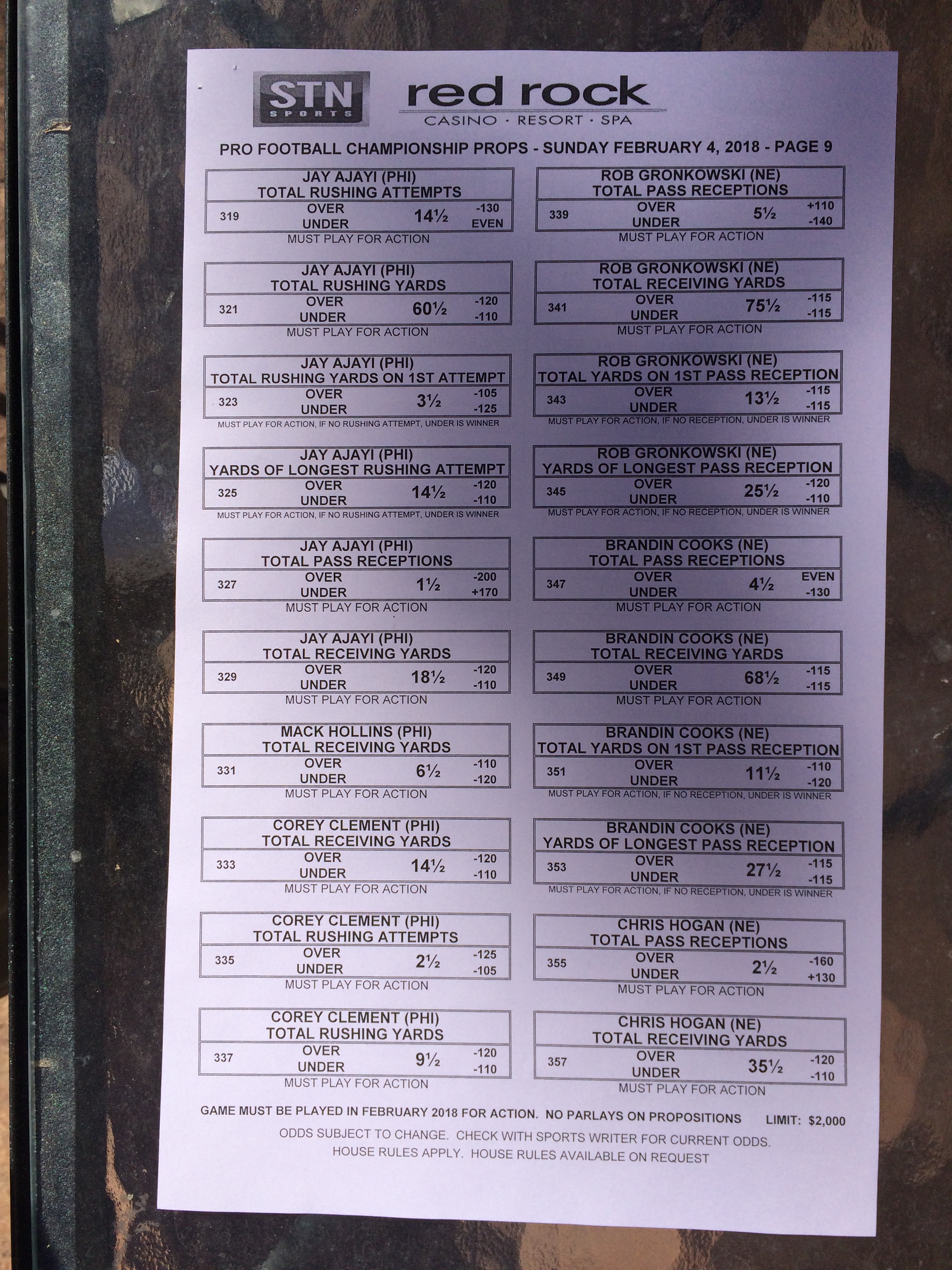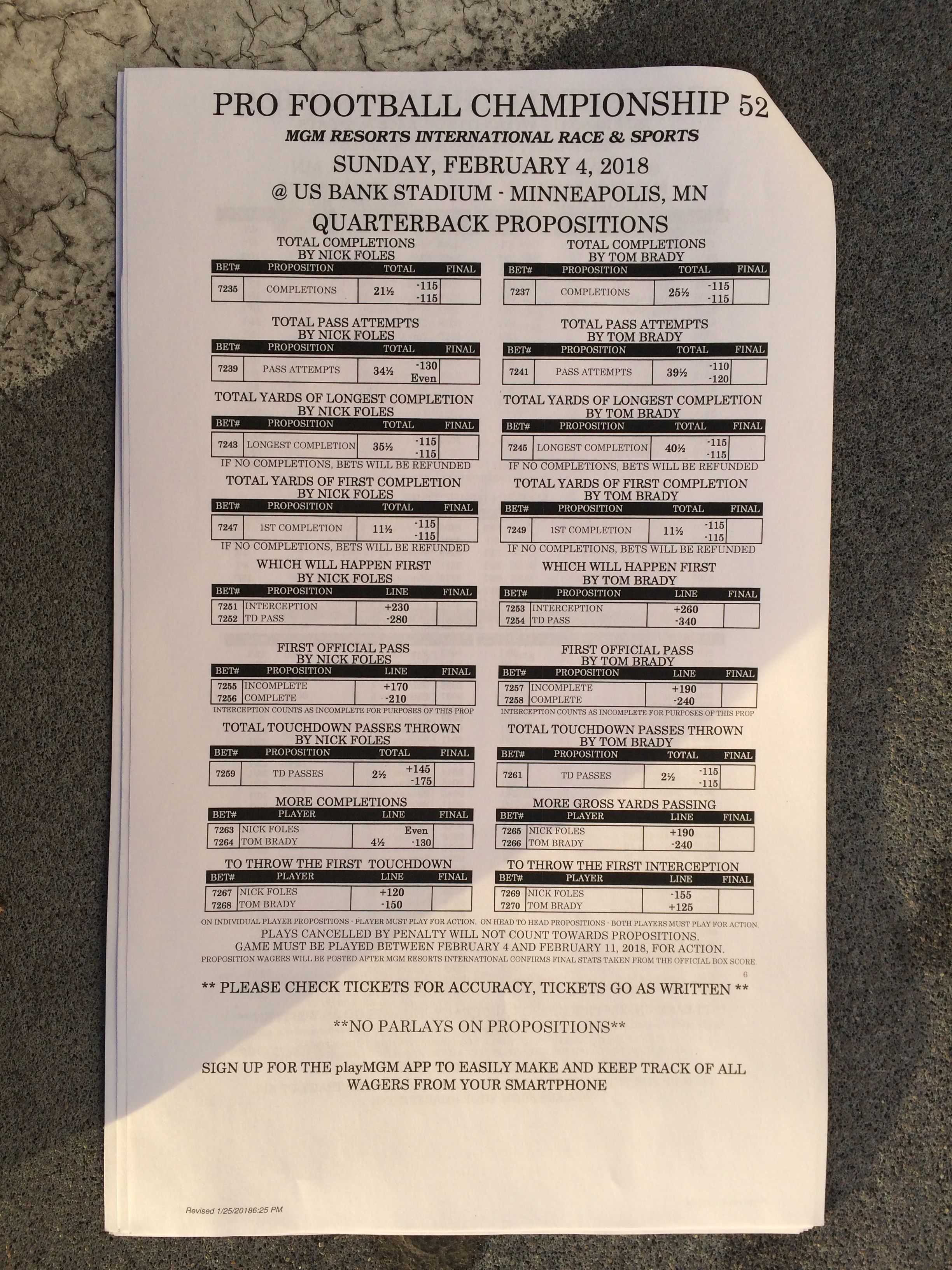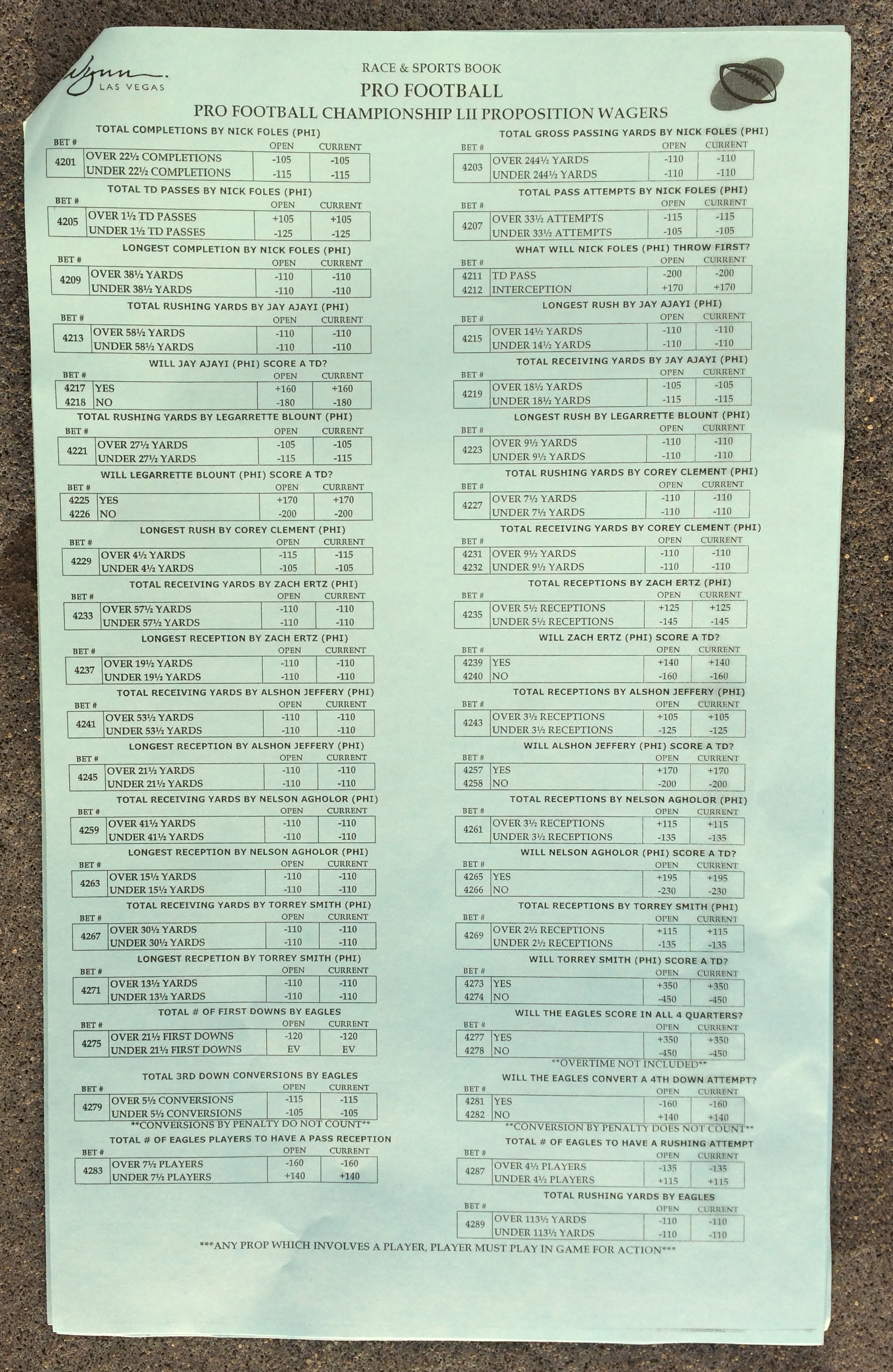 Ниже представлены фотографии всех страниц с ставками на исходы матчей в нескольких букмекерских конторах Лас-Вегаса. Эти листы были собраны 27 января 2018 года, за восемь дней до игры.