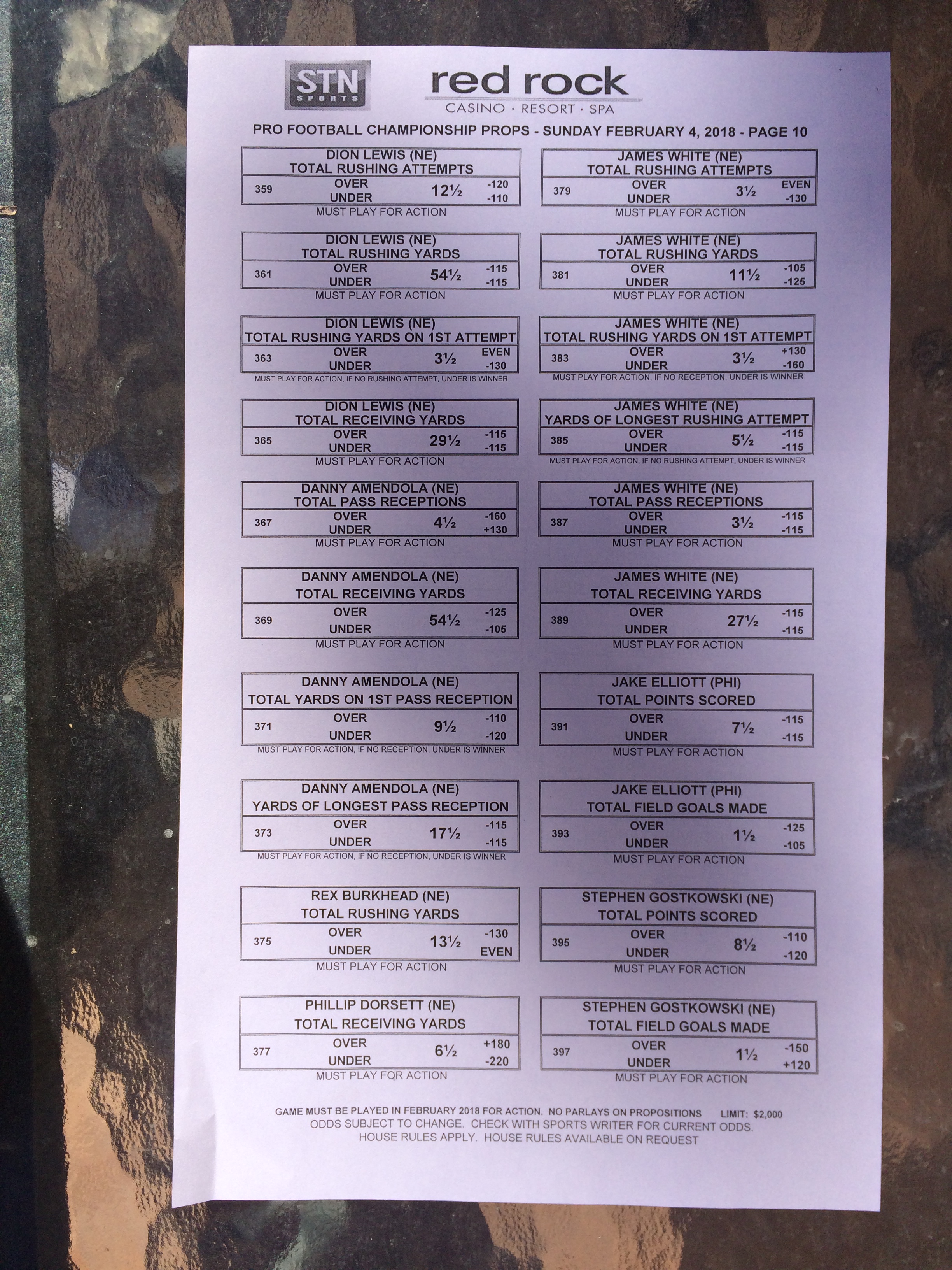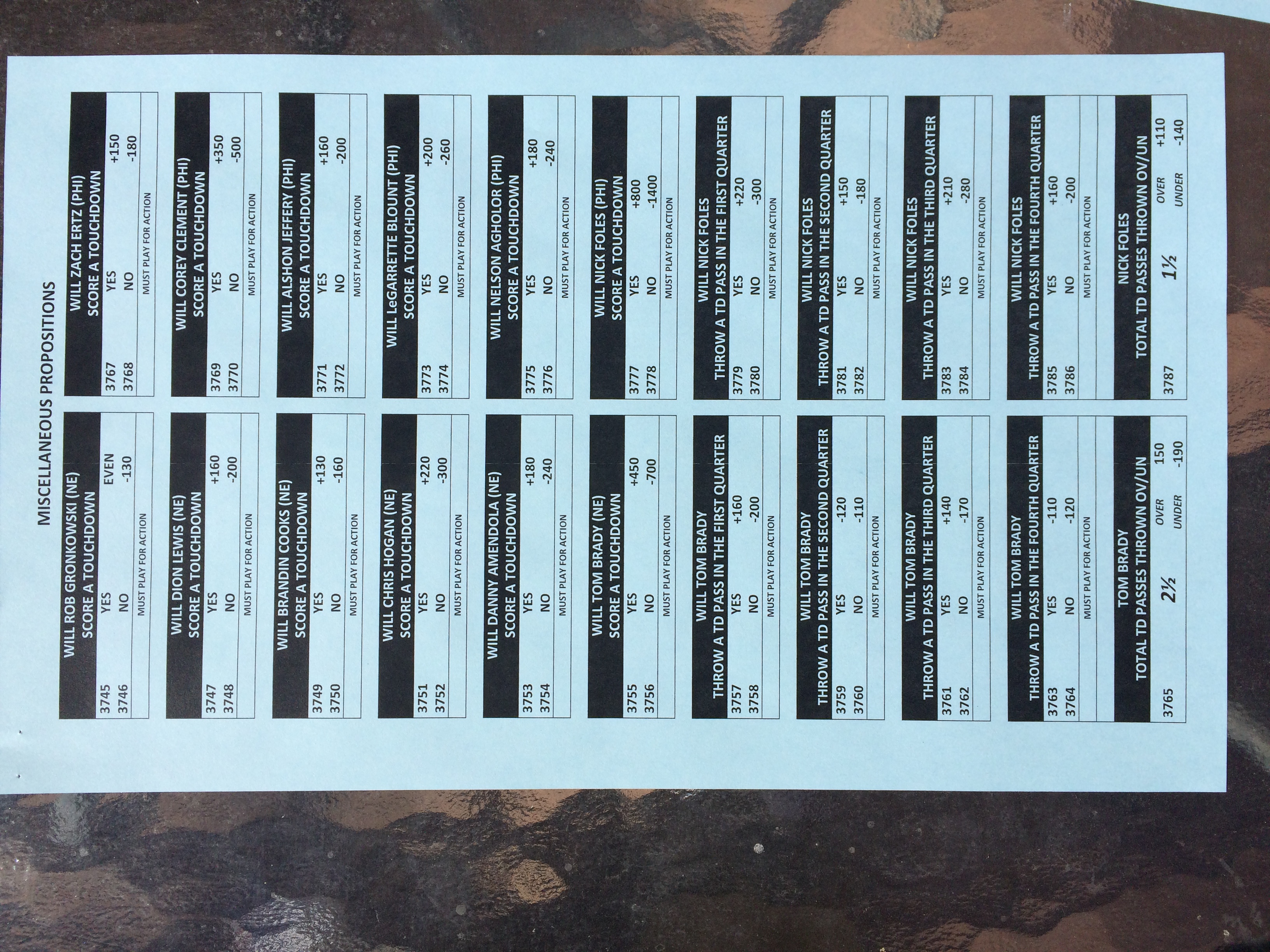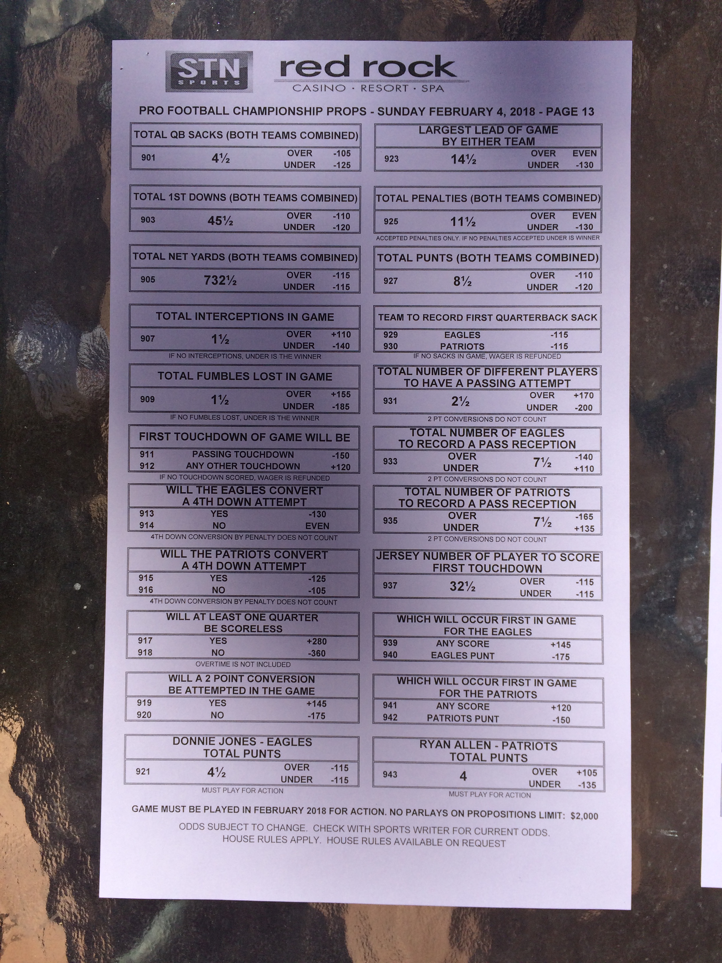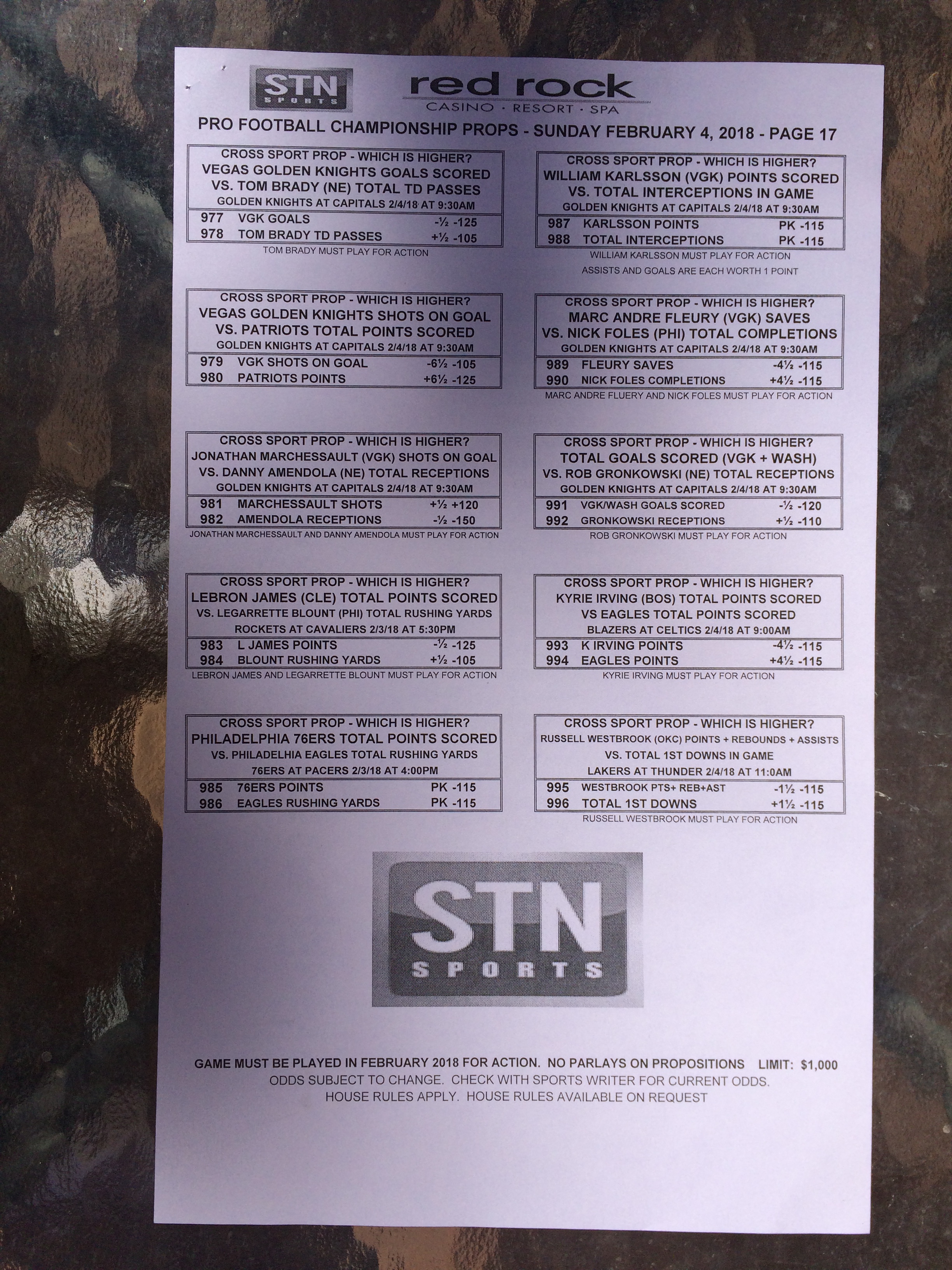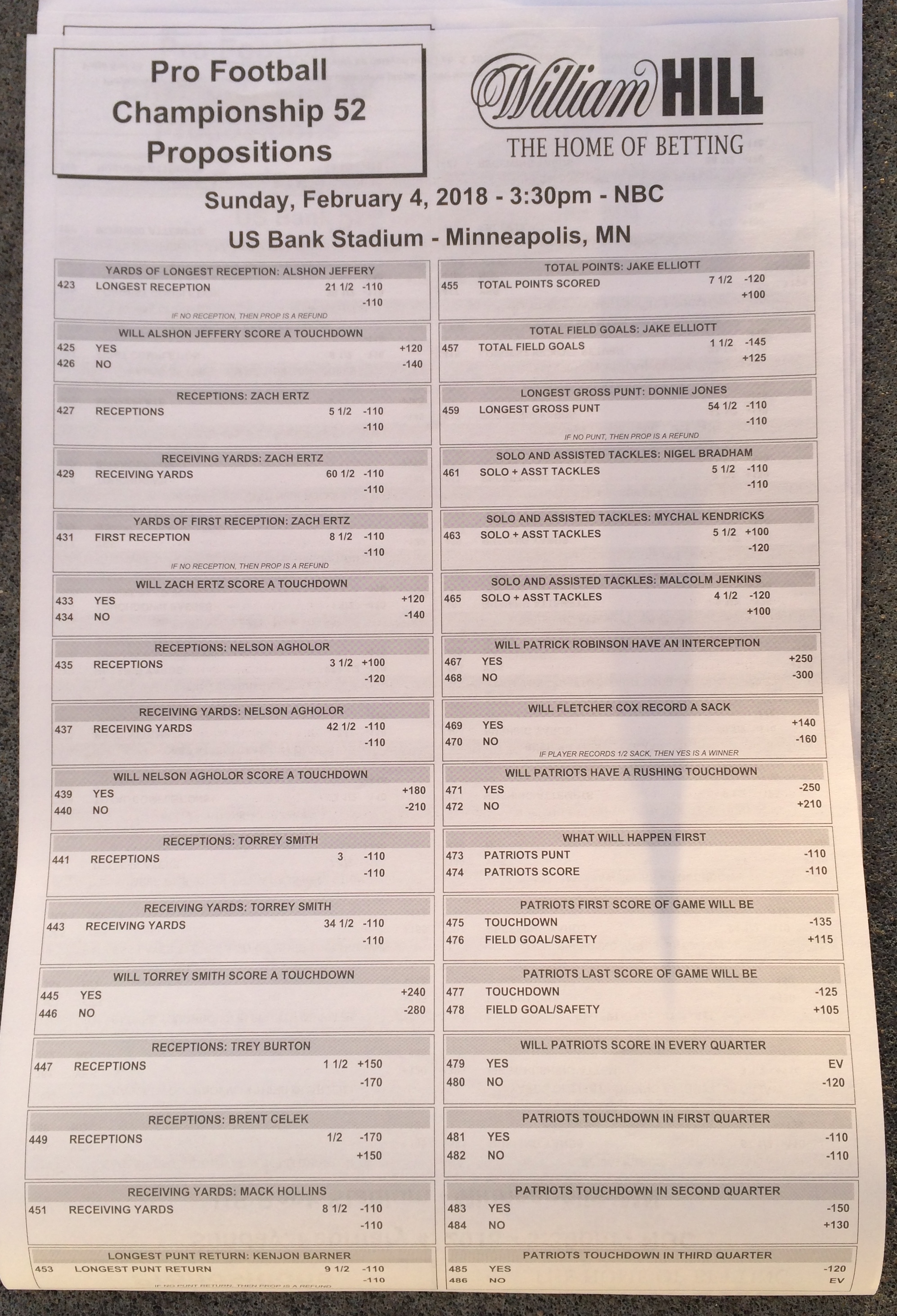 Ниже представлены фотографии всех страниц с ставками на исходы матчей в нескольких букмекерских конторах Лас-Вегаса. Эти листы были собраны 27 января 2018 года, за восемь дней до игры.