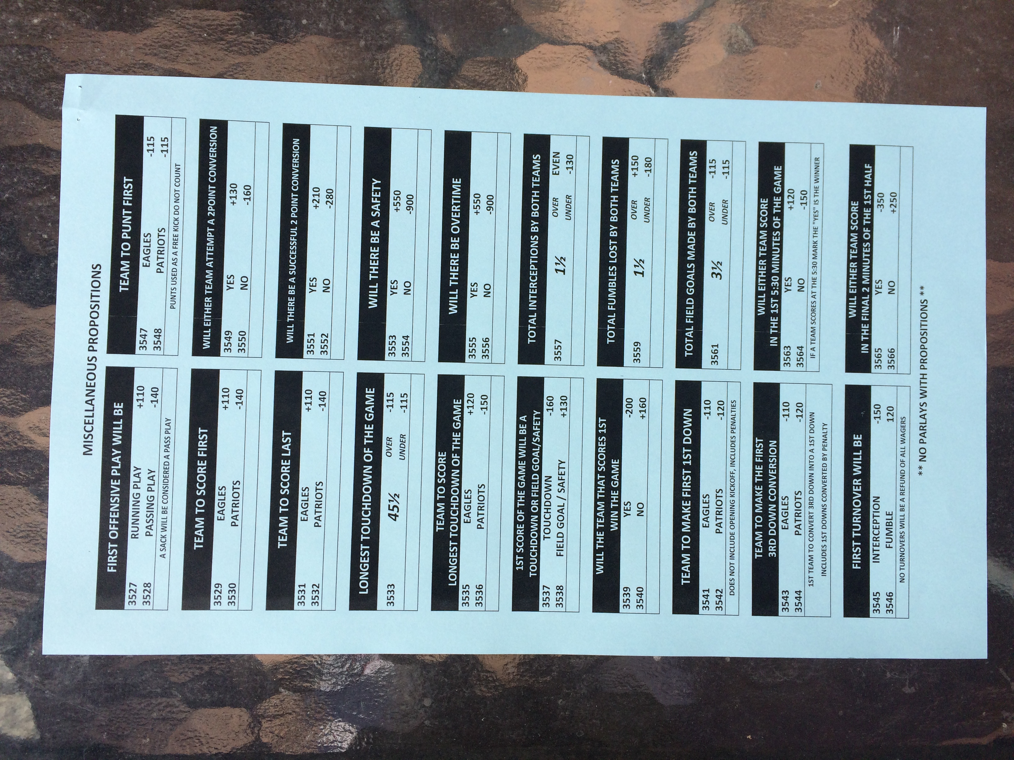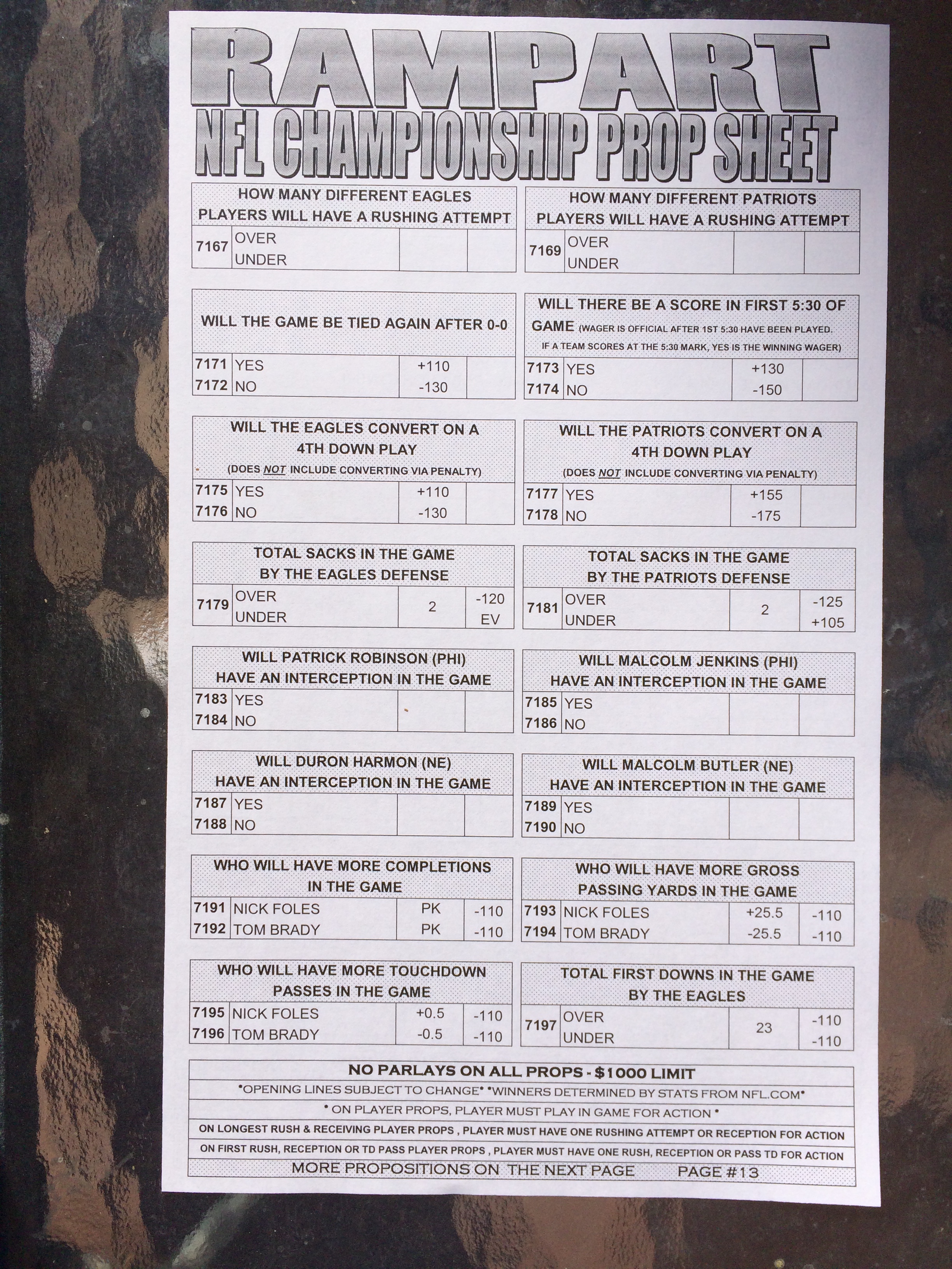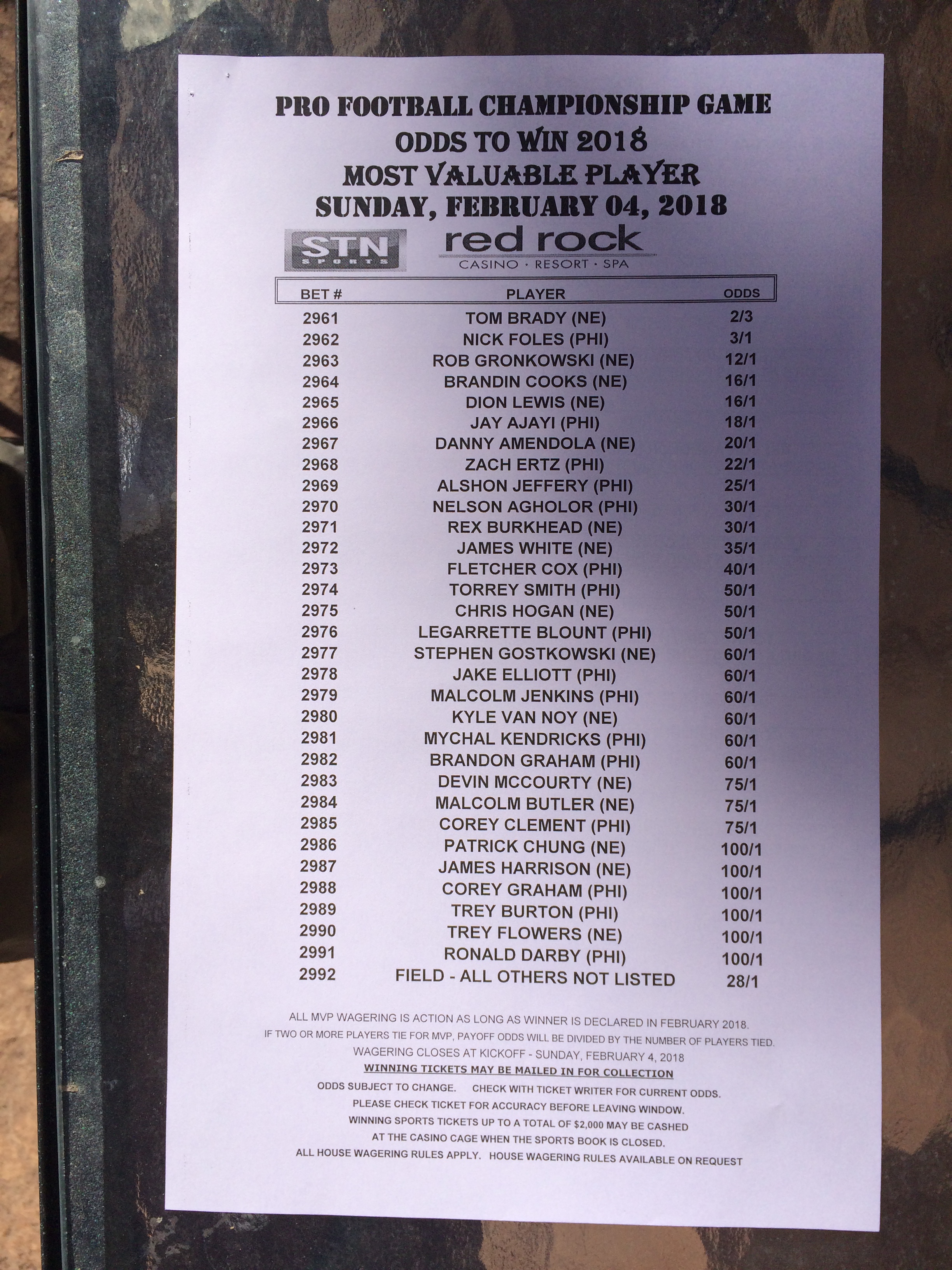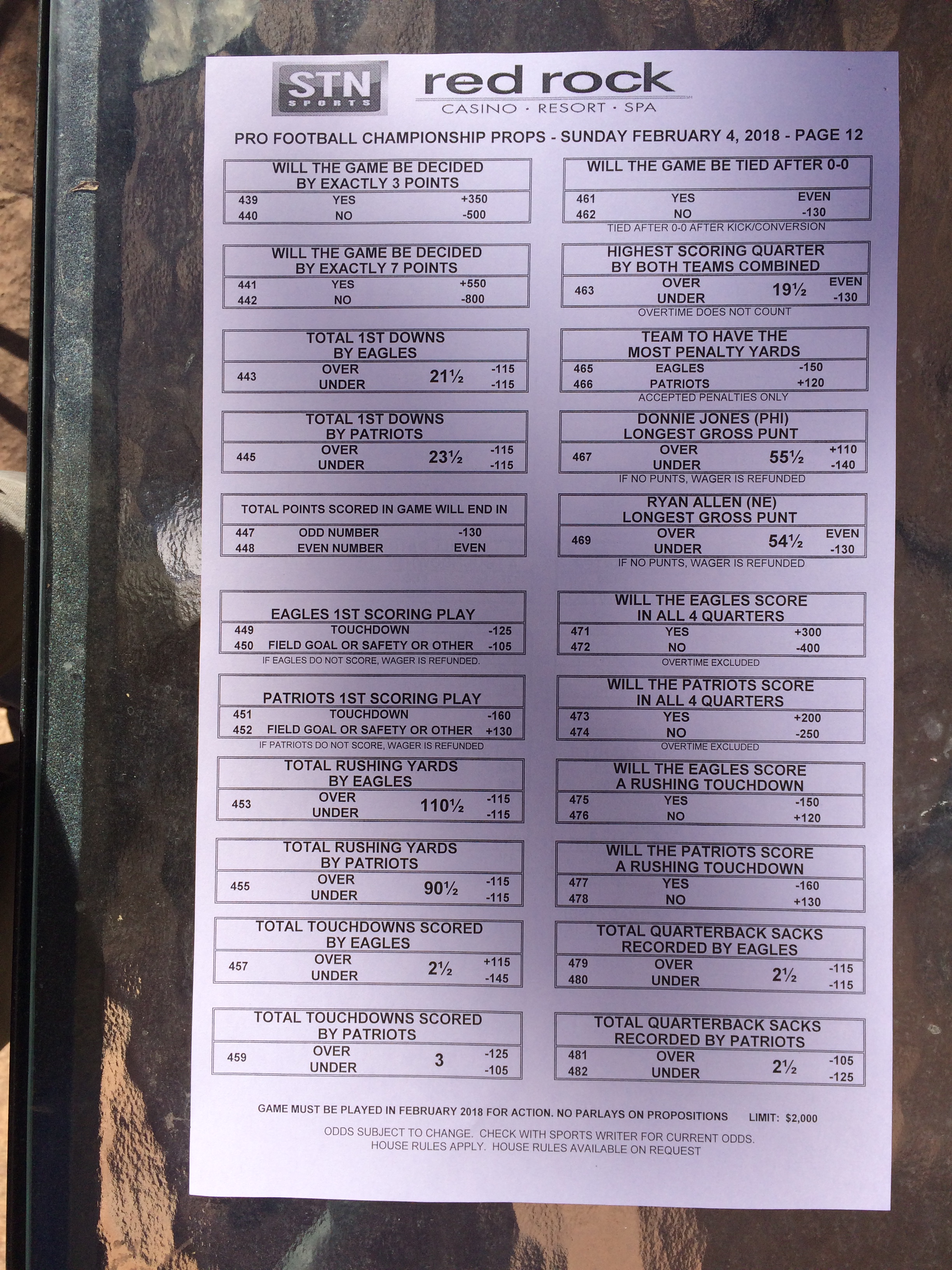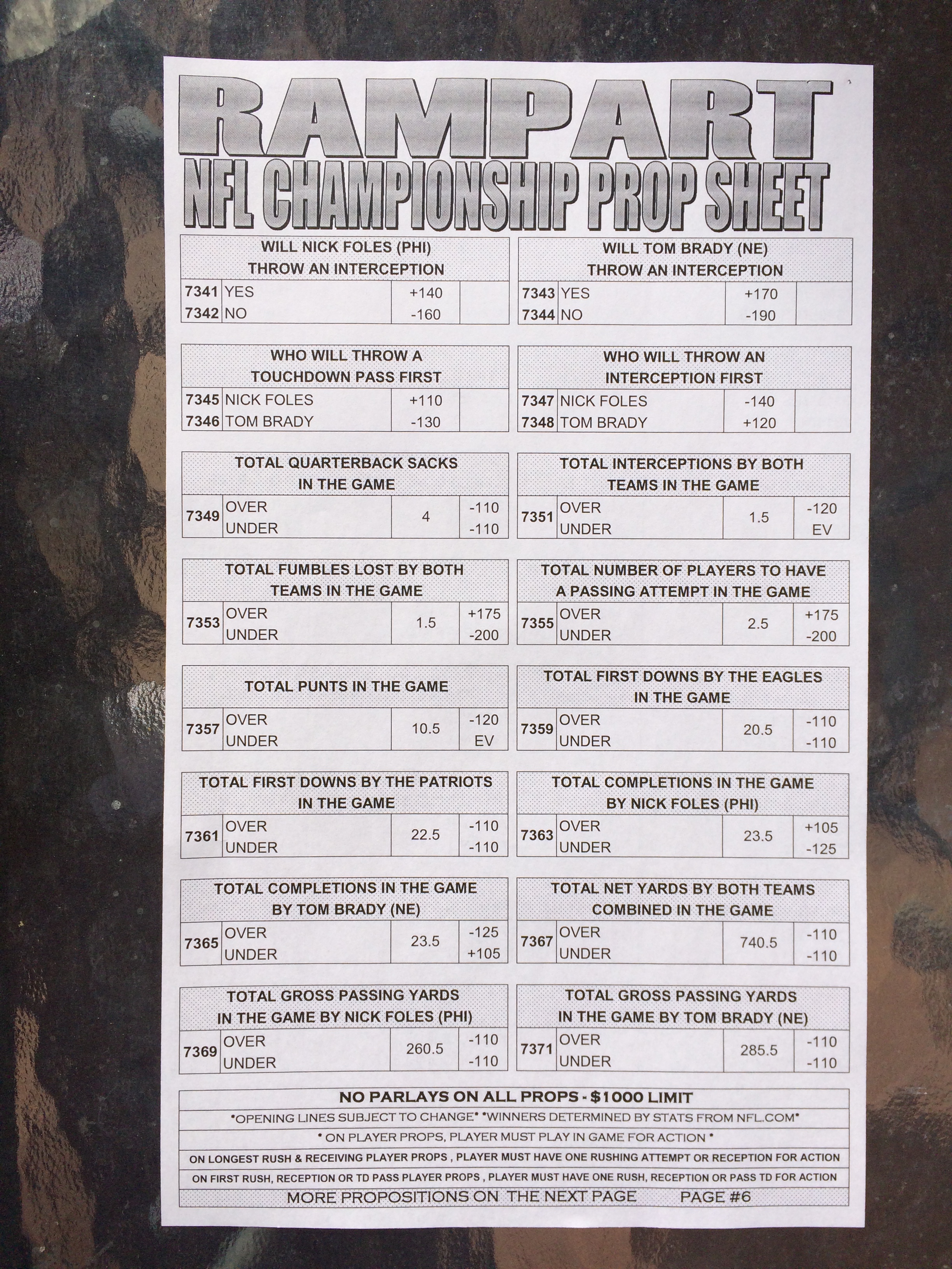 Ниже представлены фотографии всех страниц с ставками на исходы матчей в нескольких букмекерских конторах Лас-Вегаса. Эти листы были собраны 27 января 2018 года, за восемь дней до игры.