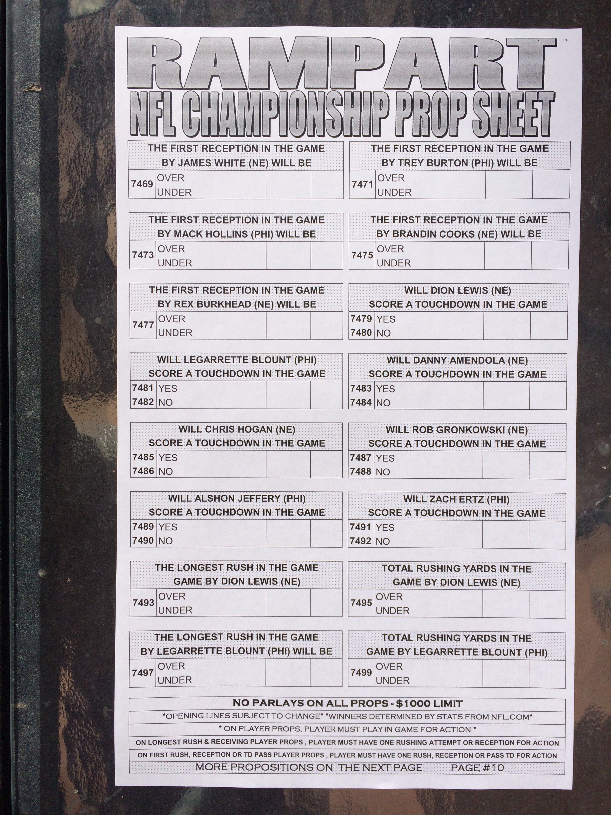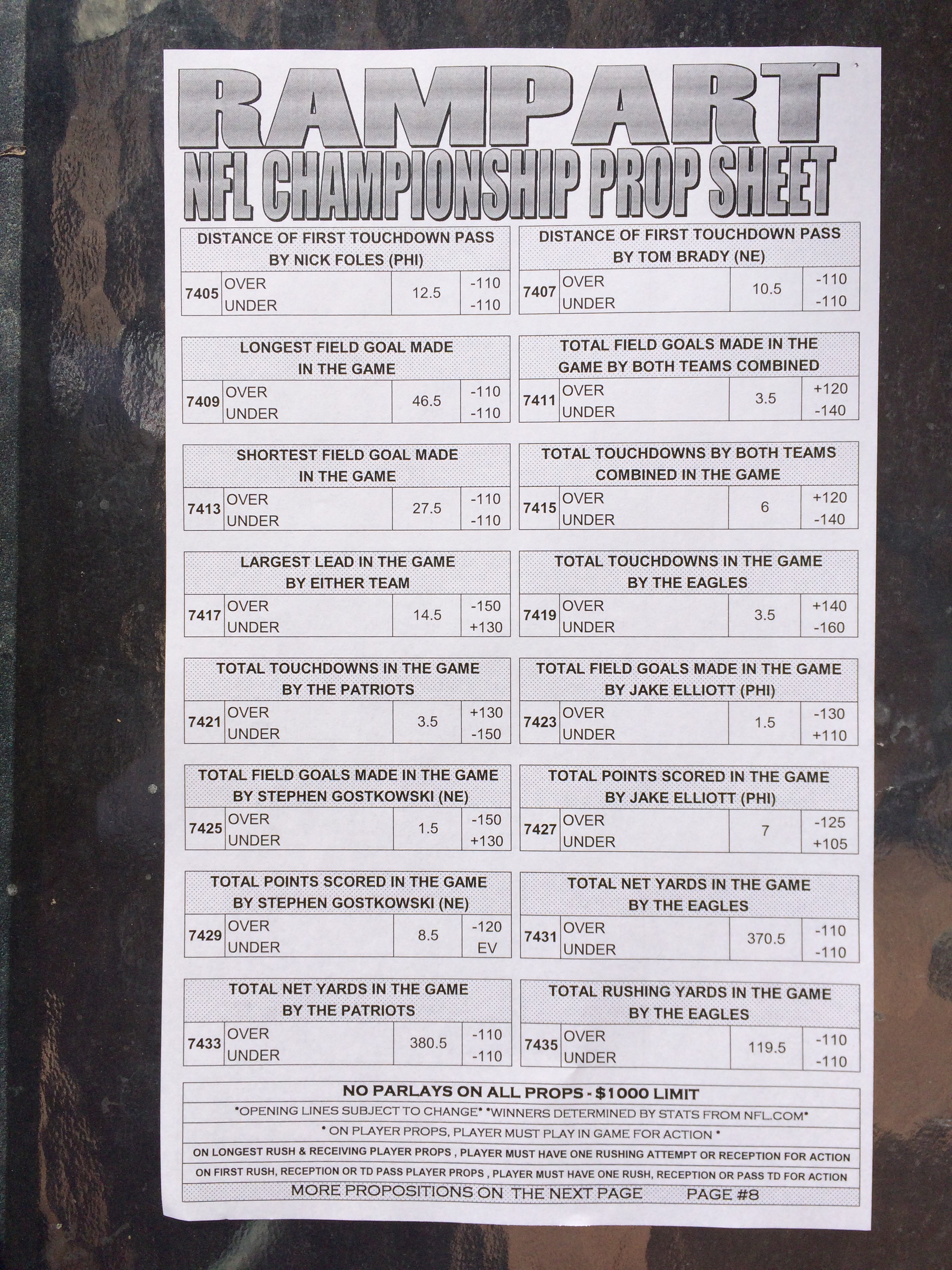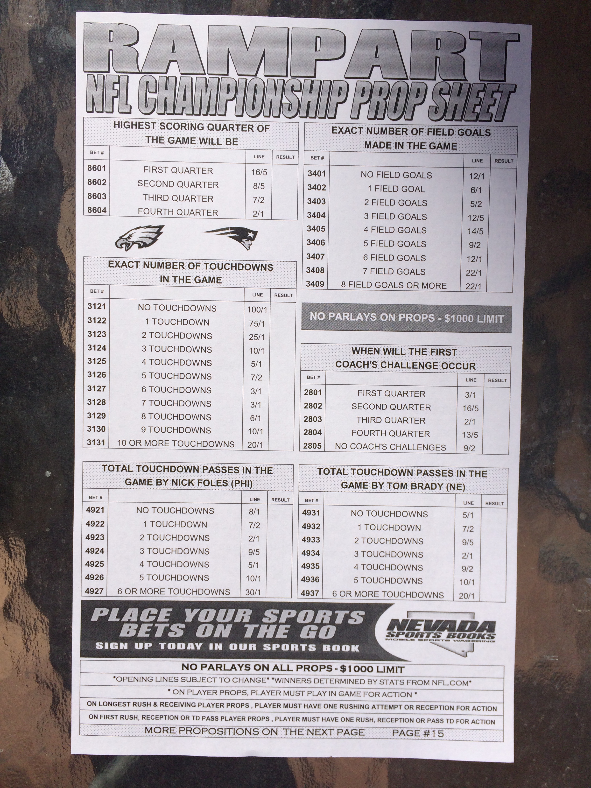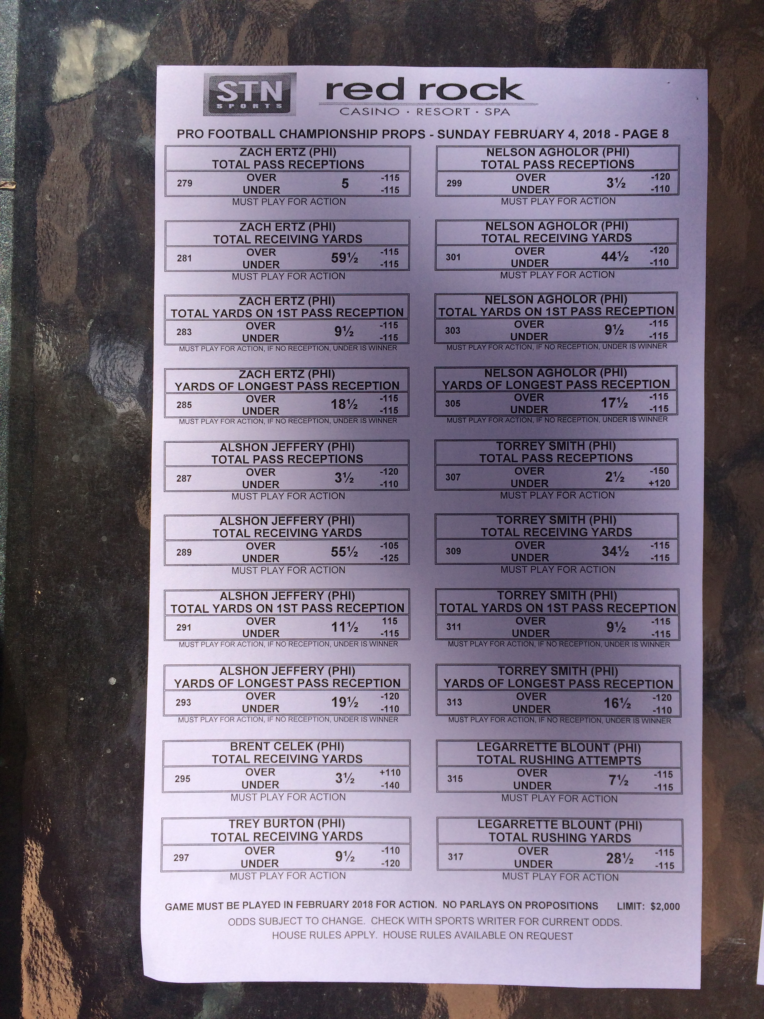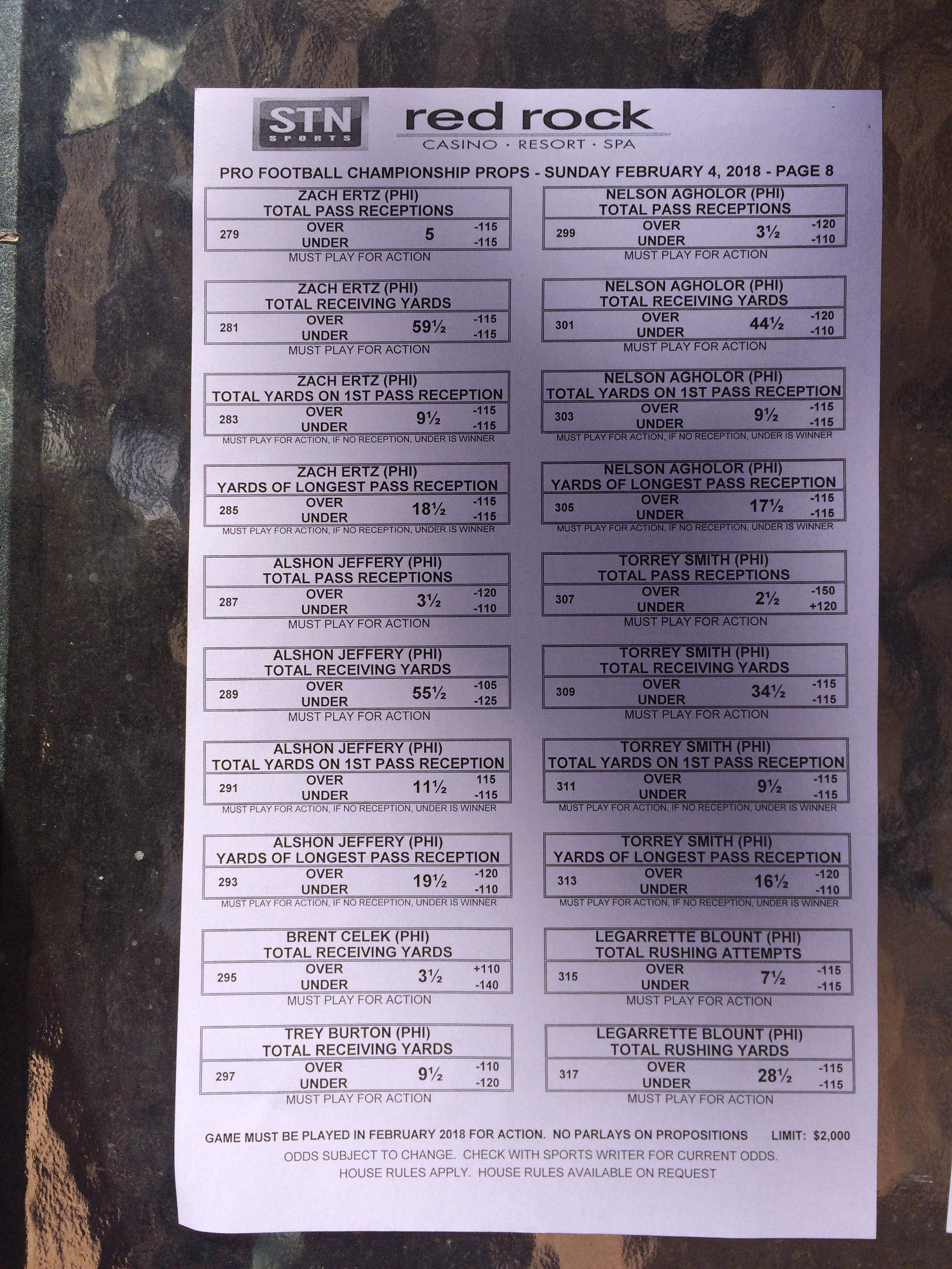 Ниже представлены фотографии всех страниц с ставками на исходы матчей в нескольких букмекерских конторах Лас-Вегаса. Эти листы были собраны 27 января 2018 года, за восемь дней до игры.