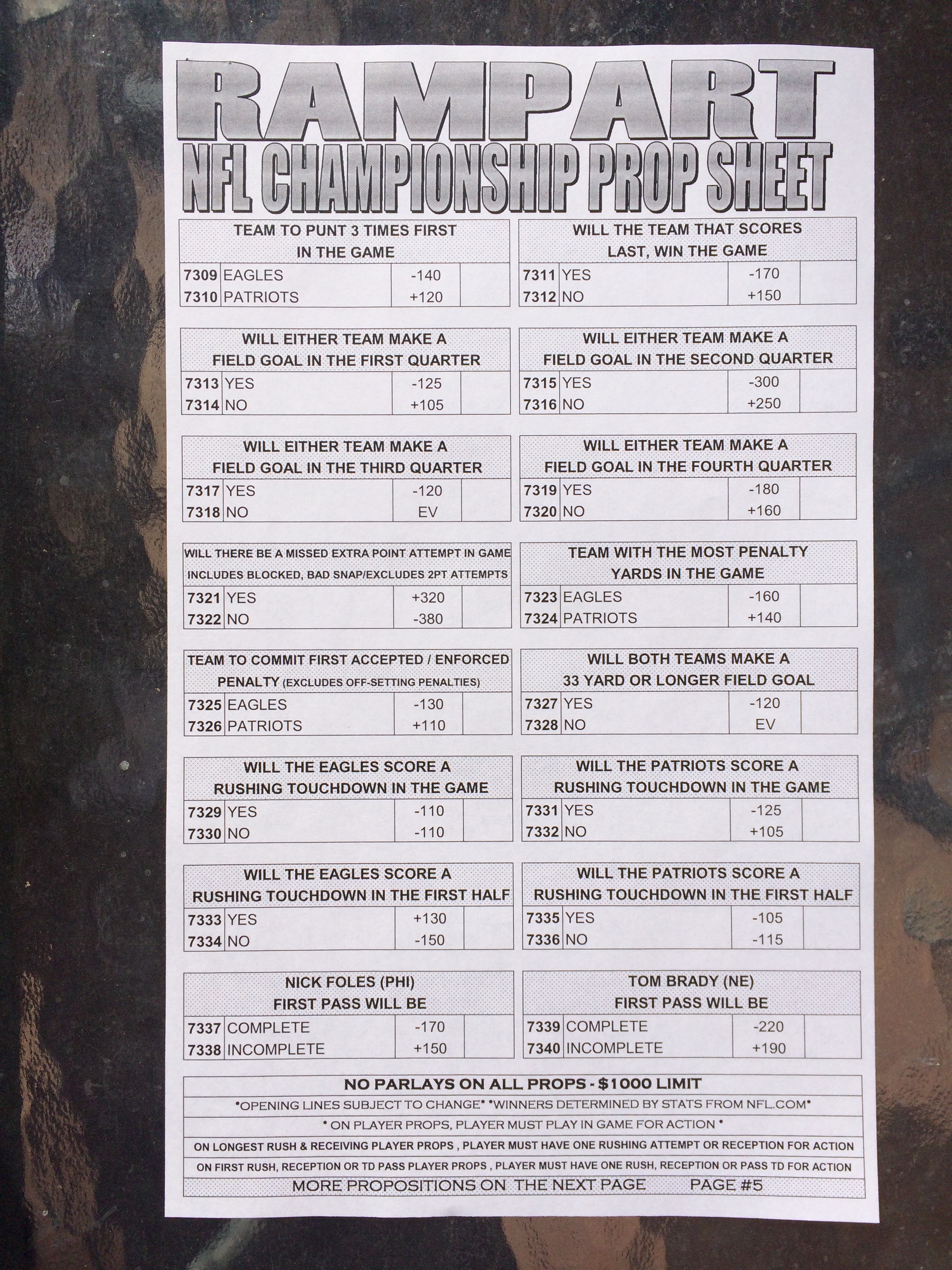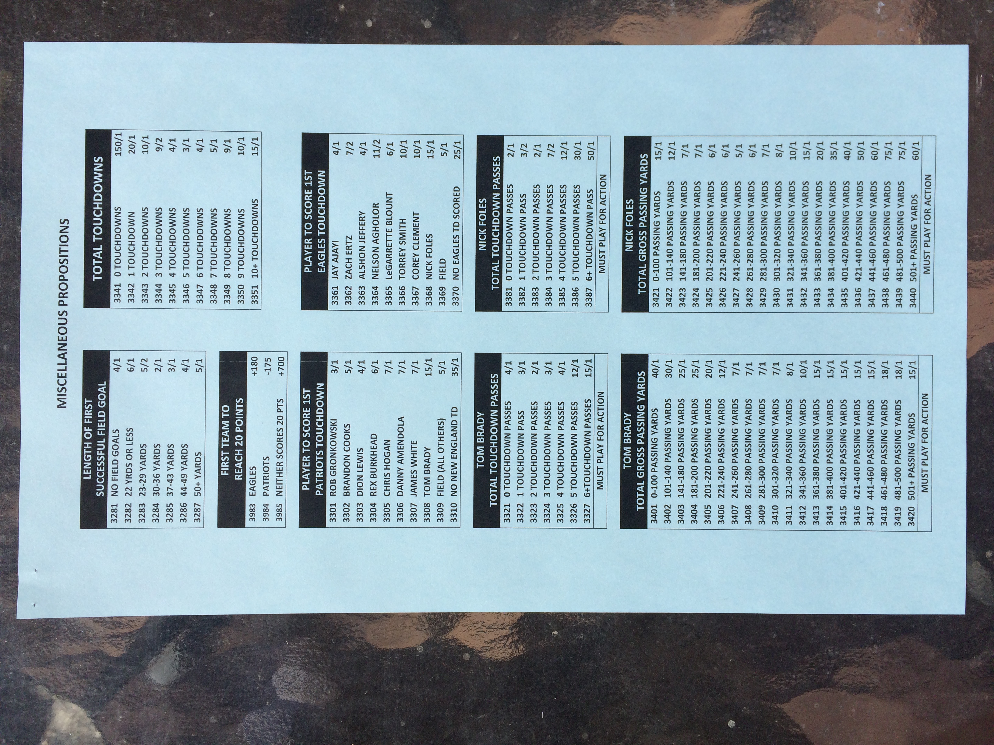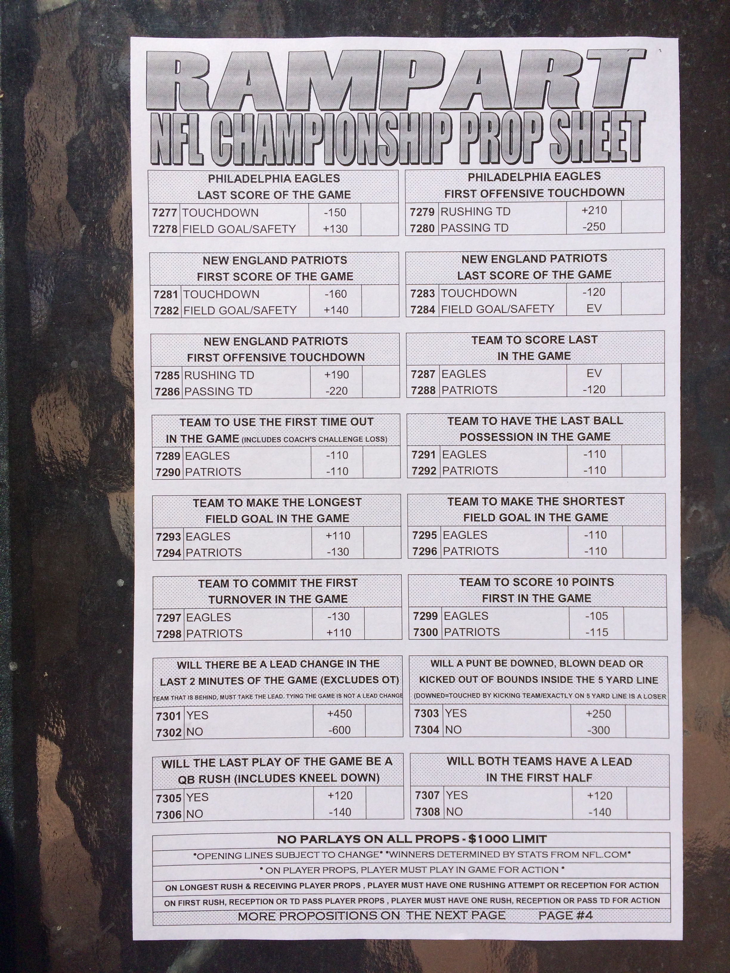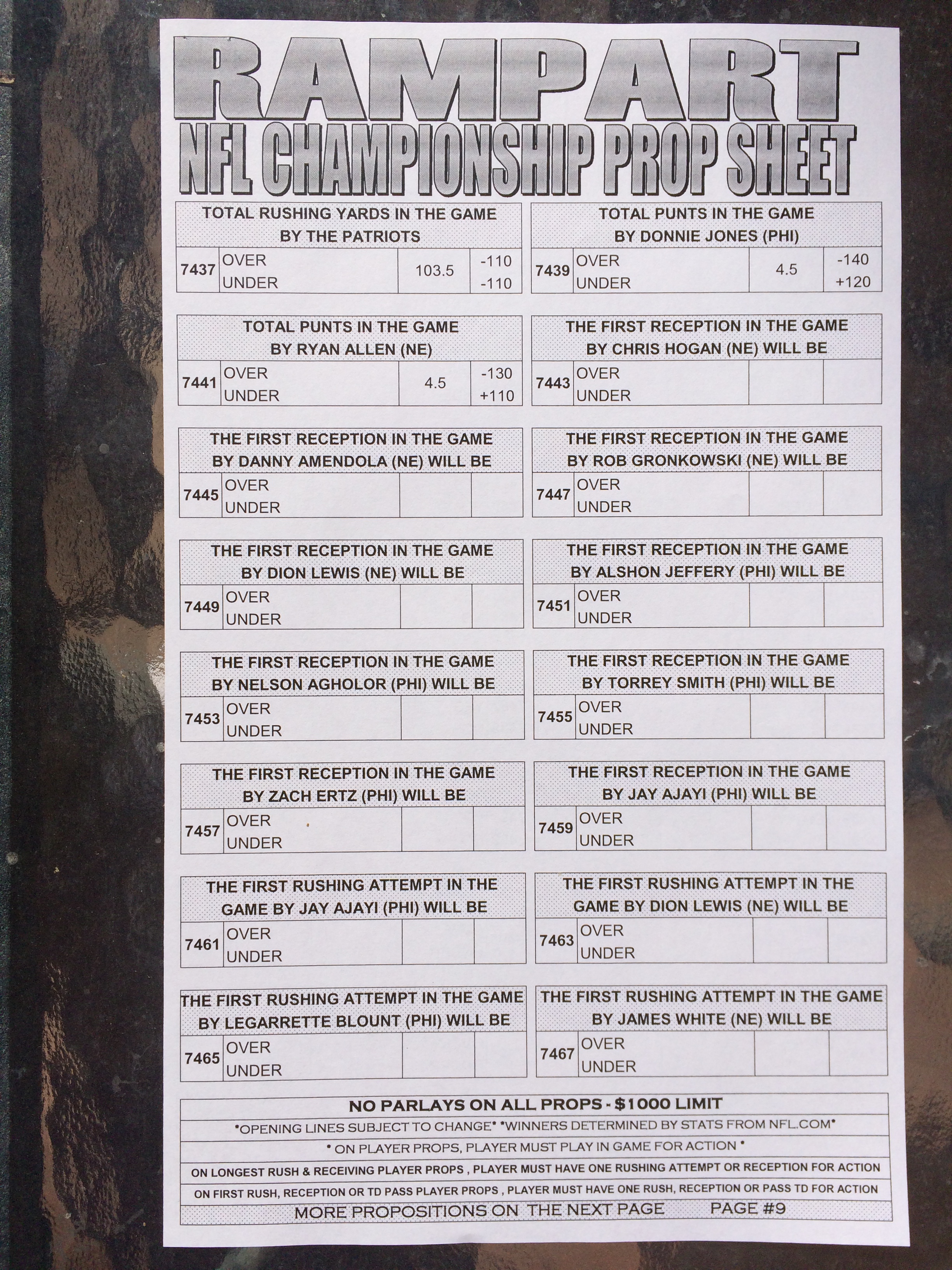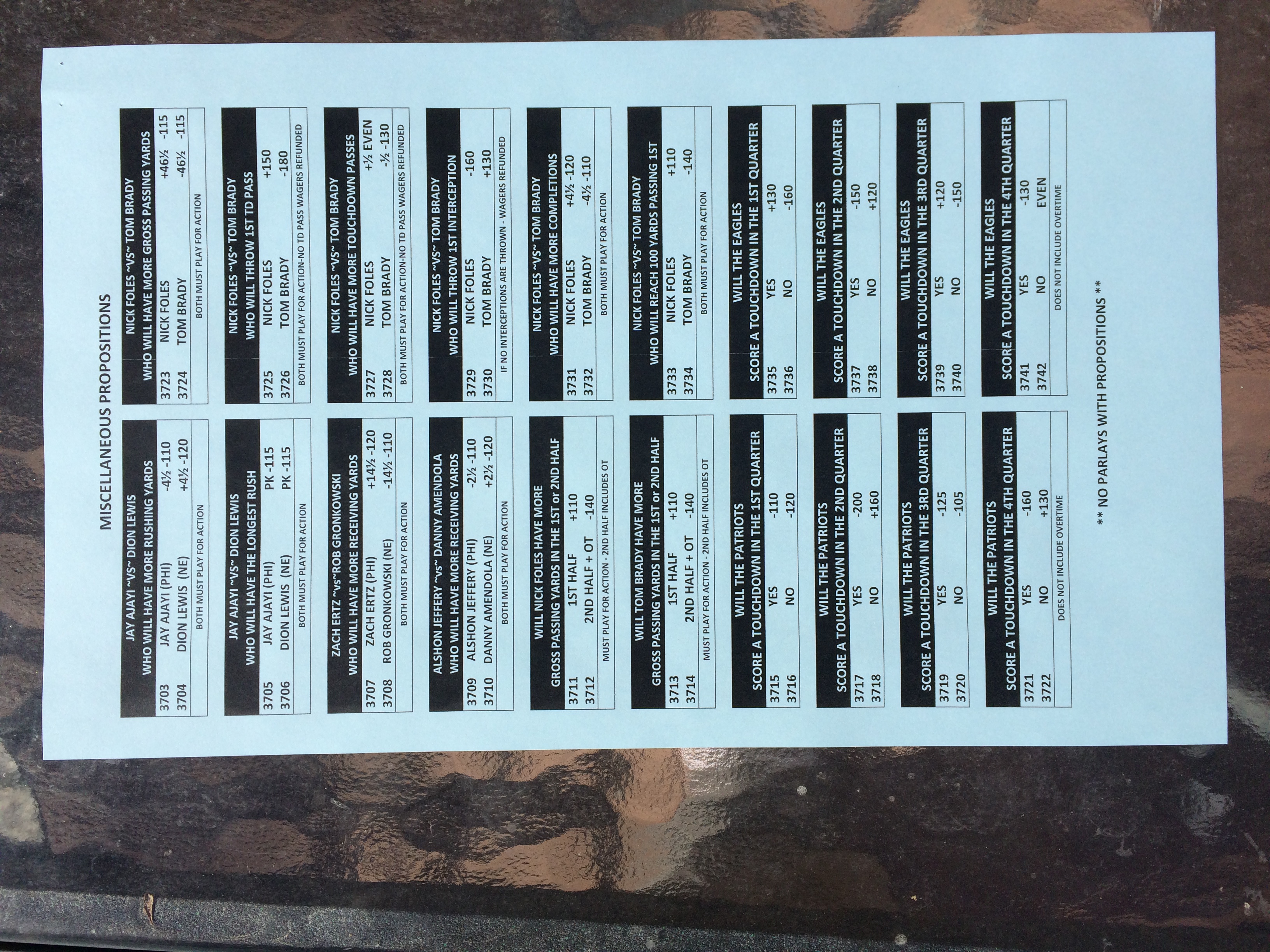 Ниже представлены фотографии всех страниц с ставками на исходы матчей в нескольких букмекерских конторах Лас-Вегаса. Эти листы были собраны 27 января 2018 года, за восемь дней до игры.