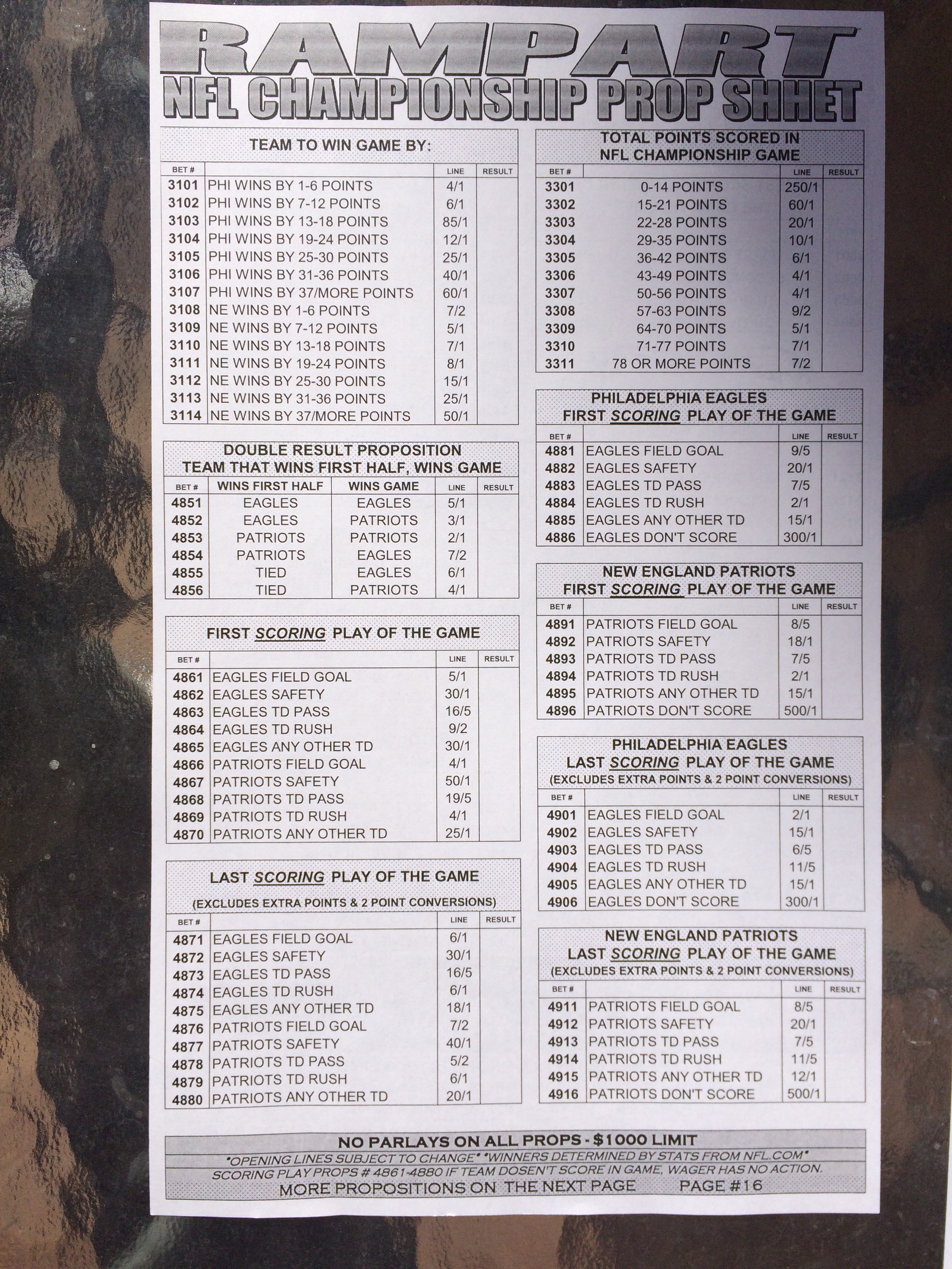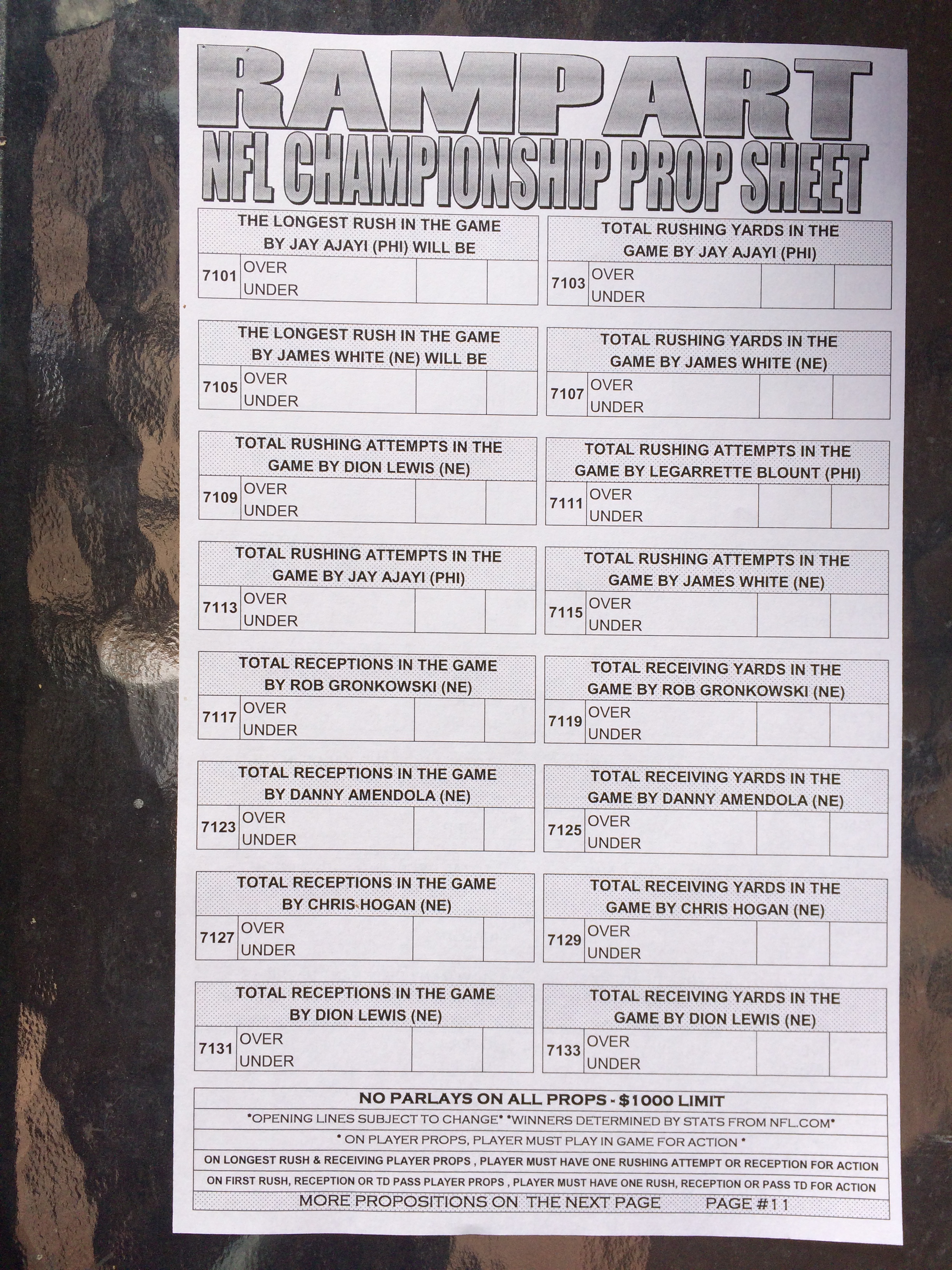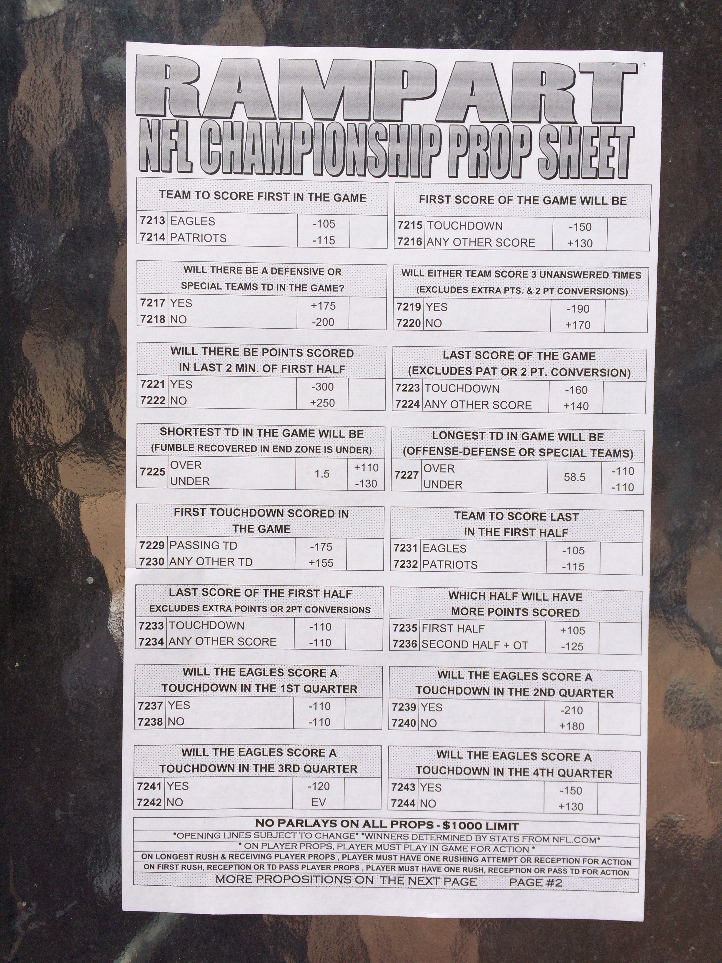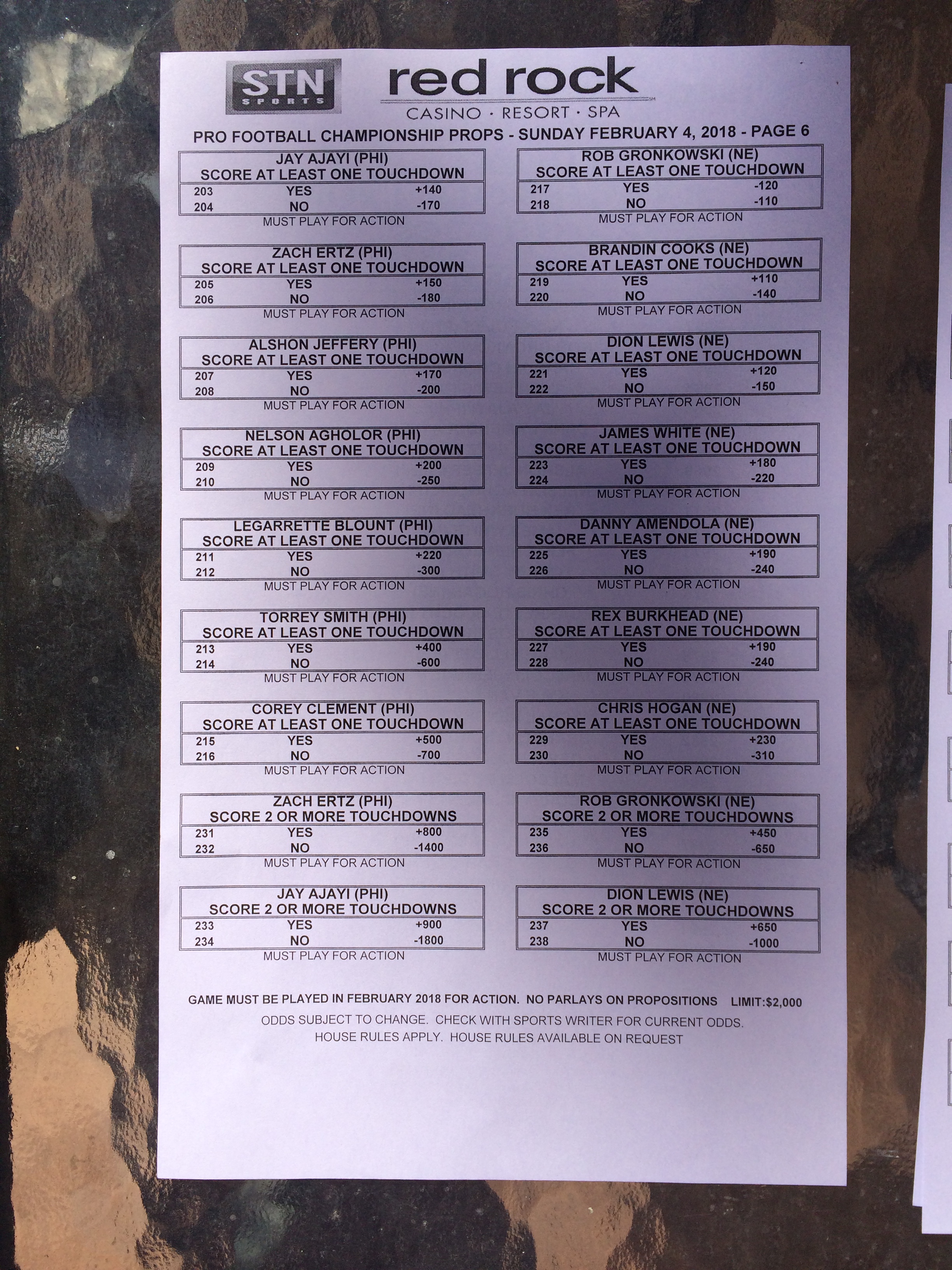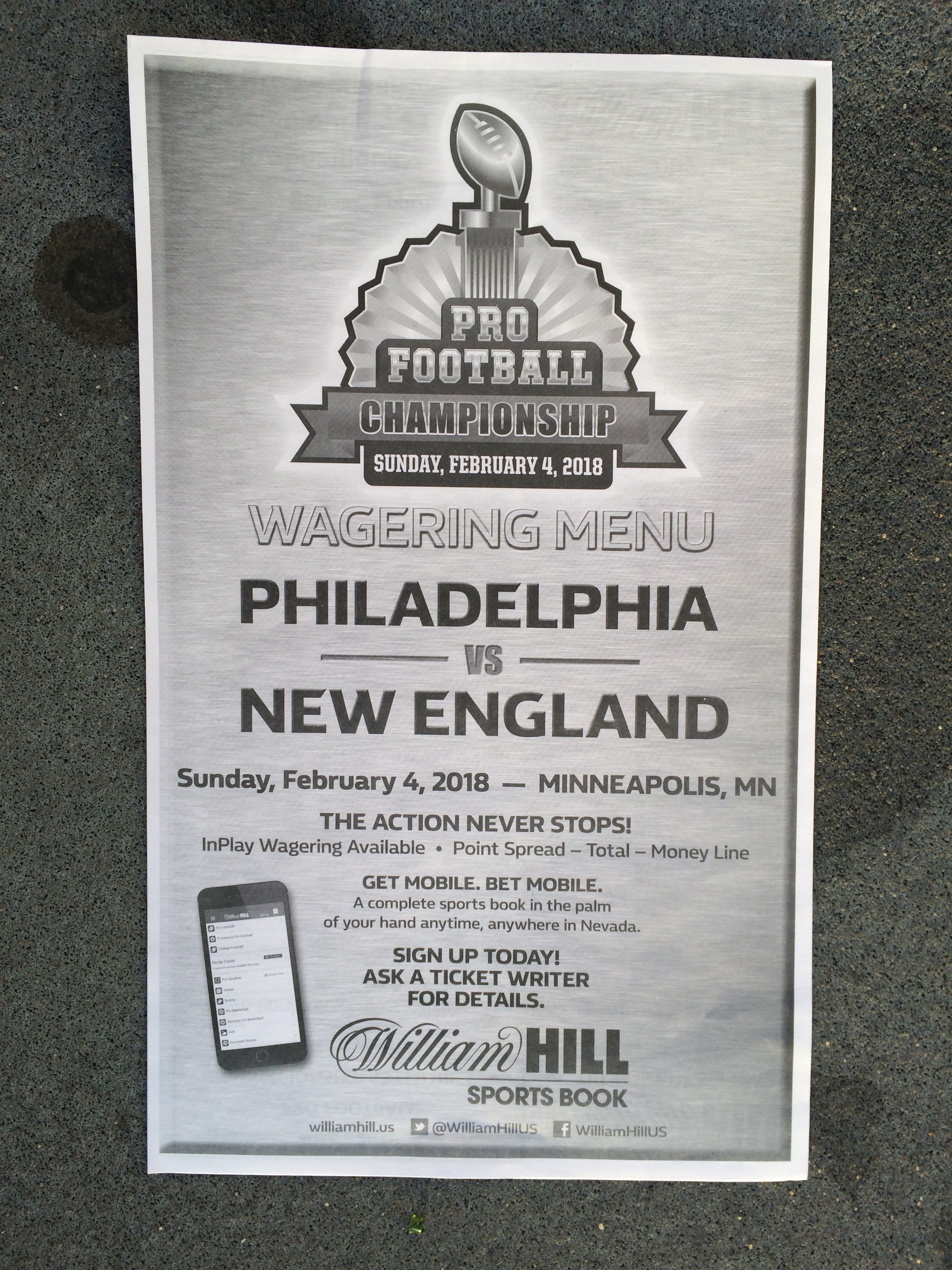 Ниже представлены фотографии всех страниц с ставками на исходы матчей в нескольких букмекерских конторах Лас-Вегаса. Эти листы были собраны 27 января 2018 года, за восемь дней до игры.