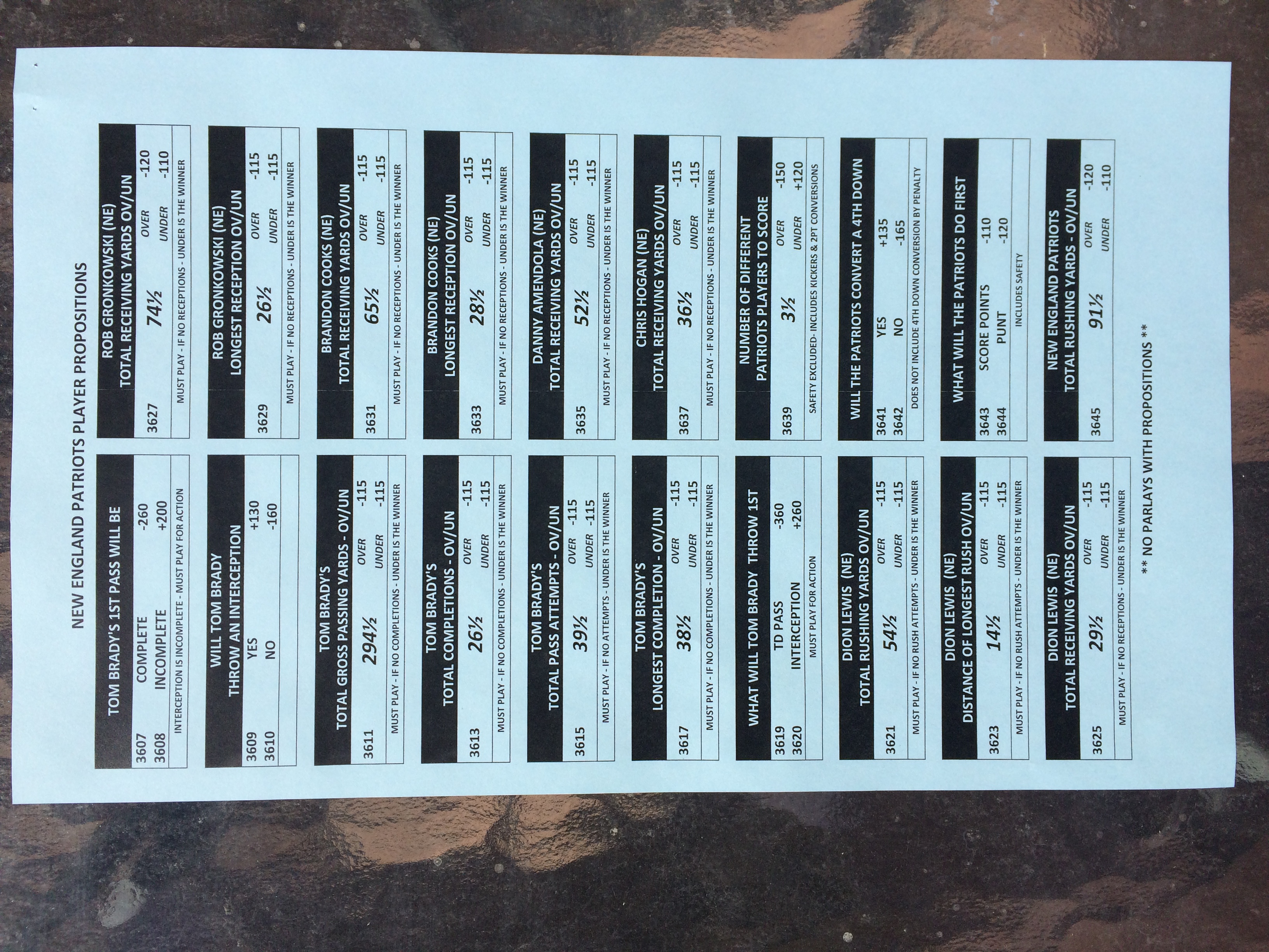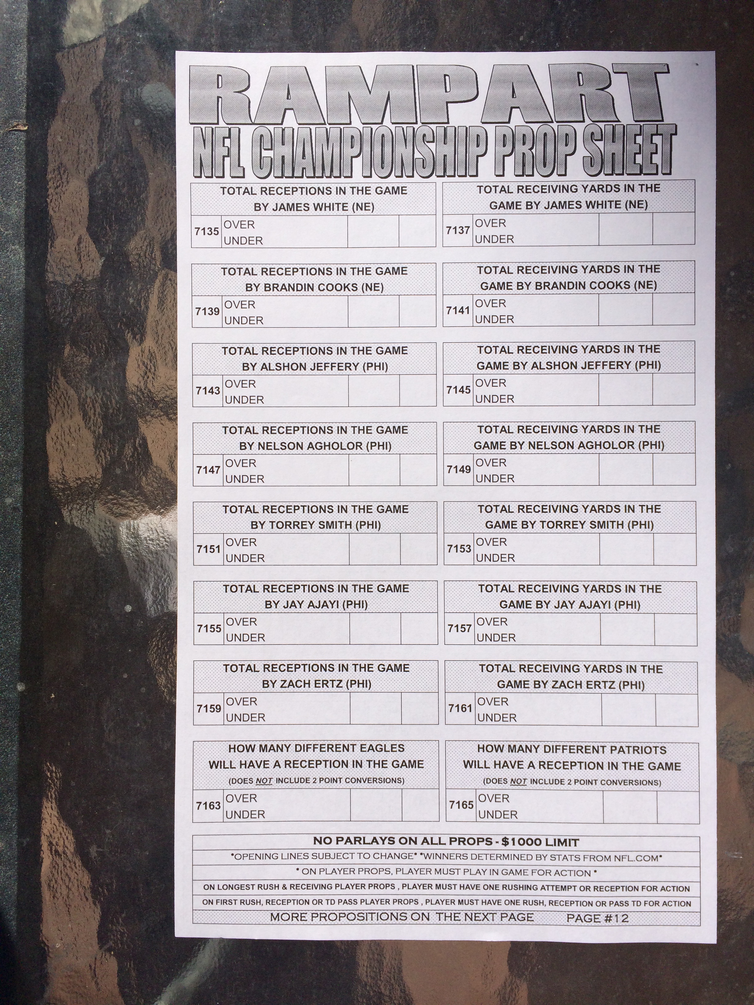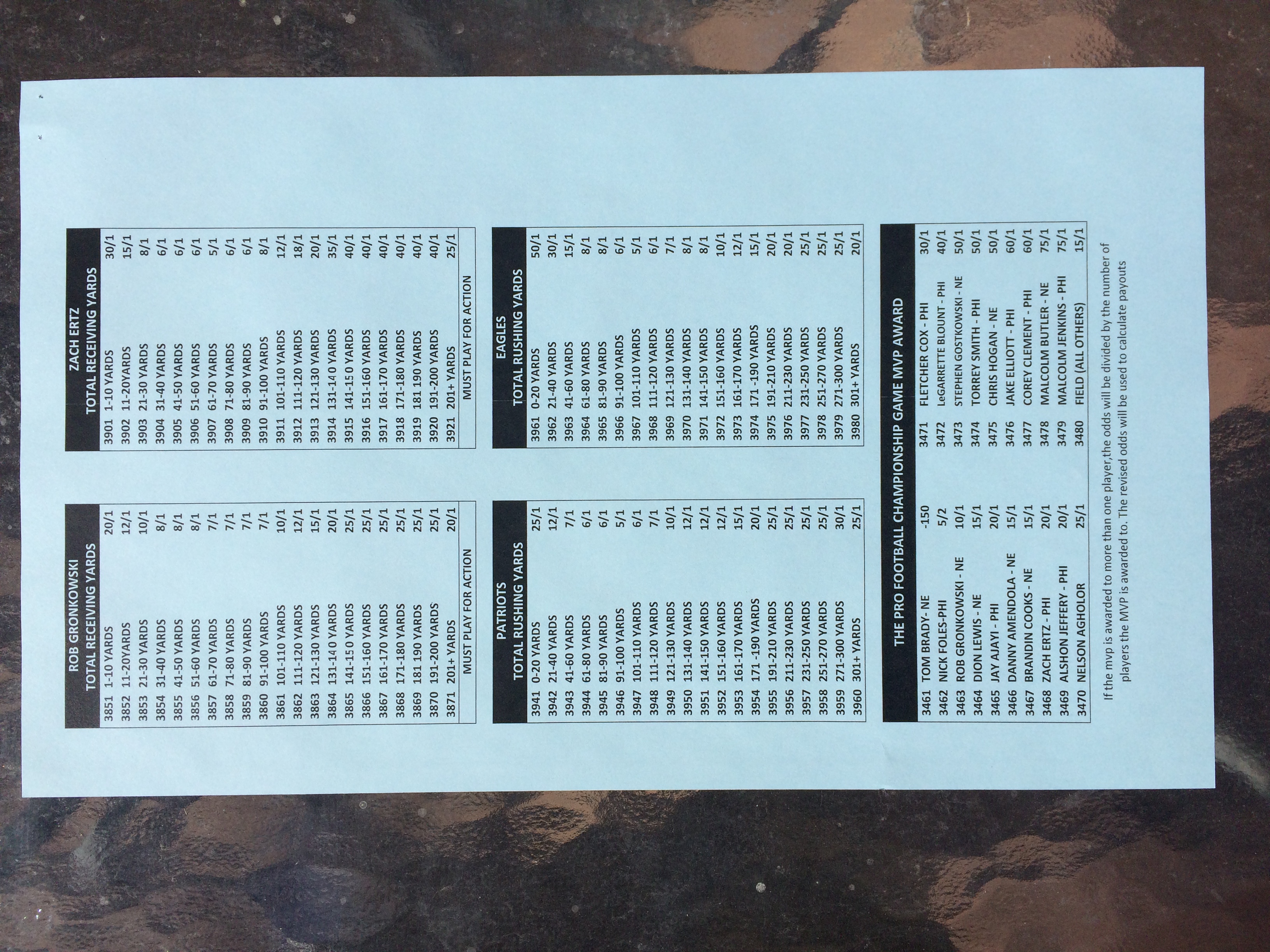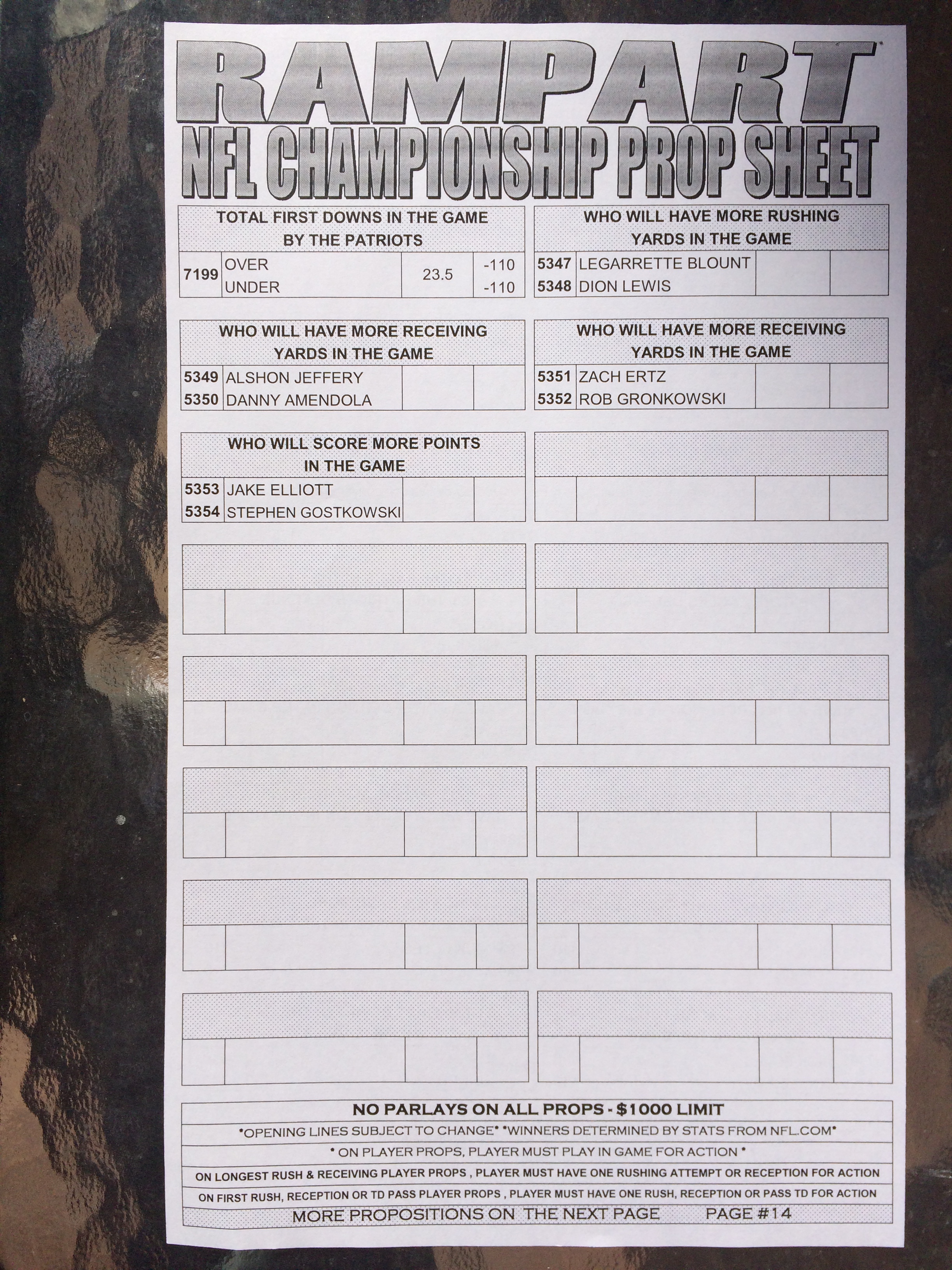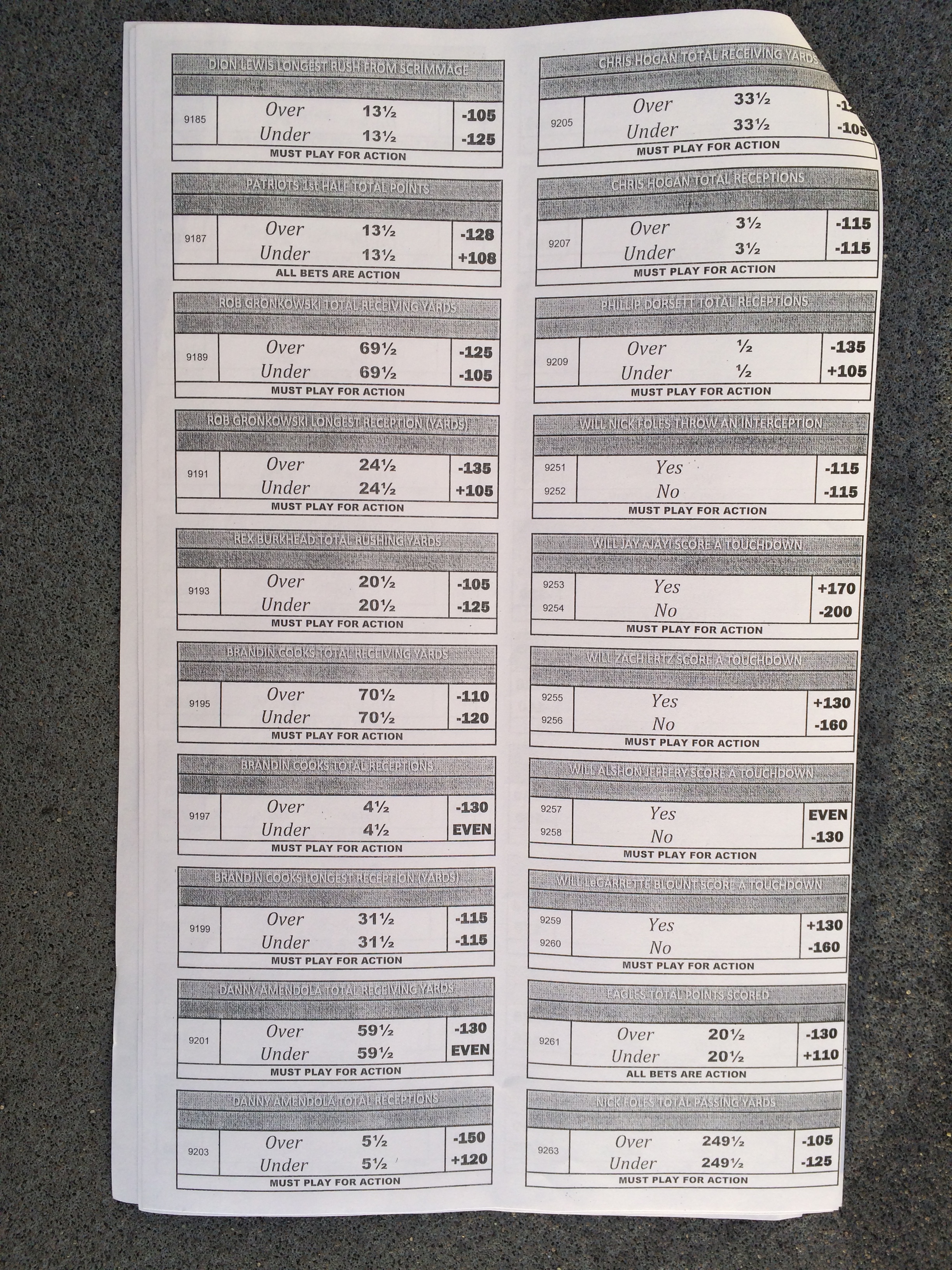 Ниже представлены фотографии всех страниц с ставками на исходы матчей в нескольких букмекерских конторах Лас-Вегаса. Эти листы были собраны 27 января 2018 года, за восемь дней до игры.