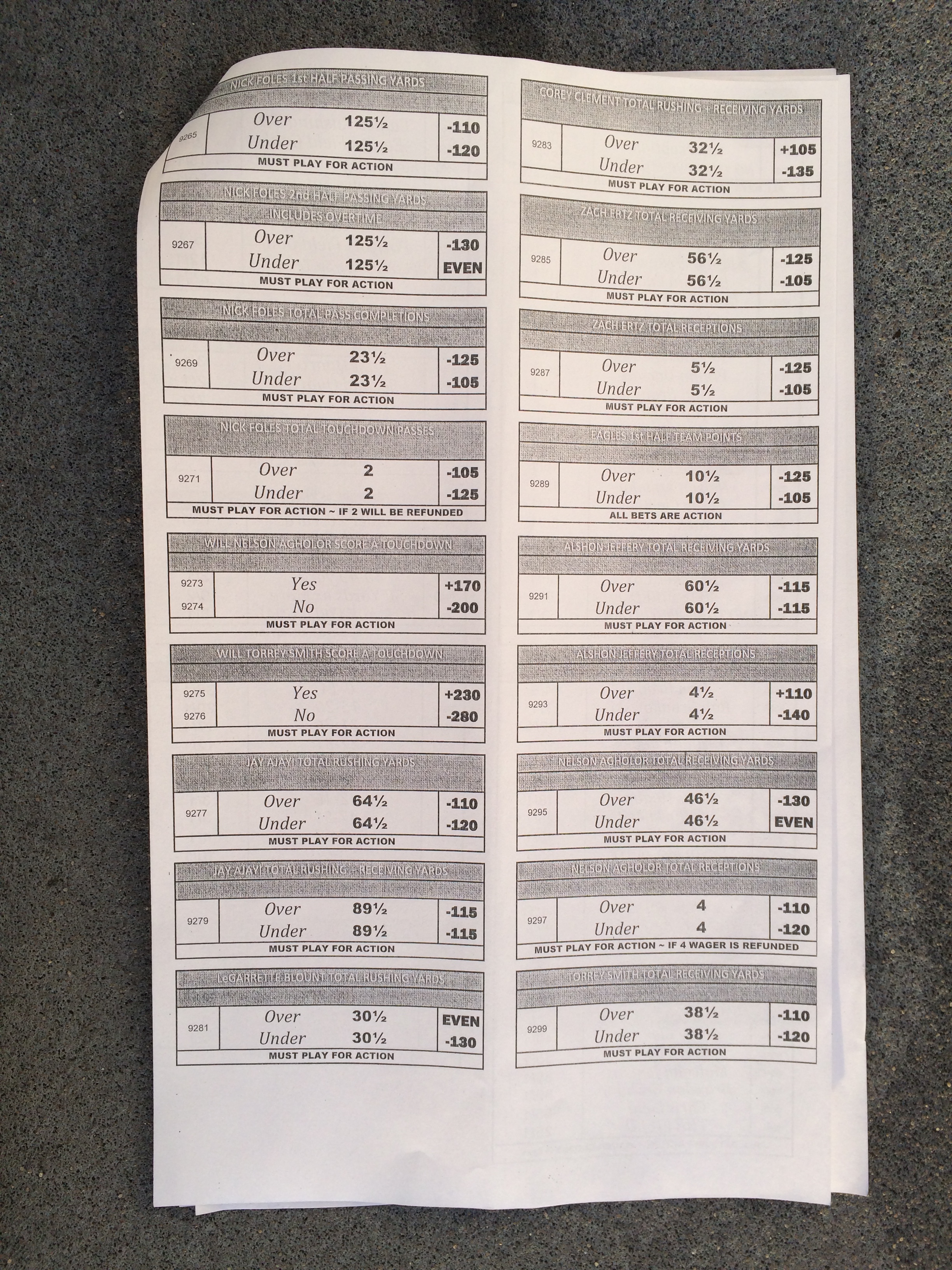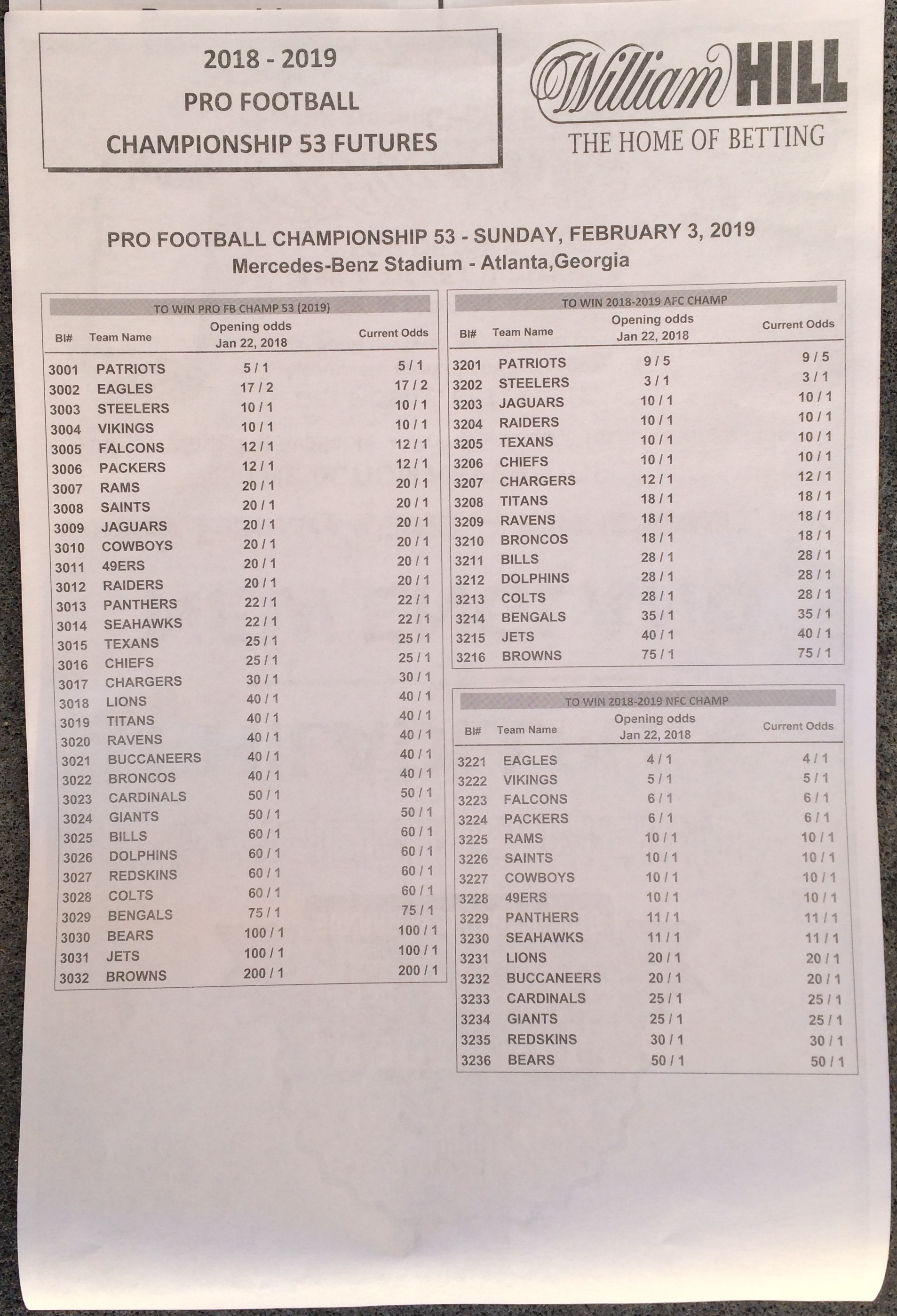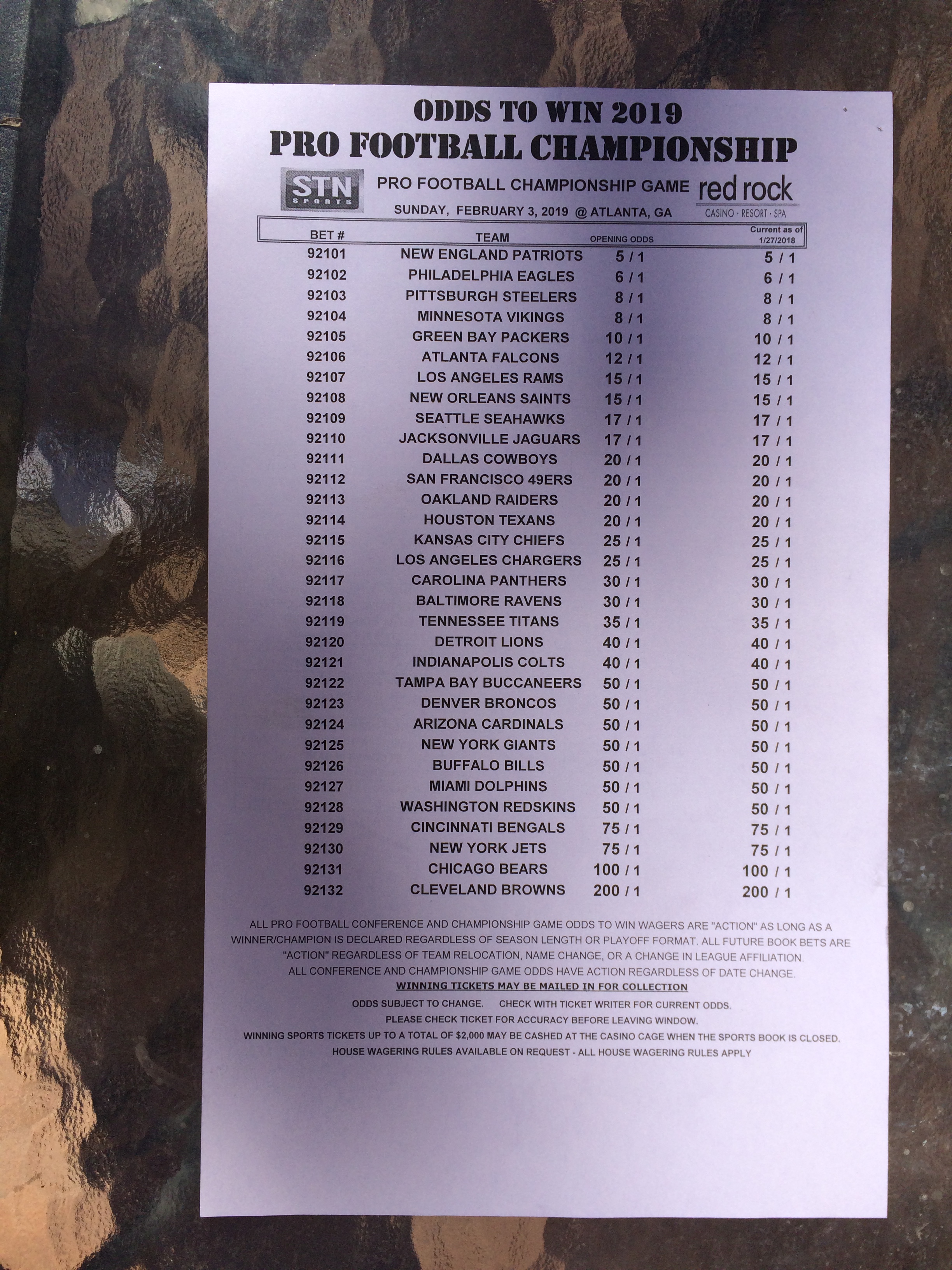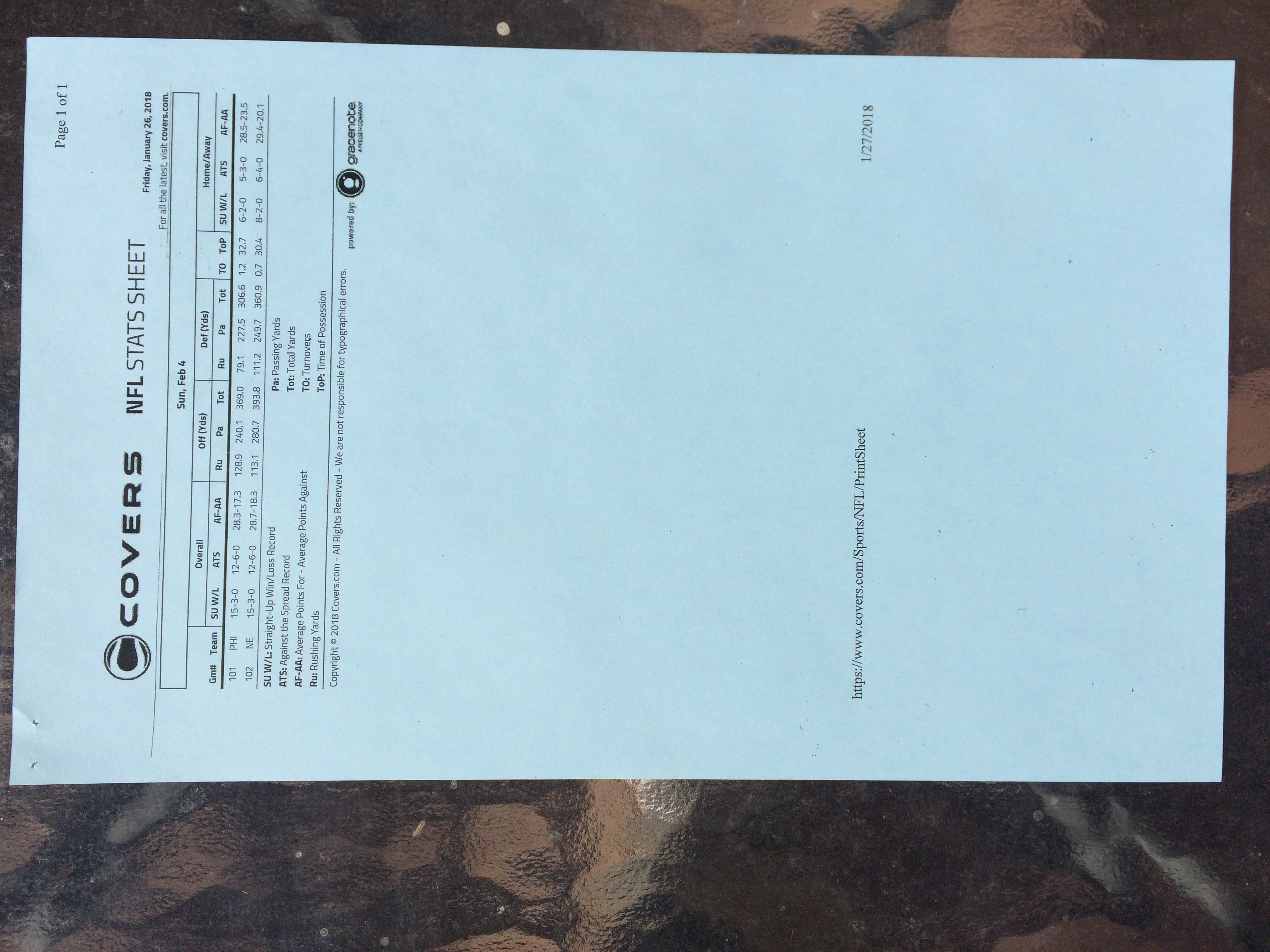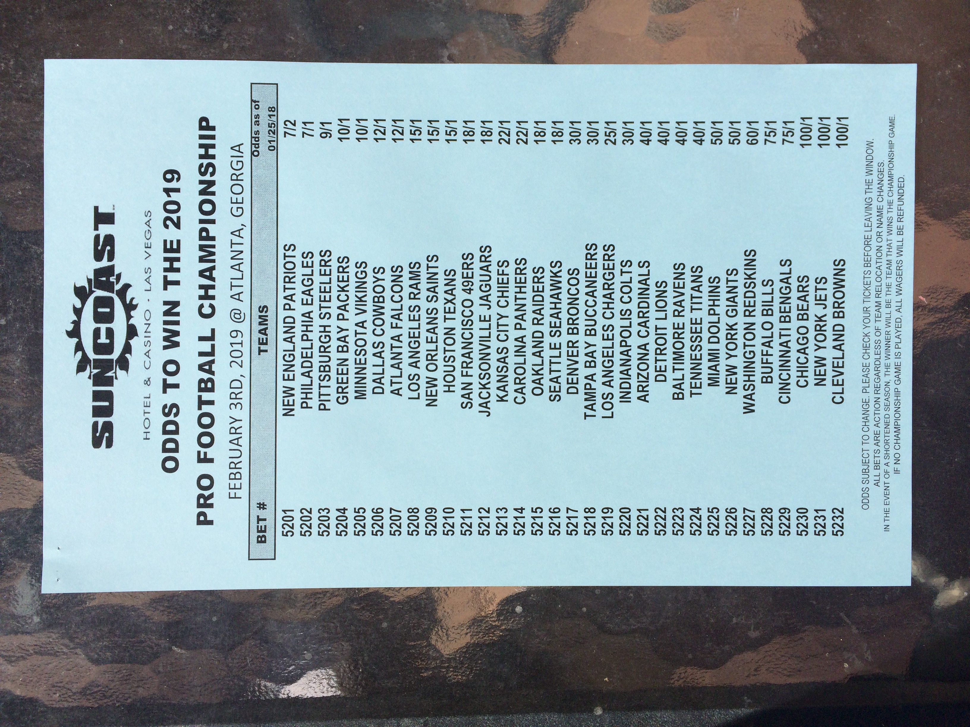 Ниже представлены фотографии всех страниц с ставками на исходы матчей в нескольких букмекерских конторах Лас-Вегаса. Эти листы были собраны 27 января 2018 года, за восемь дней до игры.