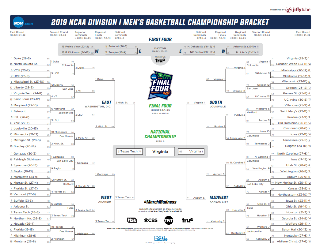 64 команды разделены на четыре конференции: Северную, Южную, Западную и Восточную, по 16 команд в каждой. Каждая команда в каждой конференции получит свой «посев» от 1 до 16, который призван оценить их уровень, хотя это и несовершенный метод. Далее произойдет следующее: