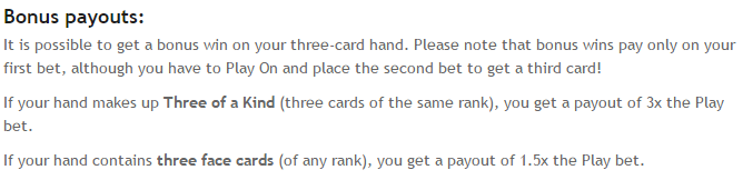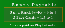 - Игроку выплачивается бонус за следующие комбинации карт. Эти бонусы выплачиваются независимо от того, какая комбинация карт была у дилера.