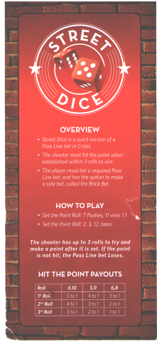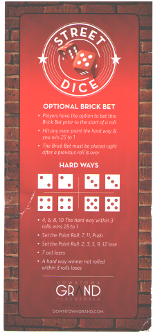 Street Dice — это игра в кости, дебютировавшая в казино Downtown Grand в Лас-Вегасе 16 мая 2014 года. Ее можно условно описать как упрощенную версию крэпса , где делается всего две ставки, а для определения ставки требуется максимум четыре броска. В Grand игра ведется на открытом воздухе, а кости бросаются внутрь трехгранного деревянного ящика, раскрашенного под переулок.