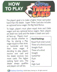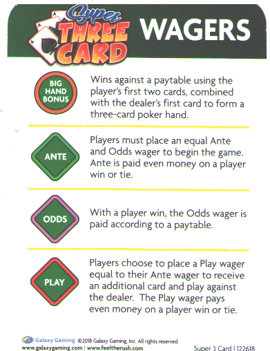 В игре Super Three Card используется структура ставок, аналогичная Ultimate Texas Hold 'Em , но с тремя картами, как в Three Card Poker . Но это еще не все: в игру играют с колодой из шести или восьми карт. Вся заслуга принадлежит Galaxy Gaming за попытку внедрить что-то новое. Я впервые увидел эту игру в казино Rampart в Лас-Вегасе 28 января 2019 года.