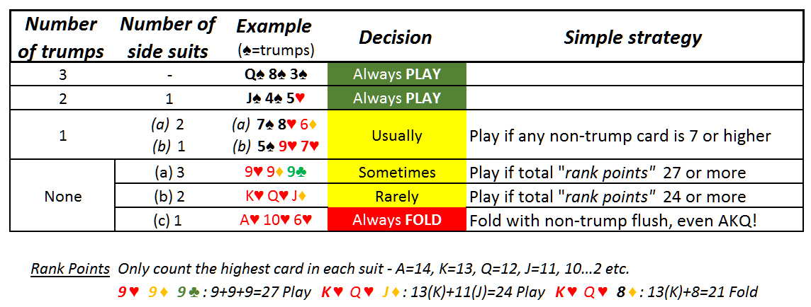 Примечание: при оптимальной игре решение иногда основывается на точном ранге вашего козыря. Вместо того чтобы говорить «n-й по старшинству козырь», в таблице предполагается, что открытая козырная карта — это двойка. Таким образом, в таблице ниже тройка — это 12-й по старшинству (или самый младший) козырь слева, а туз — самый старший (или 12-й по младшему). Поэтому корректируйте свое решение в зависимости от фактического ранга открытой козырной карты.