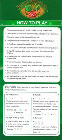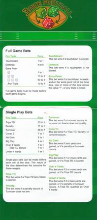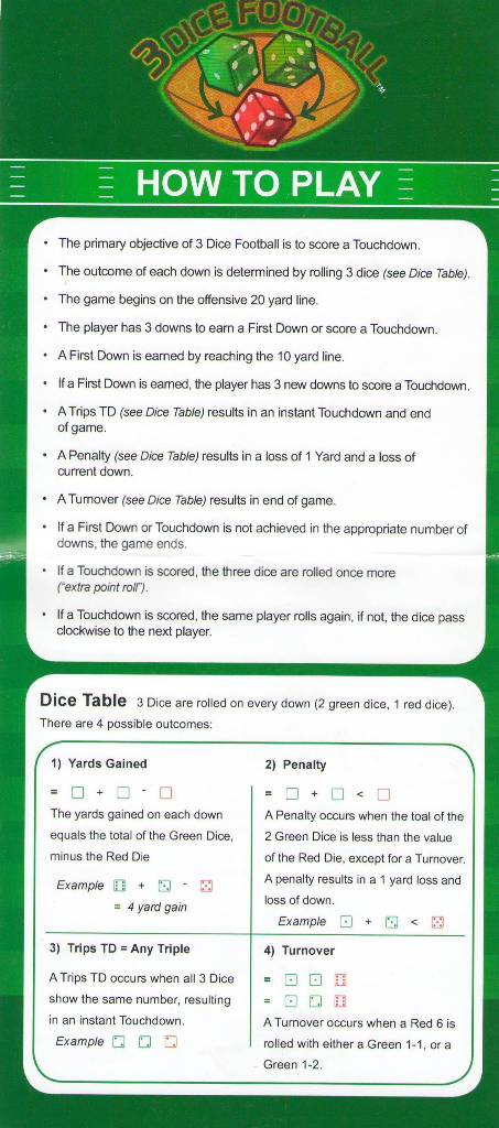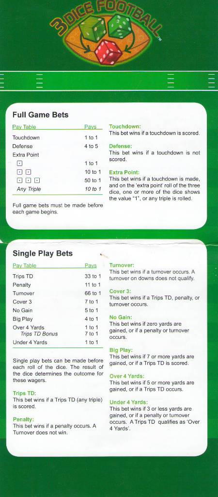 Игра «3 Dice Football» — это новая игра, которую я заметил в магазине O'Shea's 2 апреля 2011 года. Игра имитирует американский футбол с использованием трёх игральных костей. Игрок может делать ставки на то, что определённое владение мячом приведёт к тачдауну или потере мяча, а также делать множество дополнительных ставок на каждый бросок. Это, безусловно, новая концепция, и я должен отдать должное изобретателю за попытку сделать что-то необычное, в отличие от обычных вариантов блэкджека и покера.Правила