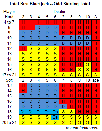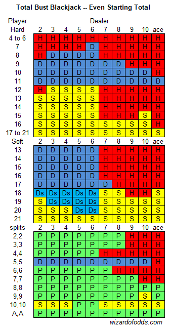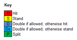 Стратегия зависит от того, с какой суммой очков игрок начинает игру — с нечётным или чётным числом. Следующая таблица предназначена для чётных стартовых рук, а следующая — для нечётных. В обеих таблицах предполагается, что дилер останавливается на «мягкой» 17 и проверяет наличие блэкджека.