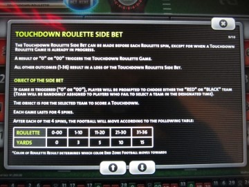 «Тачдаун в рулетке» — это дополнительная ставка в некоторых электронных рулетках от Interblock . Если игрок делает дополнительную ставку, и шарик останавливается на нуле или двойном нуле, то игрок играет в симулированную футбольную игру, основанную на четырех вращениях рулетки. Полные правила и вероятности указаны ниже.