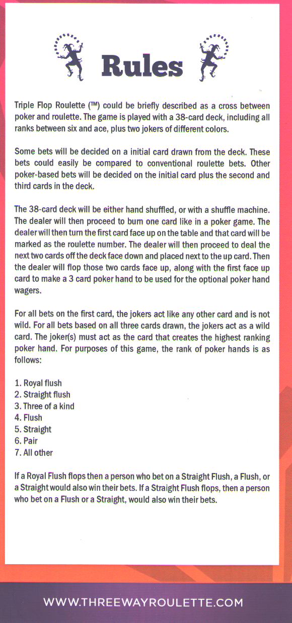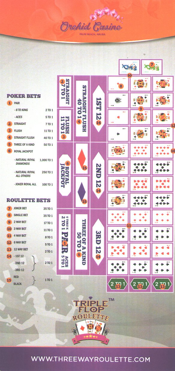 Рулетка с тройным флопом — это нечто среднее между покером и рулеткой. Изначально она предназначалась для таких рынков, как Калифорния и Оклахома, где игра в рулетку с колесом запрещена. Однако она нашла свое место в казино Orchid на Арубе.