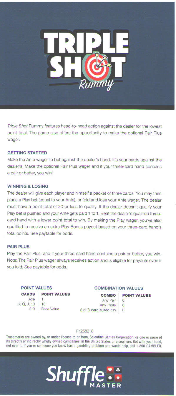 Впервые я увидел Triple Shot Rummy на выставке Global Gaming Expo 2015. Насколько мне известно, его дебют в казино состоялся в казино Rampart в Лас-Вегасе 11 февраля 2016 года. За исключением изменения дополнительных ставок, это та же самая игра, что и Vegas Three Card Rummy , в которую уже много лет играют в некоторых интернет-казино. Правила похожи на Three Card Poker, за исключением того, что подсчет очков в раздаче значительно отличается.