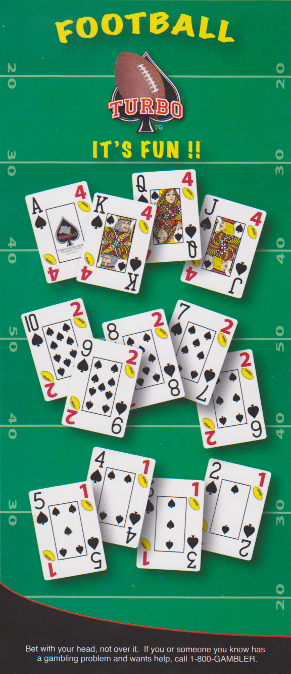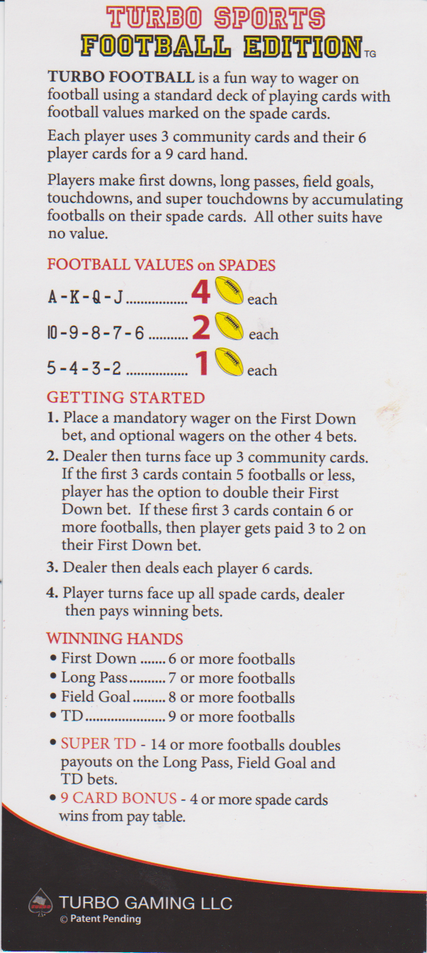 Turbo Football — это карточная игра, которую я заметил в отеле Stratosphere в Лас-Вегасе 4 октября 2016 года. Правила немного сложно объяснить, но после нескольких раздач они становятся очень простыми. Для новой настольной игры она также предлагает сравнительно низкое преимущество казино на большинстве ставок.