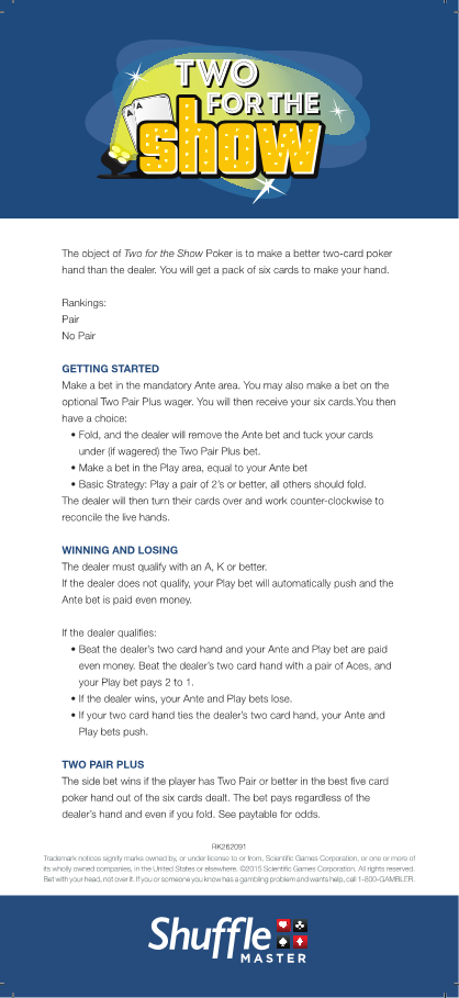 Впервые я увидел игру Two for the Show в отеле Excalibur в Лас-Вегасе 11 августа 2016 года. Судя по названию, можно подумать, что это продолжение игры One for the Money . Однако я вижу мало общего с этой игрой. Вместо этого она очень похожа на Three Card Poker .