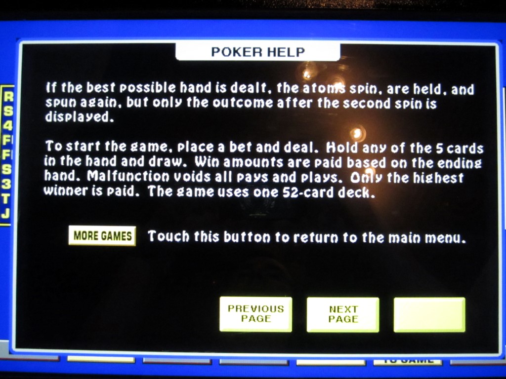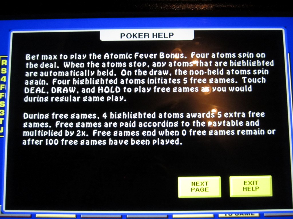 «Атомная лихорадка» — это разновидность видеопокера, которую я заметил в баре Лас-Вегаса в марте 2014 года. Игра похожа на обычный видеопокер, но с бонусной функцией. За шестую монету игрок получает шанс выиграть бонус в виде бесплатной игры. Для получения бонуса необходимо активировать (или выделить) четыре атома.