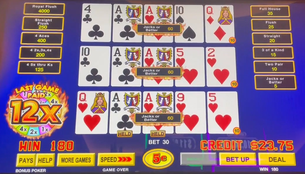 Ни одна из раздач не улучшилась. С тремя выигрышами по 5 очков за старшую пару и множителем 12x, мой общий выигрыш составил 5×3×12 = 180 кредитов.