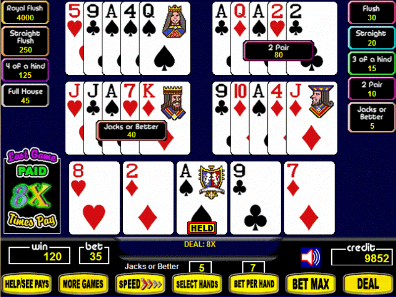 На изображении выше я выиграл с множителем 8x, поэтому мой выигрыш в 5 за валеты или лучше составил 5 × 8 = 40, а за две пары — 10 × 8 = 80.
