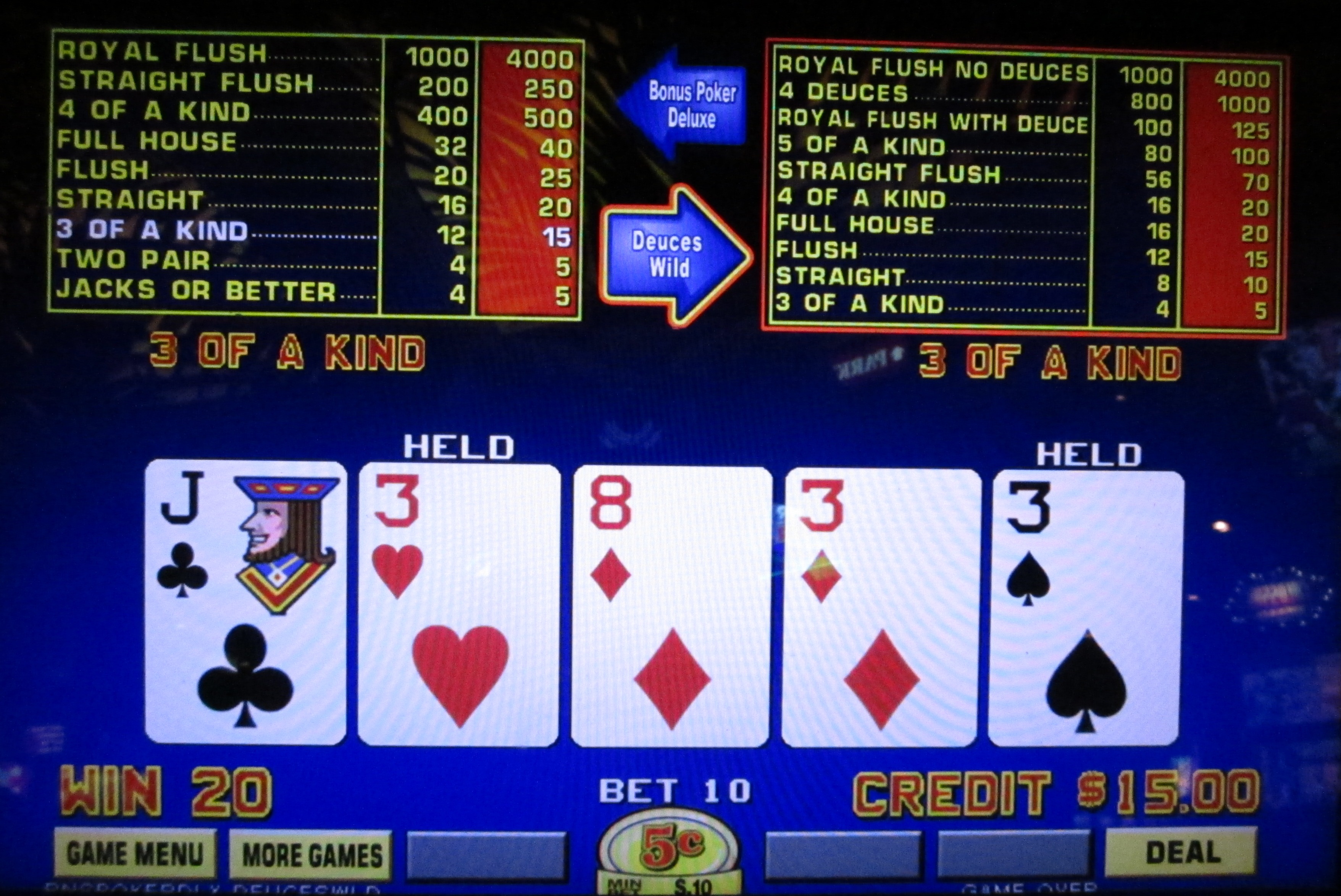 В раздаче выше у меня была тройка против обеих таблиц выплат. За таблицу выплат Bonus Poker Deluxe слева мне выплатили 15 монет. За таблицу выплат Deuces Wild справа мне выплатили 5 монет. Общий выигрыш составил 15 + 5 = 20 монет.