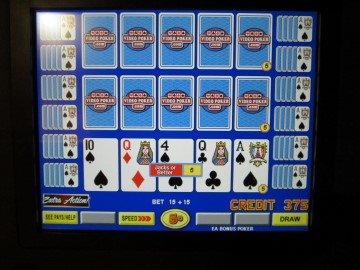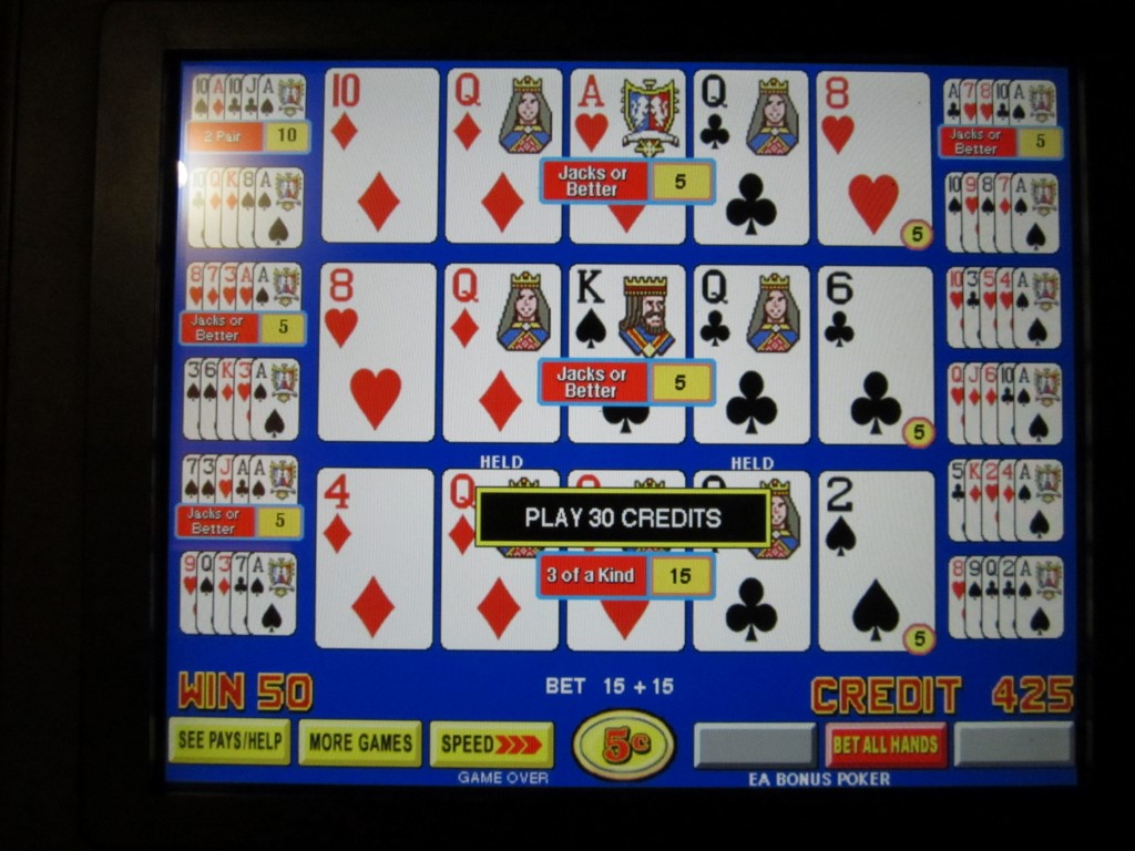 В этом примере я сделал ставку в 30 кредитов. 15 кредитов были предназначены для трех раздач обычного видеопокера Triple Play по 5 кредитов за каждую. Остальные 15 кредитов активировали функцию Extra Draw, добавив 12 дополнительных раздач.