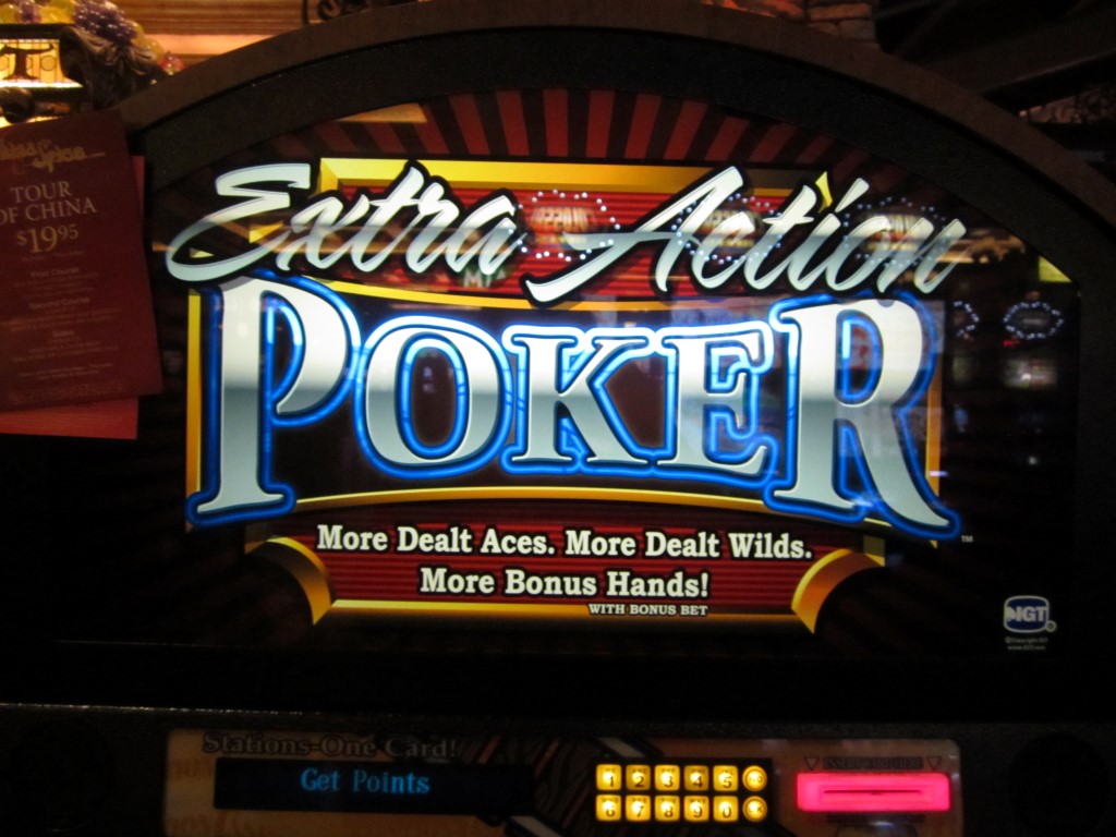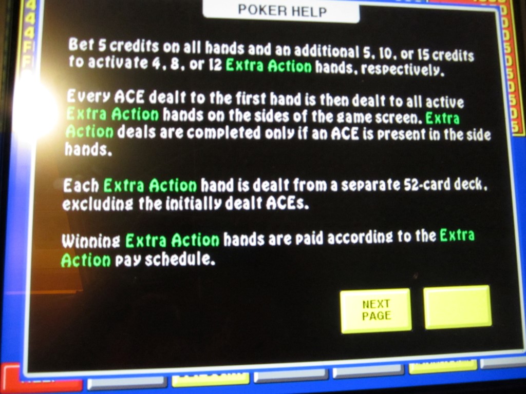 Extra Action Poker — это разновидность видеопокера, которую я заметил на ранчо Грин Вэлли 23 февраля 2014 года. Игра проходит как обычный видеопокер, за исключением того, что при дополнительной ставке игрок получает бонусные комбинации, если у него выпадает хотя бы один туз (или двойка в играх с двойками). Ниже приведены полные правила.