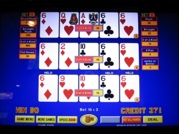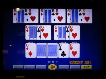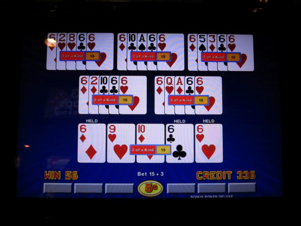 Я играл в видеопокер с тройной игрой, ставя по шесть монет за раздачу, чтобы активировать функцию, на общую сумму 18 кредитов. Через некоторое время мне раздали три шестерки. Затем игра быстро перешла к следующему экрану с функцией. Вы можете увидеть в общей сложности шесть раздач. Три из них — это те, за которые я заплатил, а остальные три — это раздачи Extra Draw.