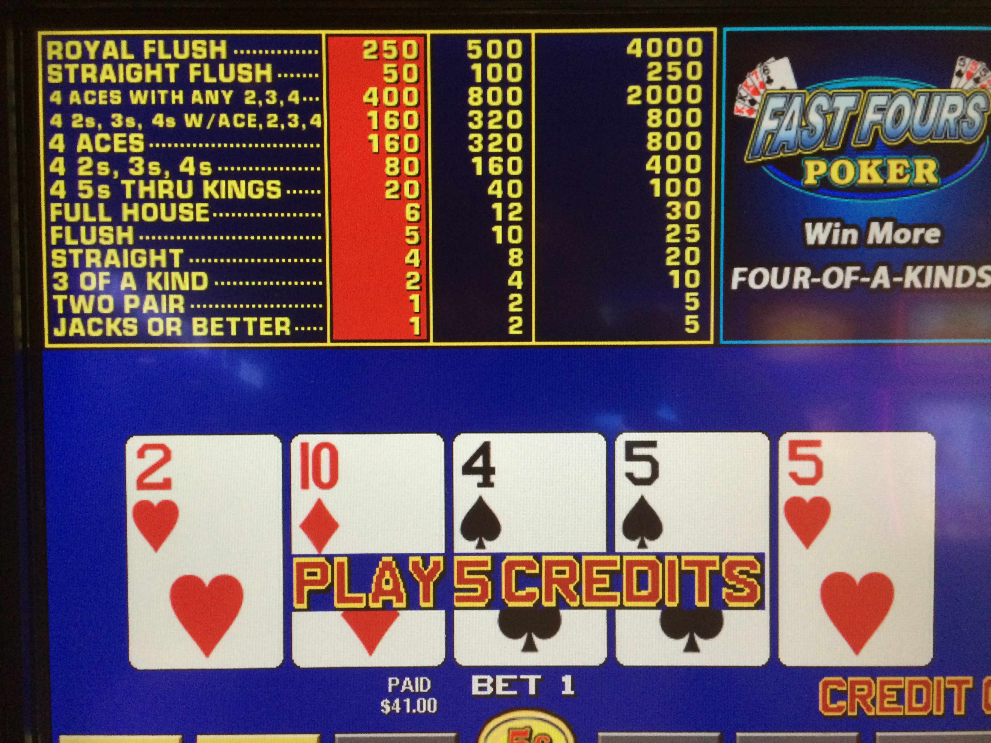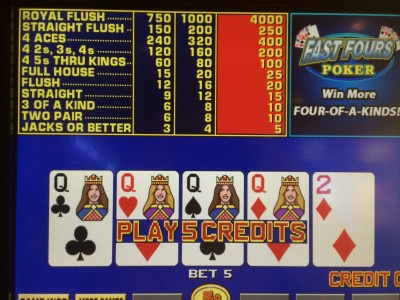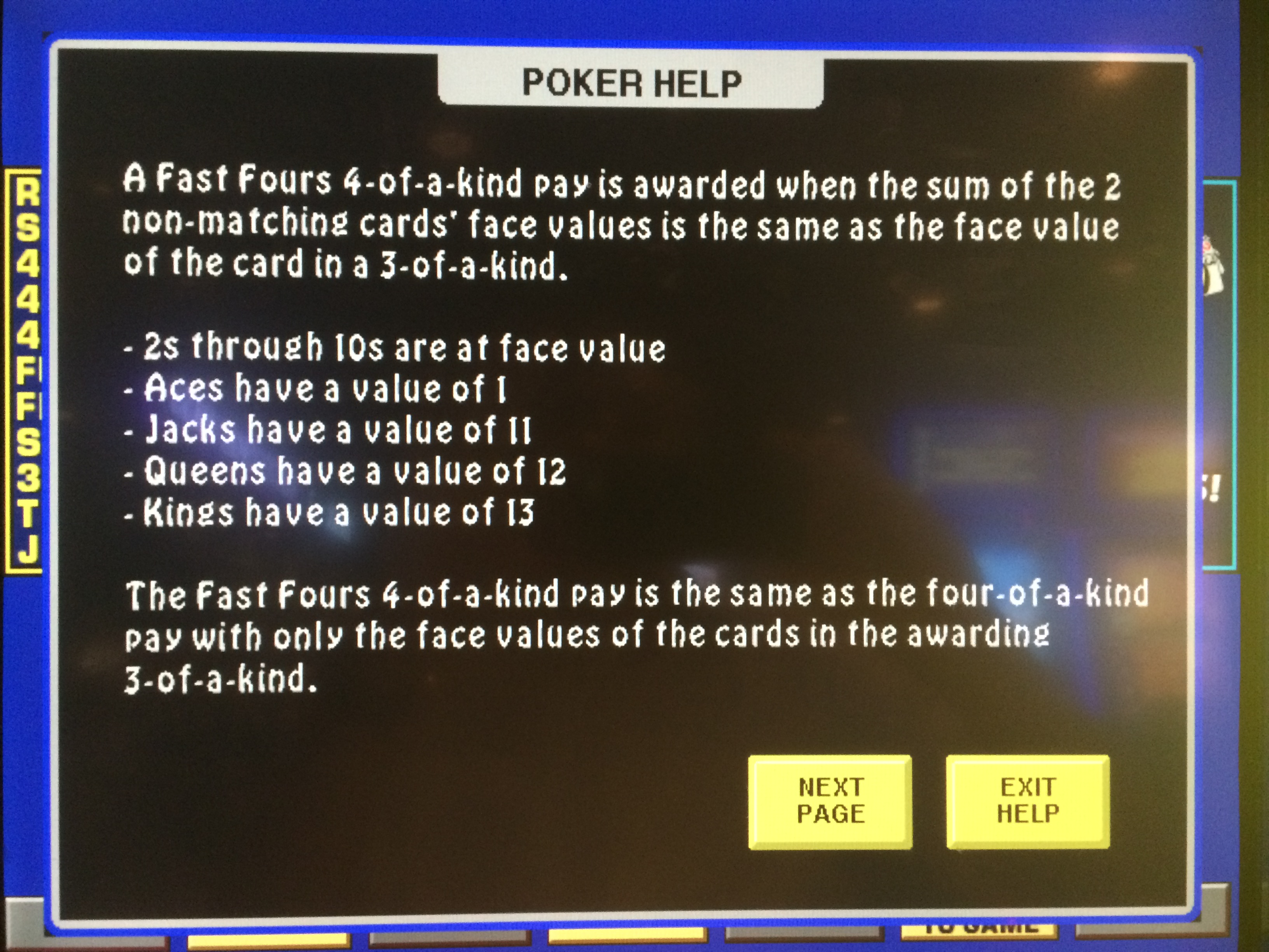 Fast Fours — это разновидность видеопокера, которую я заметил в Hard Rock в Лас-Вегасе 5 апреля 2016 года. Игра проходила на старом автомате, поэтому я предполагаю, что она существует уже довольно давно, но каким-то образом ускользнула от моего внимания. Суть игры во многом похожа на Quick Quads : если у игрока три одинаковые карты, например, 8-8-8-5-3, и сумма двух одиночных карт равна рангу три, то это считается четырьмя одинаковыми картами. Как и в Quick Quads, тузы считаются за одно очко, а значения от 2 до 10 — за очки. В отличие от Quick Quads, карты с картинками также играют роль. В частности, валет считается за 11 очков, дама — за 12, а король — за 13. Таким образом, 2JKKK будет считаться четырьмя королями. Еще одно отличие заключается в том, что в Fast Fours игроку не нужно делать шестую ставку, чтобы активировать эту функцию. Оплата производится путем понижения уровня в таблице выплат.