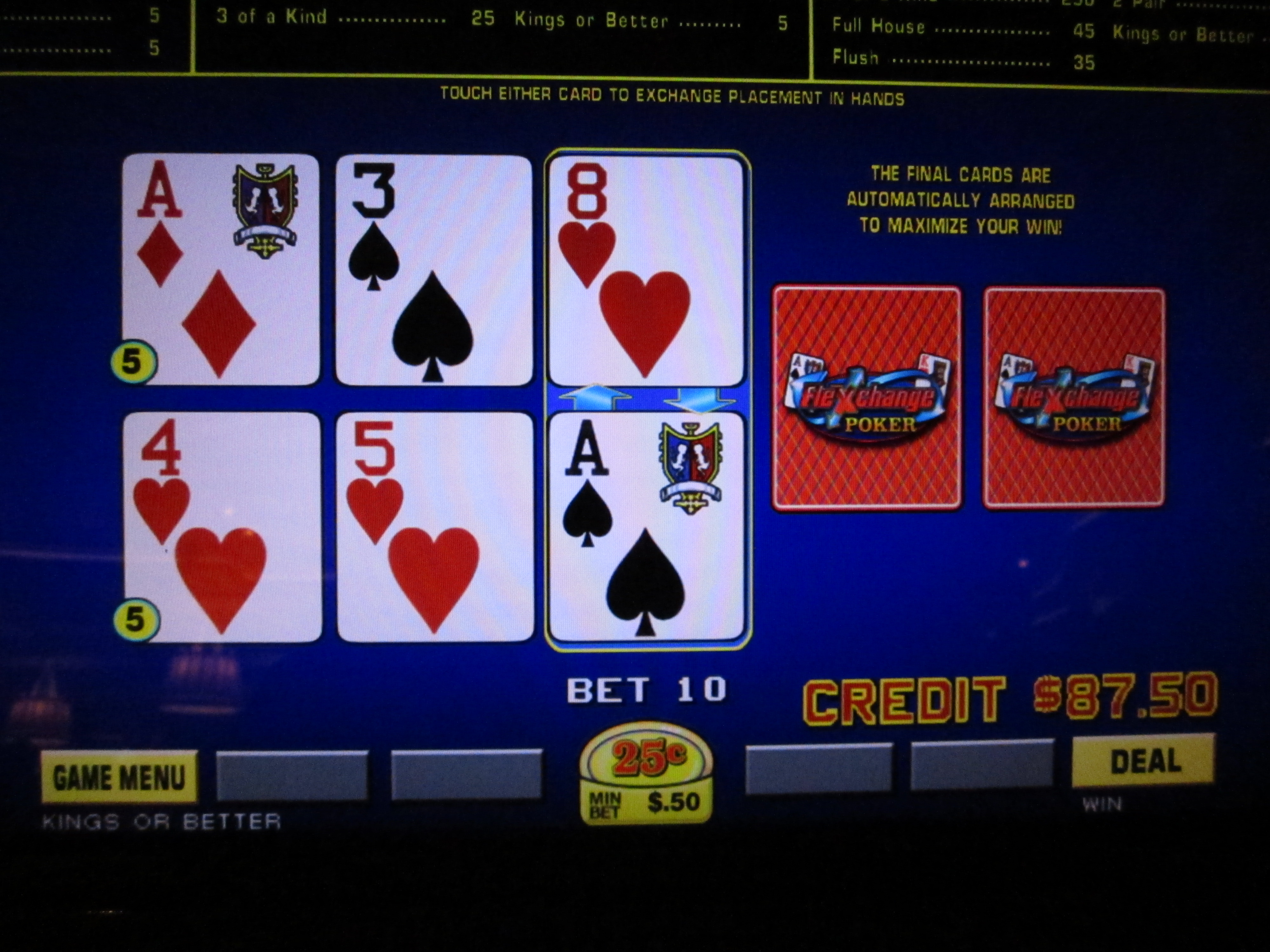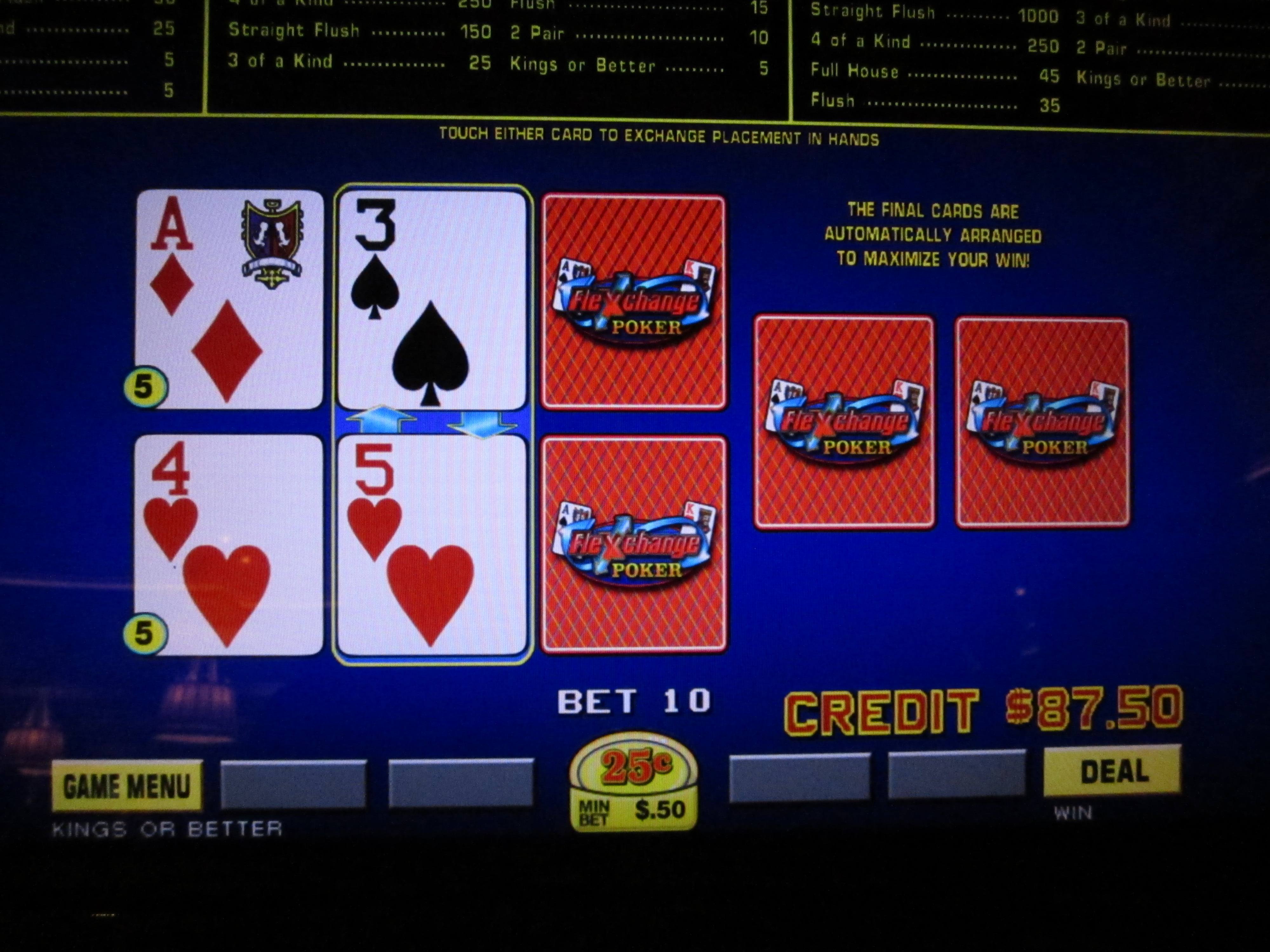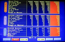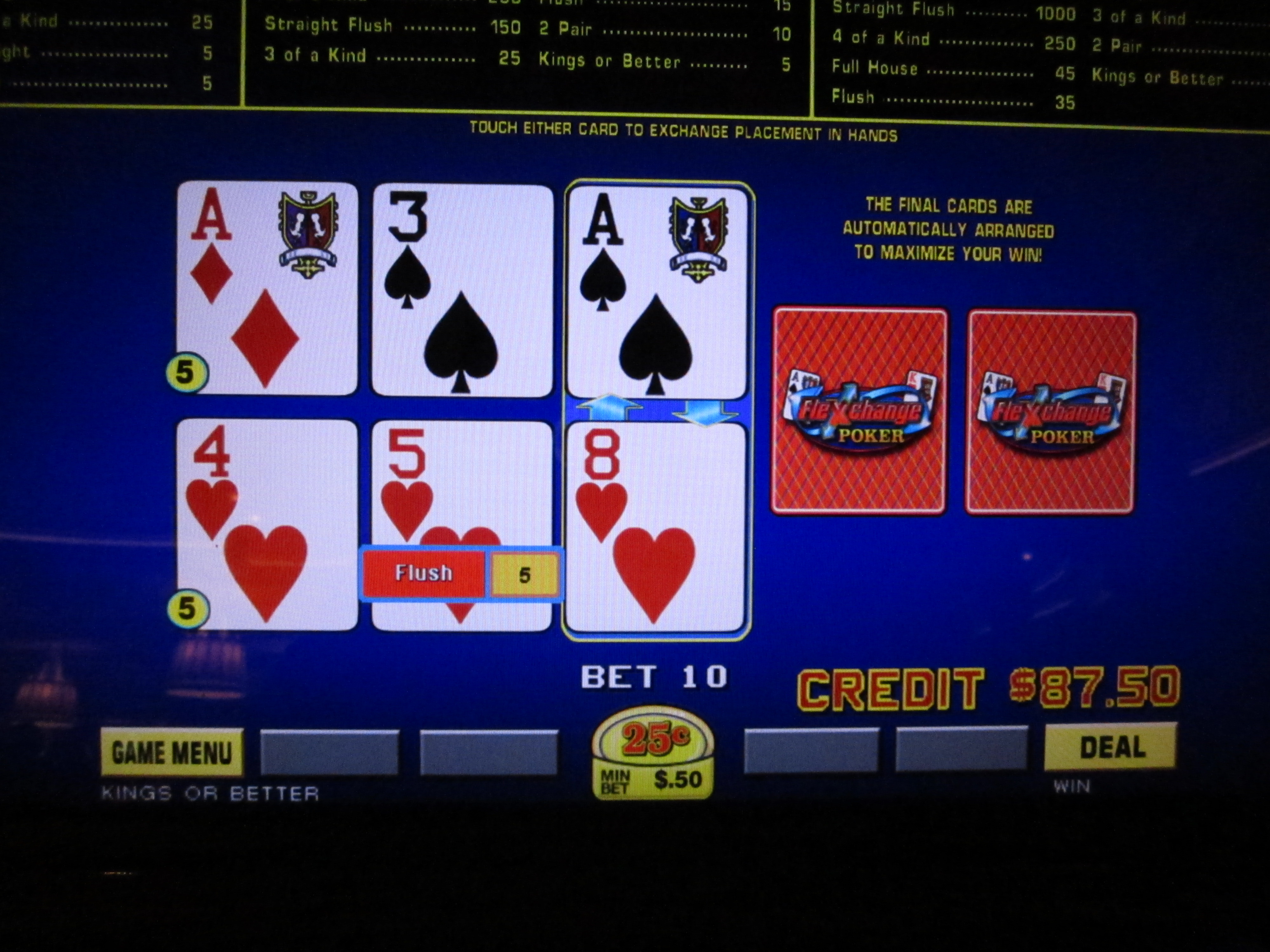 Я снова решил поменять карты, получив пару в верхней руке и флеш в нижней. За флеш из трех карт мне выплатили пять кредитов.