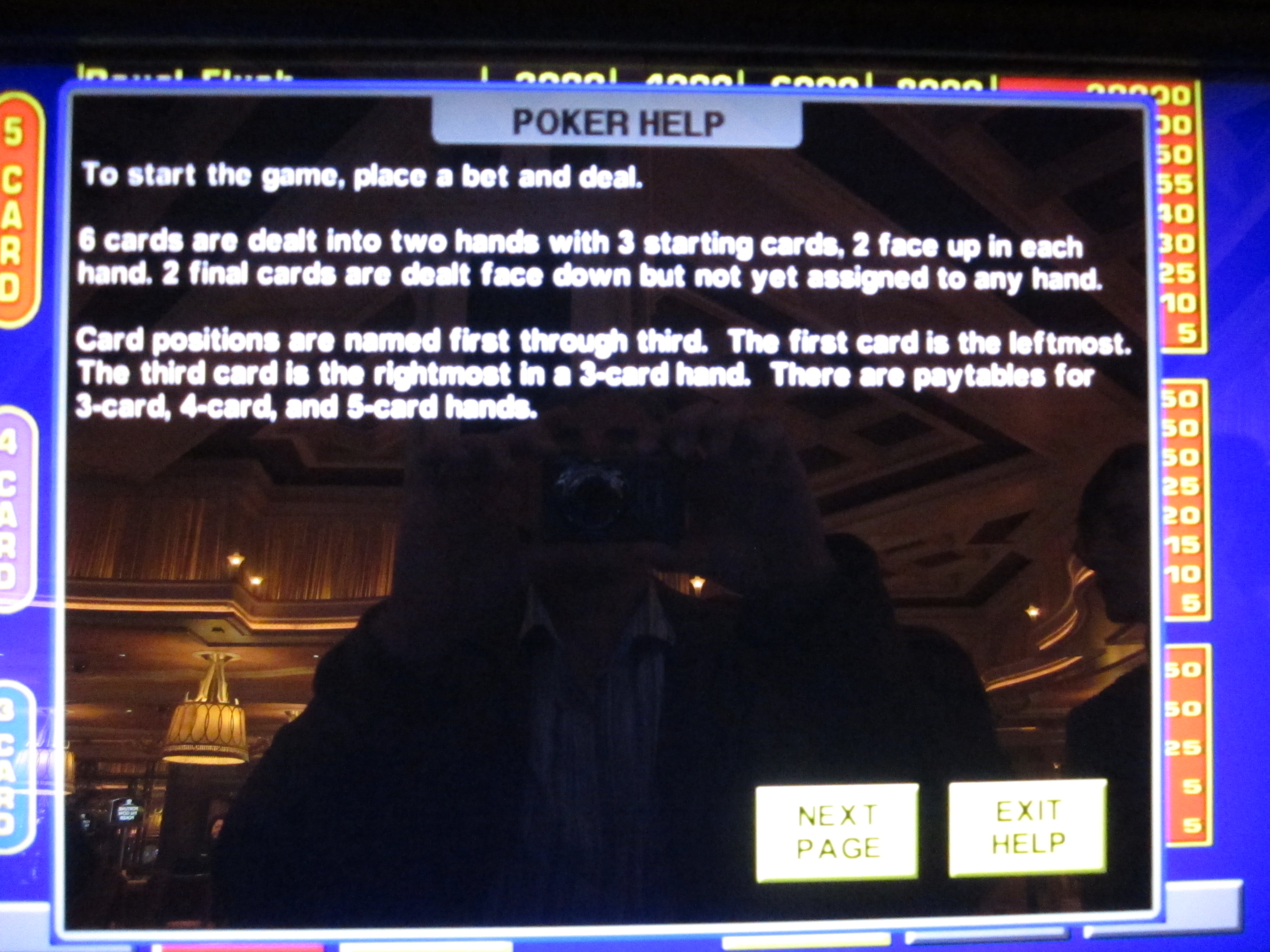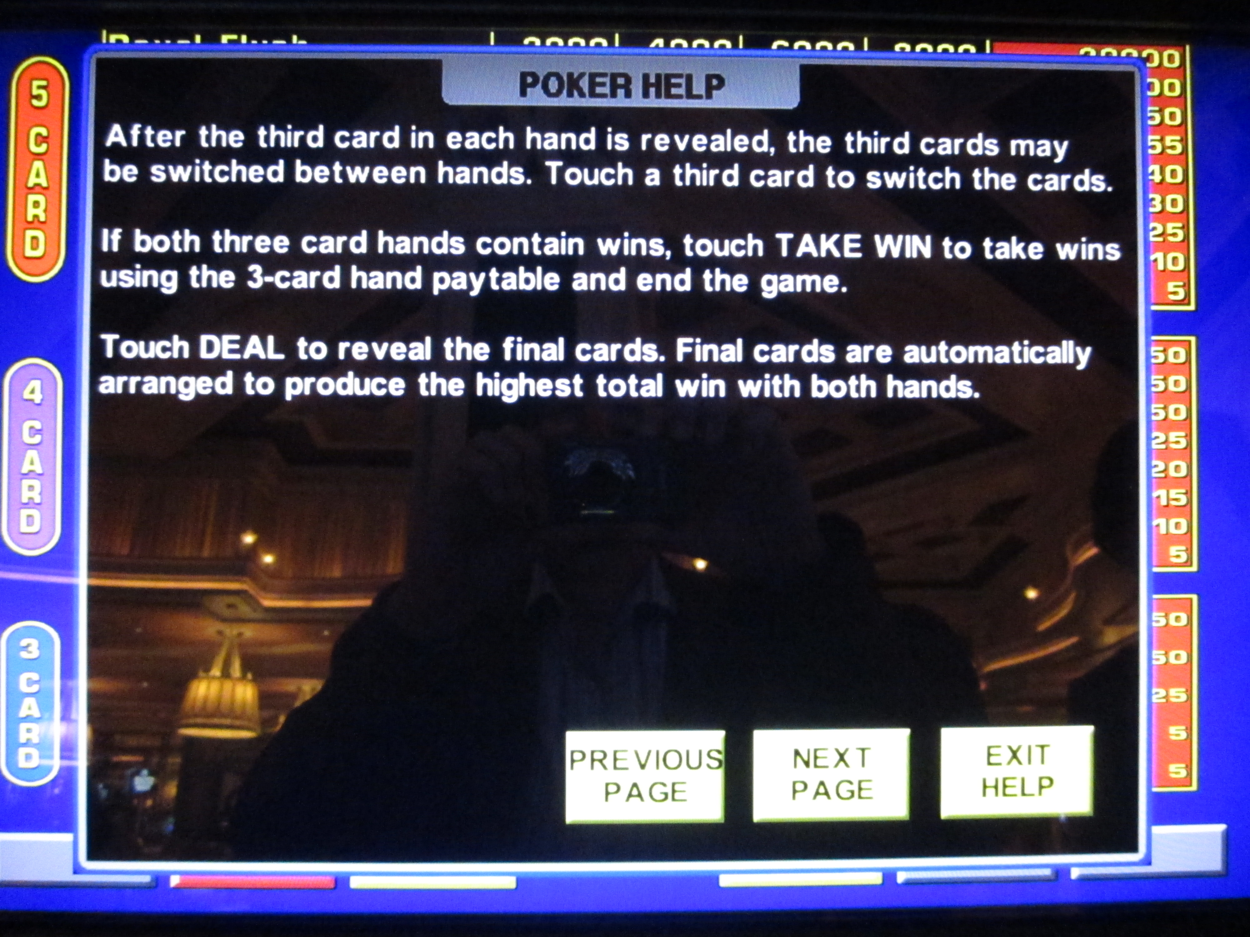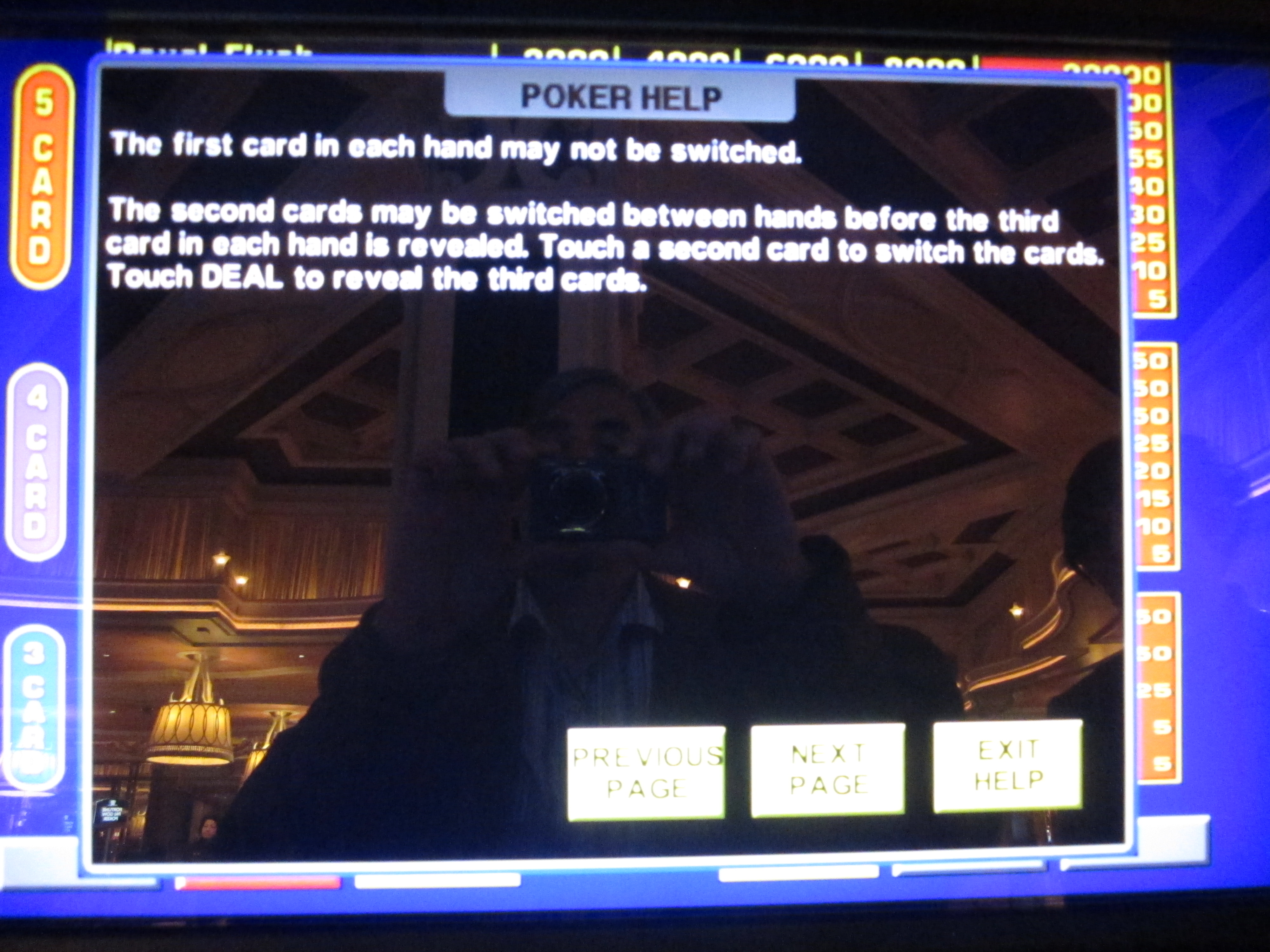 Я снова решил поменять карты, получив пару в верхней руке и флеш в нижней. За флеш из трех карт мне выплатили пять кредитов.