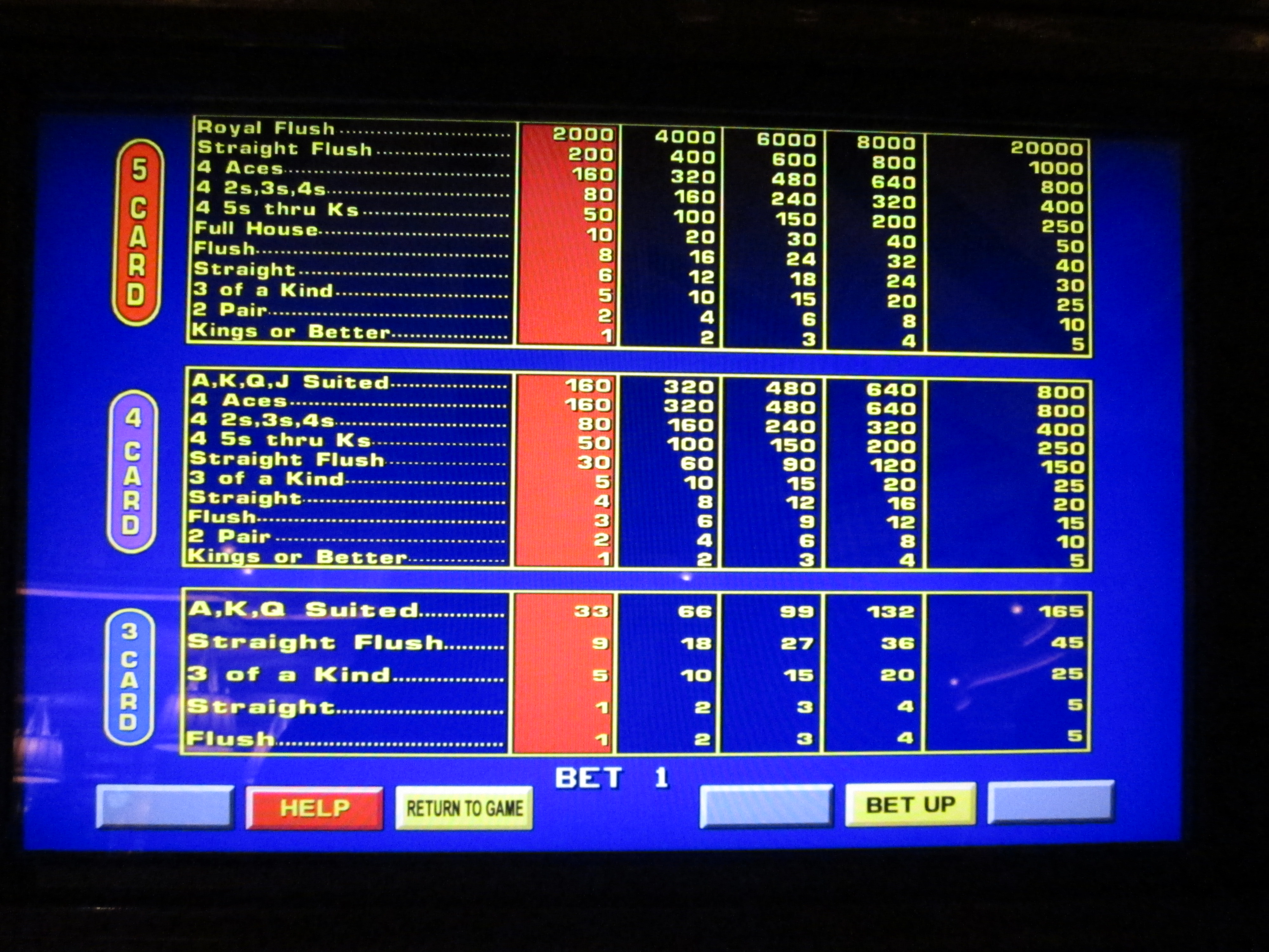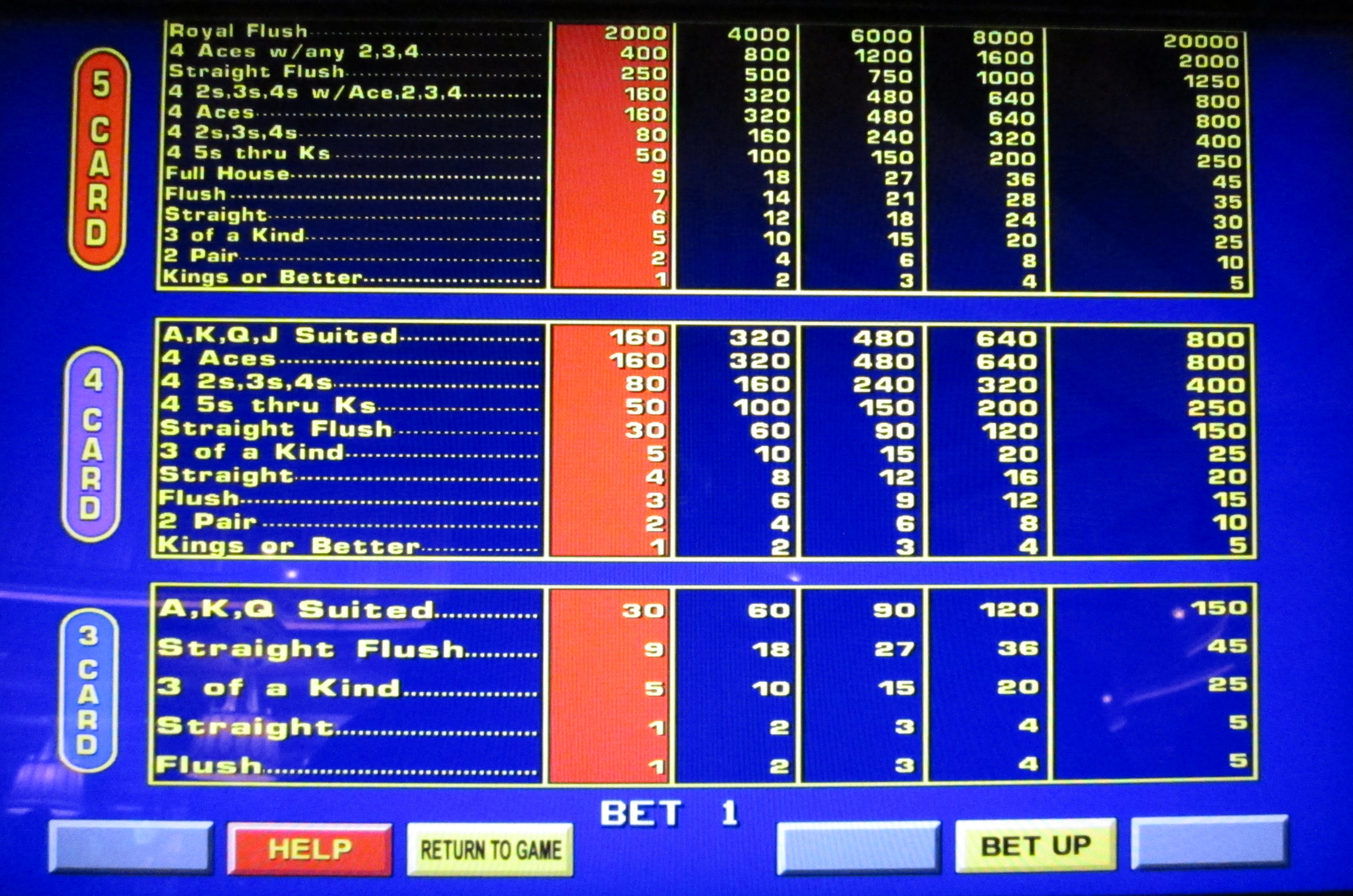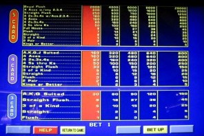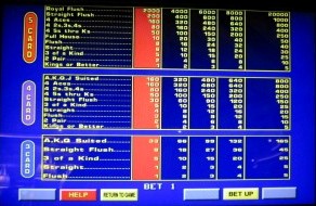 В следующих трех таблицах показана возможная таблица выплат для Double Bonus, Double Double Bonus и Kings or Better. Скриншоты были сделаны в отеле Wynn Las Vegas, где для всех ставок был установлен третий по величине лузова из четырех вариантов.