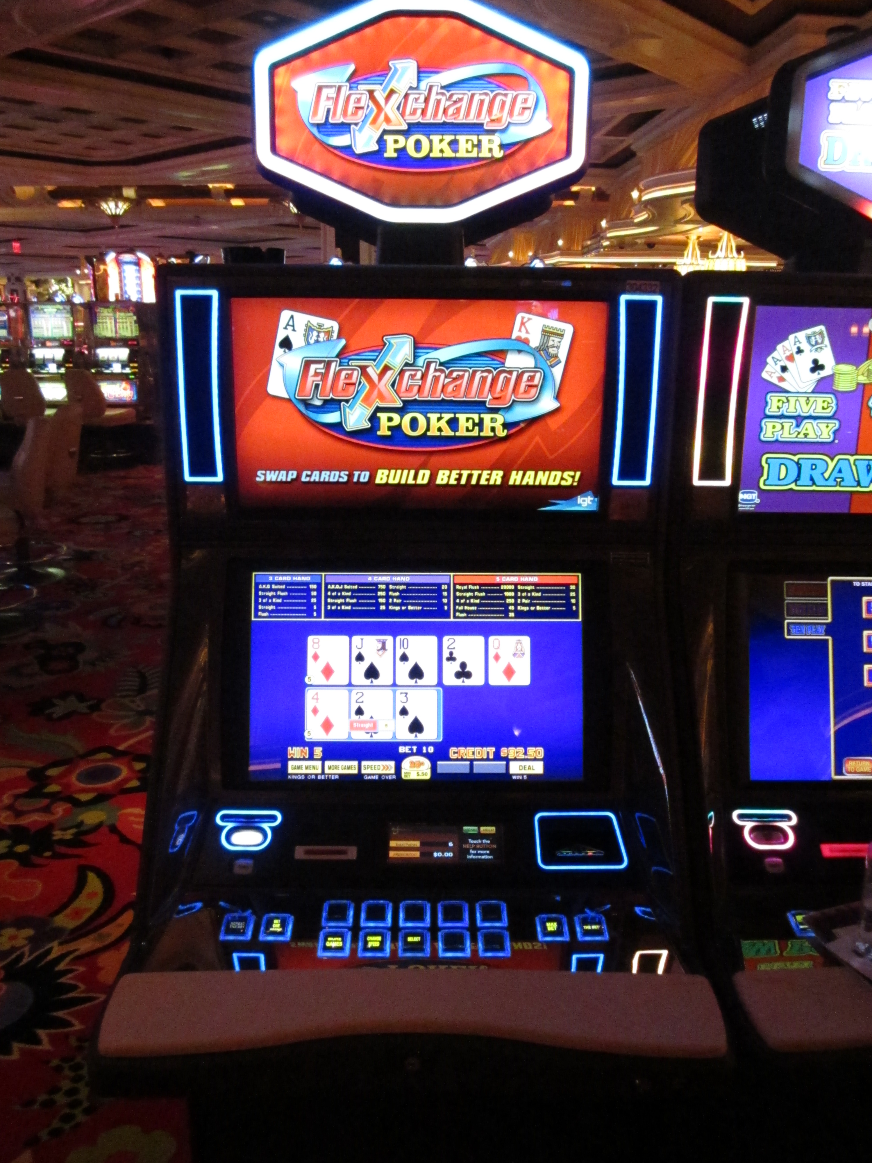 Flex Change Poker — это вариант видеопокера, который я заметил в отеле Wynn Las Vegas 5 ноября 2015 года. Суть игры заключается в том, что игрок пытается собрать две выигрышные покерные комбинации. По мере раздачи карт игрок может менять их местами между двумя комбинациями, чтобы повысить свои шансы на победу.
