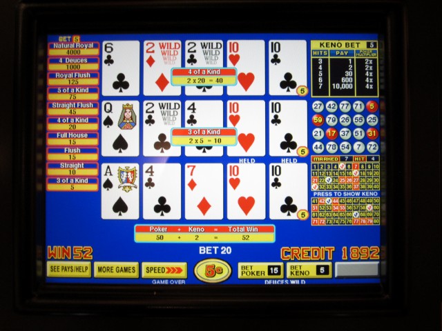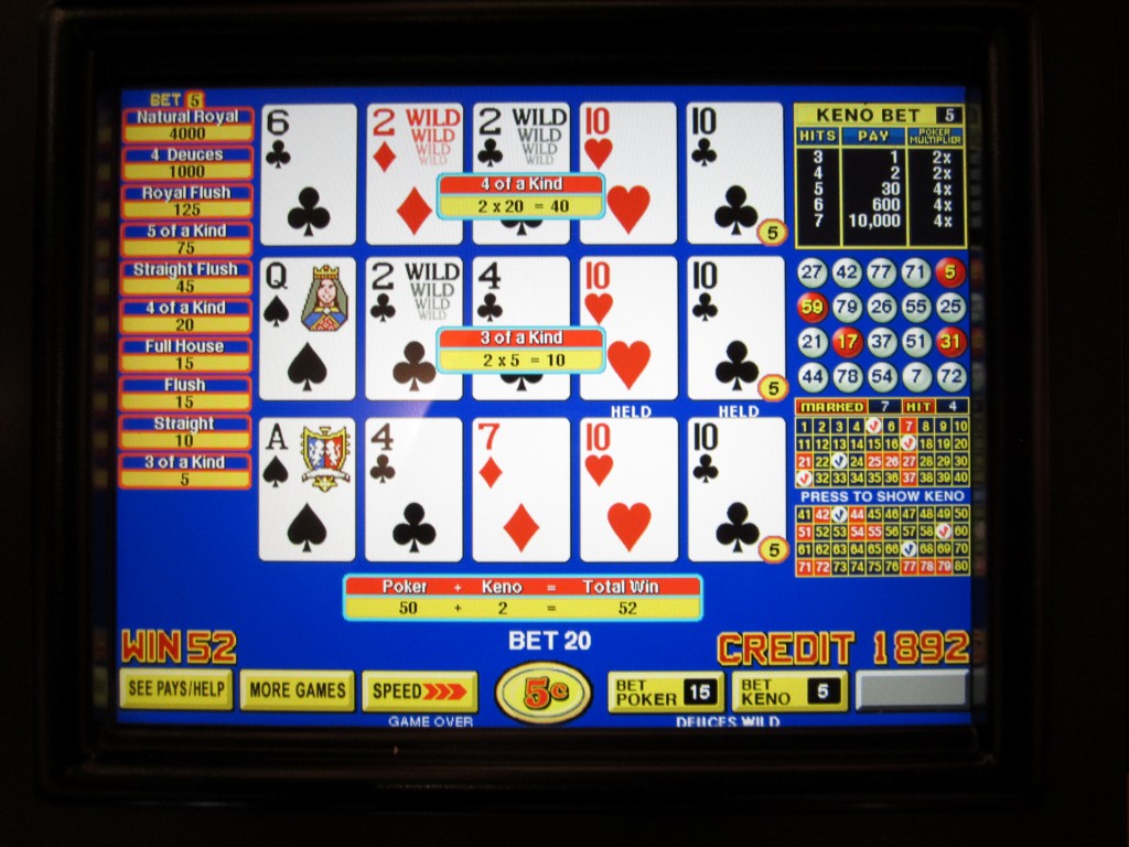 В игре, описанной выше, я поставил в общей сложности 20 кредитов: 15 на видеопокер и 5 на кено. Предварительно я выбрал семь чисел для кено. Четыре из них совпали, что сразу же принесло мне два кредита плюс множитель 2x для видеопокера.