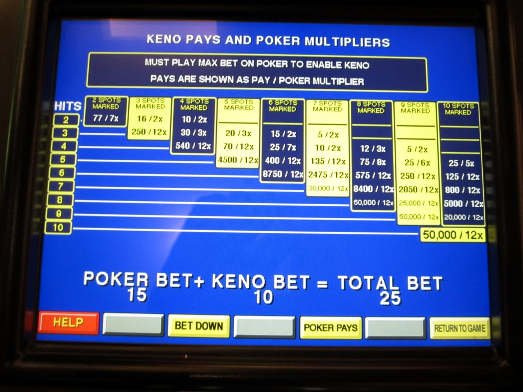 - Игрок может выбрать обычную игру в видеопокер, сделать дополнительную ставку в кено в размере 5 кредитов или дополнительную ставку в кено в размере 10 кредитов. Дополнительная ставка была доступна только в том случае, если игрок также сделал полную ставку в видеопокере в размере 15 кредитов (пять кредитов за каждую из трех линий).