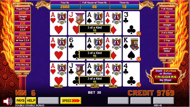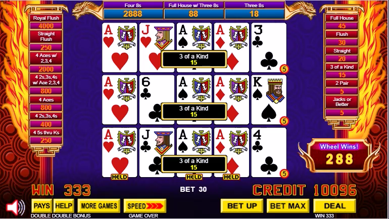 - Фулл-хаус с тремя восьмерками приносит в сумме либо 18, либо 28, в зависимости от конкретной таблицы выплат.