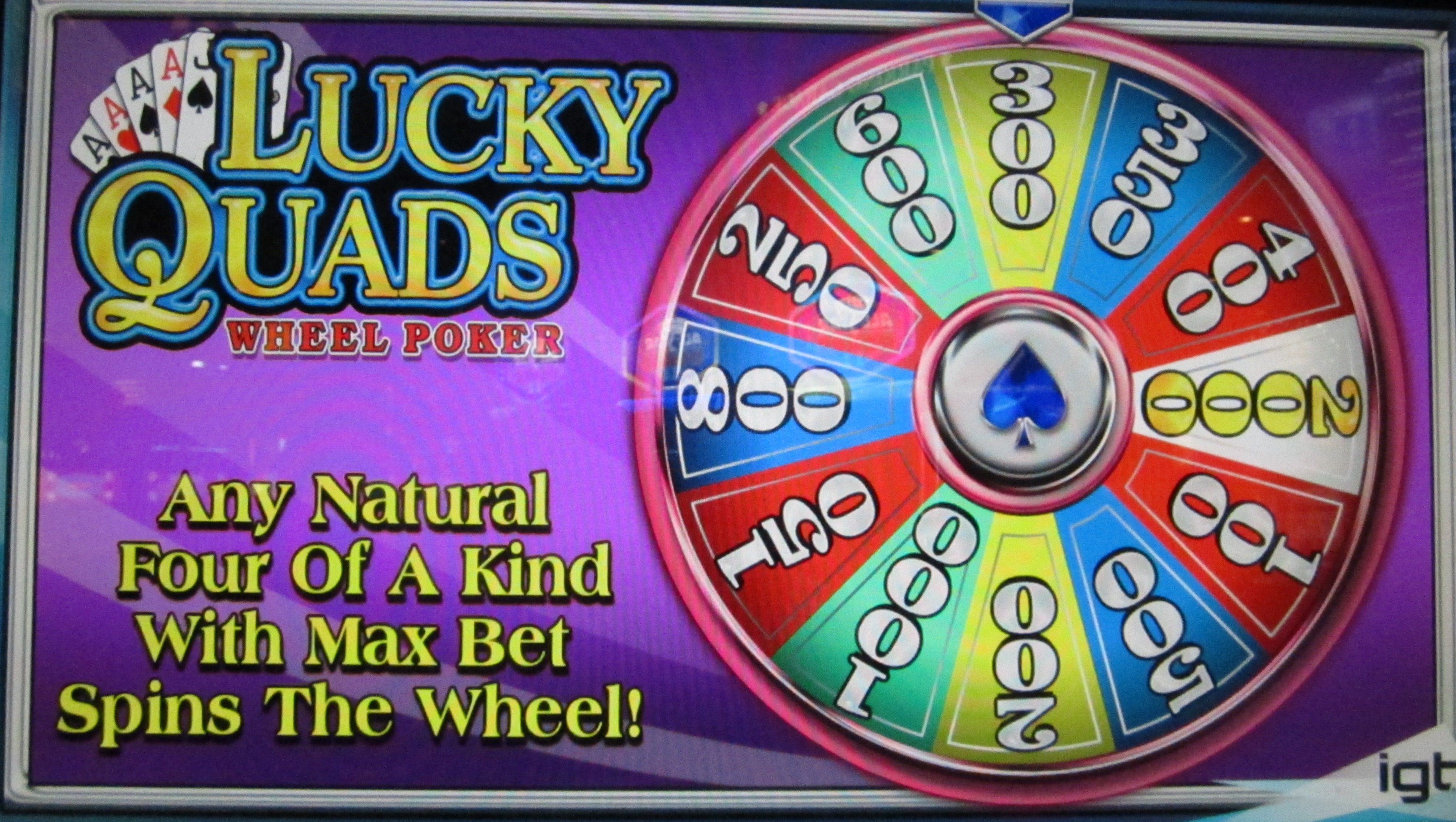 Lucky Quads Wheel Poker — это простой вариант видеопокера, в котором за каждую выпавшую на рулетку четыре одинаковые карты игрок получает вращение колеса призов. Для активации этой функции игрок должен заплатить одну монету в дополнение к своей стандартной ставке в пять монет.