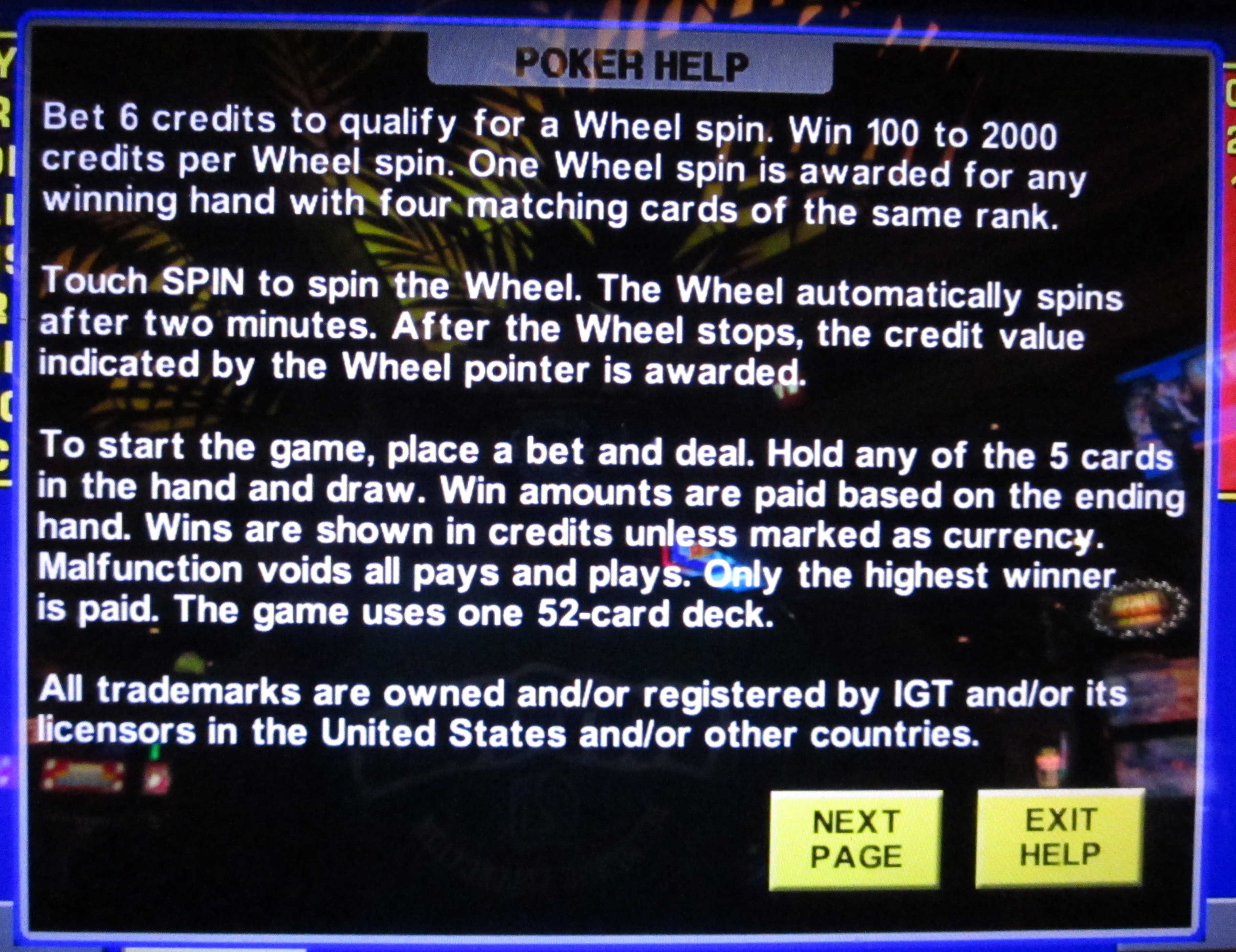 Вступление говорит само за себя — игра проходит как обычный видеопокер с одной линией ставок, первые пять монет — это ставка. За шестую монету игра вращает призовое колесо за любую естественную каре, выпавшую при раздаче.