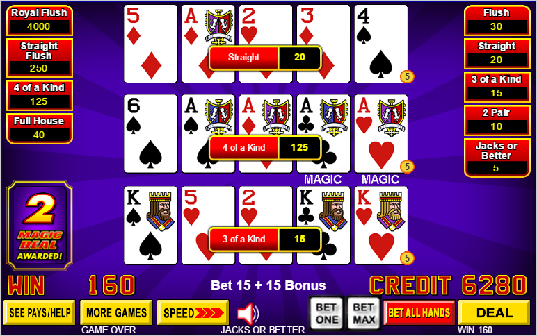 - Функция Magic Deal может работать как обычный видеопокер с тремя, пятью или десятью игроками. Кроме того, если игрок вносит комиссию, равную общей сумме ставки при игре без этой функции, то активируется функция Magic Deal.